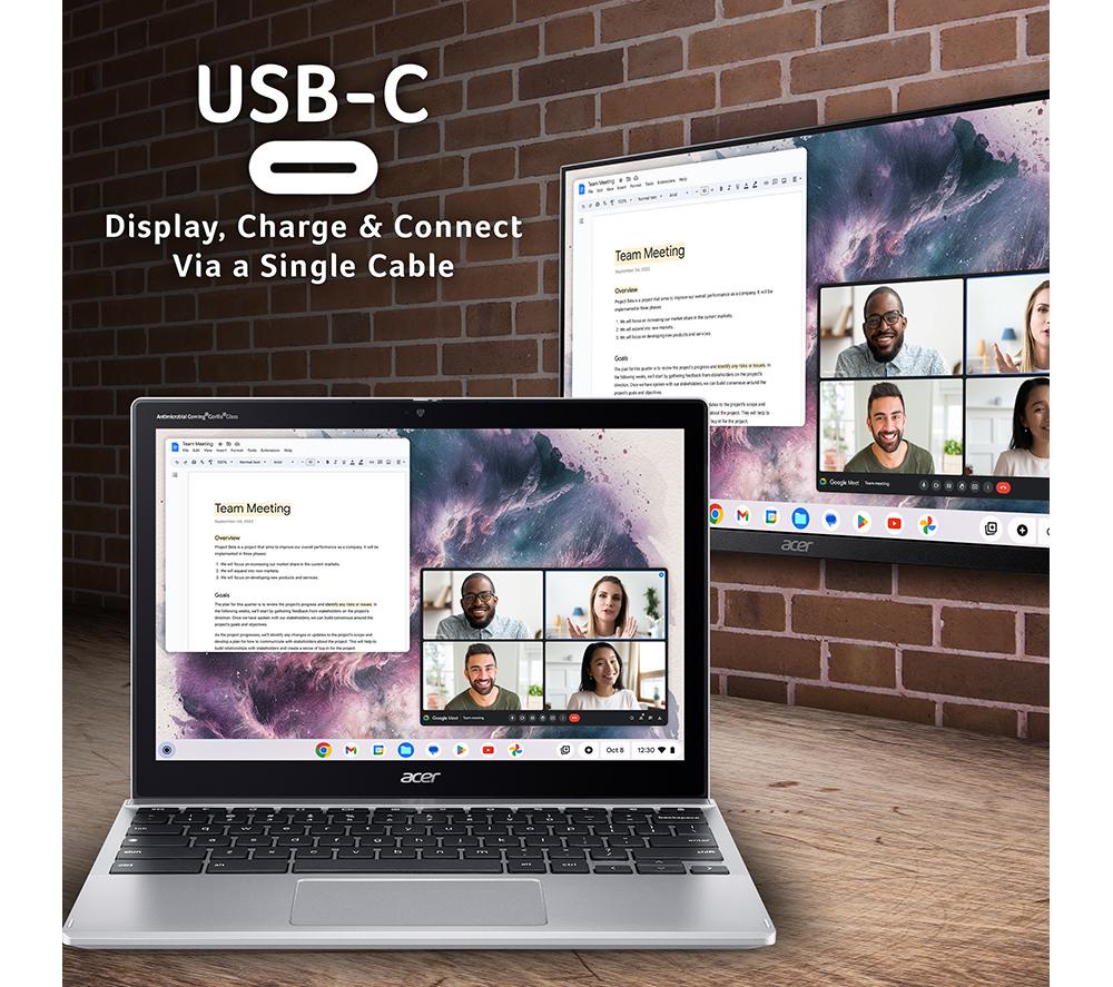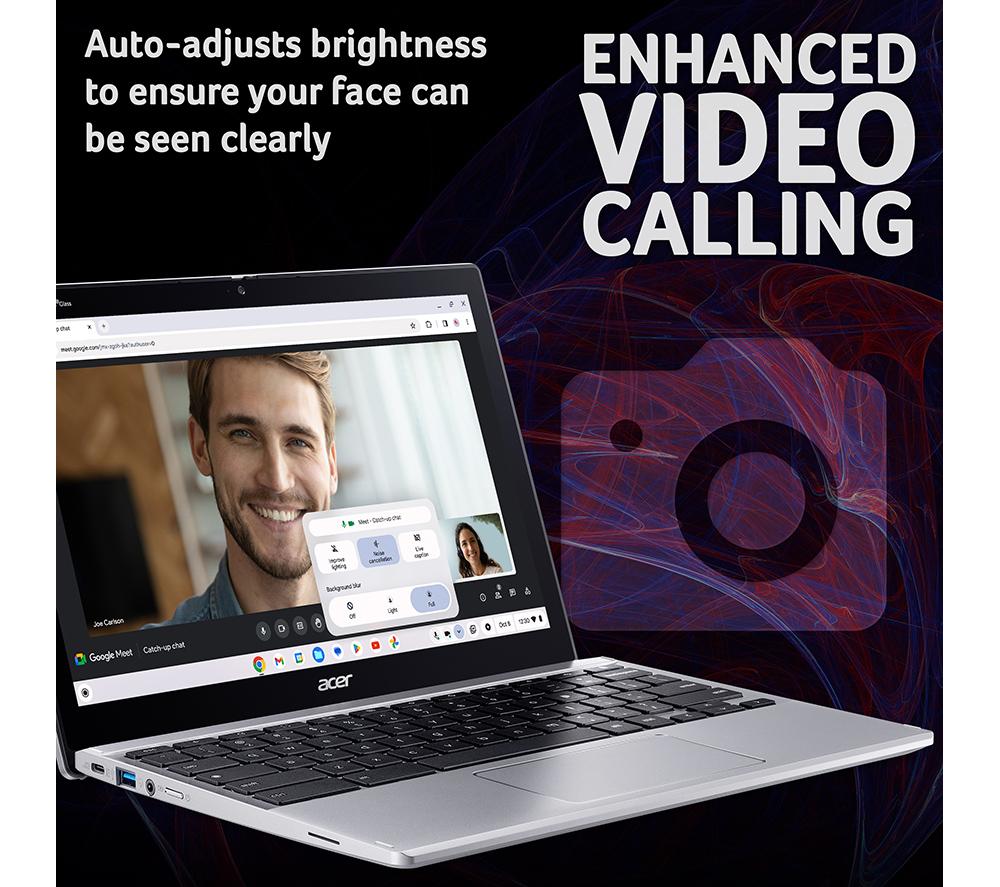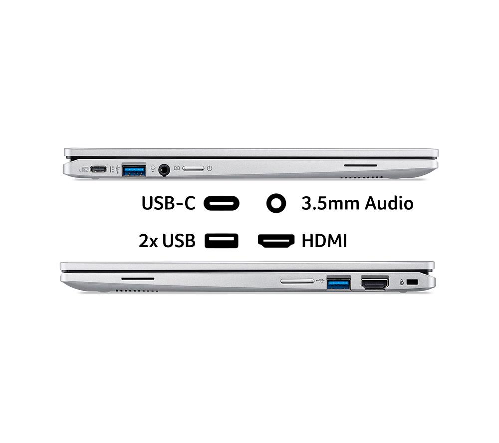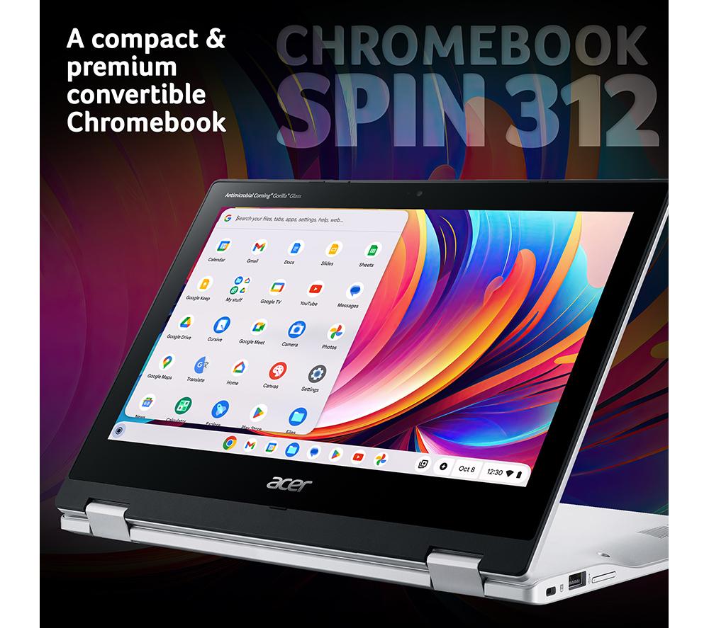 Get stuff done with the Acer Spin 312. Its 12.2" Full HD + IPS touchscreen provides amazing colours and wide viewing angles, and you can fold it 360° to turn your laptop into a tablet. Great both for work and for catching up on Netflix. It can run for up to 13 hours on a single charge, so you can leave the charging brick at home. And at just 1.29 kg, it won't weigh you down either. Good to know - ChromeOS is easy and safe to use and can run all your favourite apps from Google Play Store - The Intel® N100 processor is just right for everyday browsing, emailing and social networking - Browse, stream and download faster than ever before thanks to WiFi 6E - Starting up your laptop and multitasking will be quick with the 128 GB eMMC and 4 GB RAM - The HD webcam with temporal noise reduction will make you look great on group calls - With a USB Type-A, USB Type-C port, and an HDMI, you'll have plenty of ways to hook up accessories___________________________________________________________________________ Intel, the Intel logo, Celeron, Intel Atom, Intel Core, Intel. Experience What's Inside, Intel Inside, the Intel Inside logo, Intel Unite, Iris, Pentium, Thunderbolt, the Thunderbolt logo, and Ultrabook are trademarks of Intel Corporation in the U.S. and/or other countries.