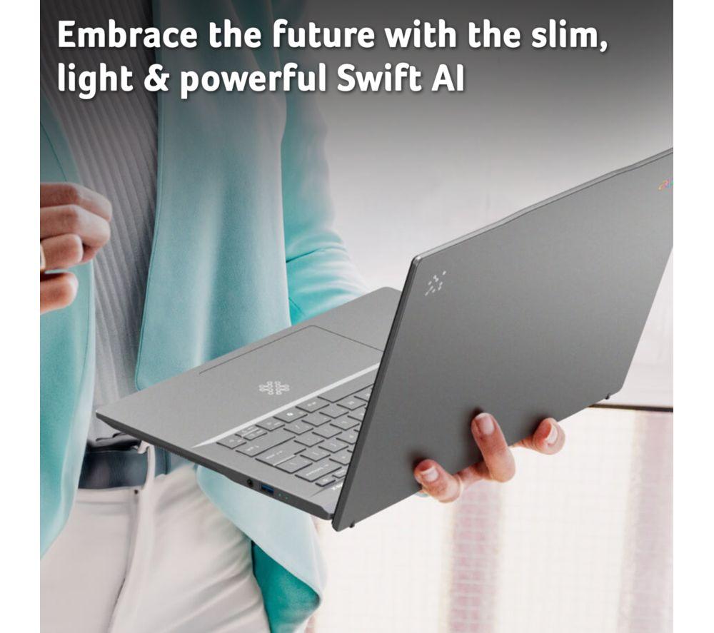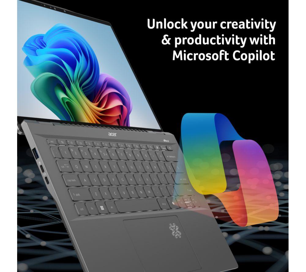 The Acer Swift 14 AI's got all sorts of clever ways to make your day run smoother. The Snapdragon X Plus processor inside is built around AI. That makes it fast, smart and efficient. So you'll have up to 26 hours on a single charge to tick those to-do boxes. And when you're done, the 2.5K screen is perfect for catching up on your favourite show. It's super sharp with amazing colours that will make the scenes pop. Plus, it's less than 15 mm thick and only weighs 1.32 kg, so you can take it anywhere. Good to know - A Copilot+ PC brings the latest AI features so you can work and create faster than ever before - Cocreator can generate amazing images based on your text prompts - With Recall, you can search for documents, emails or web pages by just describing how you remember them - Look your best on video calls with Windows Studio Effects – it can improve lighting and blur your background - With Live Captions you'll never miss a word in the video you're watching - The dedicated Copilot key is your shortcut to all Copilot AI features - The screen's got a 120 Hz refresh rate for perfectly smooth motion - With 16 GB of DDR5 RAM you can multitask like you've never multitasked before - No more typing out passwords – the Windows Hello facial recognition is much more convenient - The Quad HD webcam will make you look great on work calls and catchups with friends - Browse, stream and download faster than ever before thanks to WiFi 7 - You can hook up monitors, transfer data or charge the laptop using the USB 4 ports________________________________________________________________Snapdragon is a product of Qualcomm Technologies, Inc. and/or its subsidiaries.Please note:Cocreator is optimised for English text prompts. Recall is coming soon through a post-launch Windows Update. Live captions currently support translation for video and audio subtitles into English from 40+ languages. For more information please visit the Microsoft website at aka.ms/copilotpluspcs.