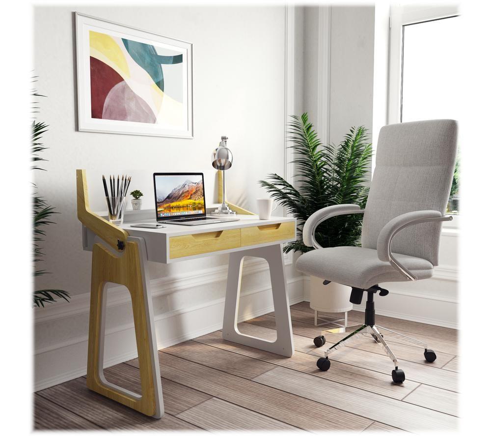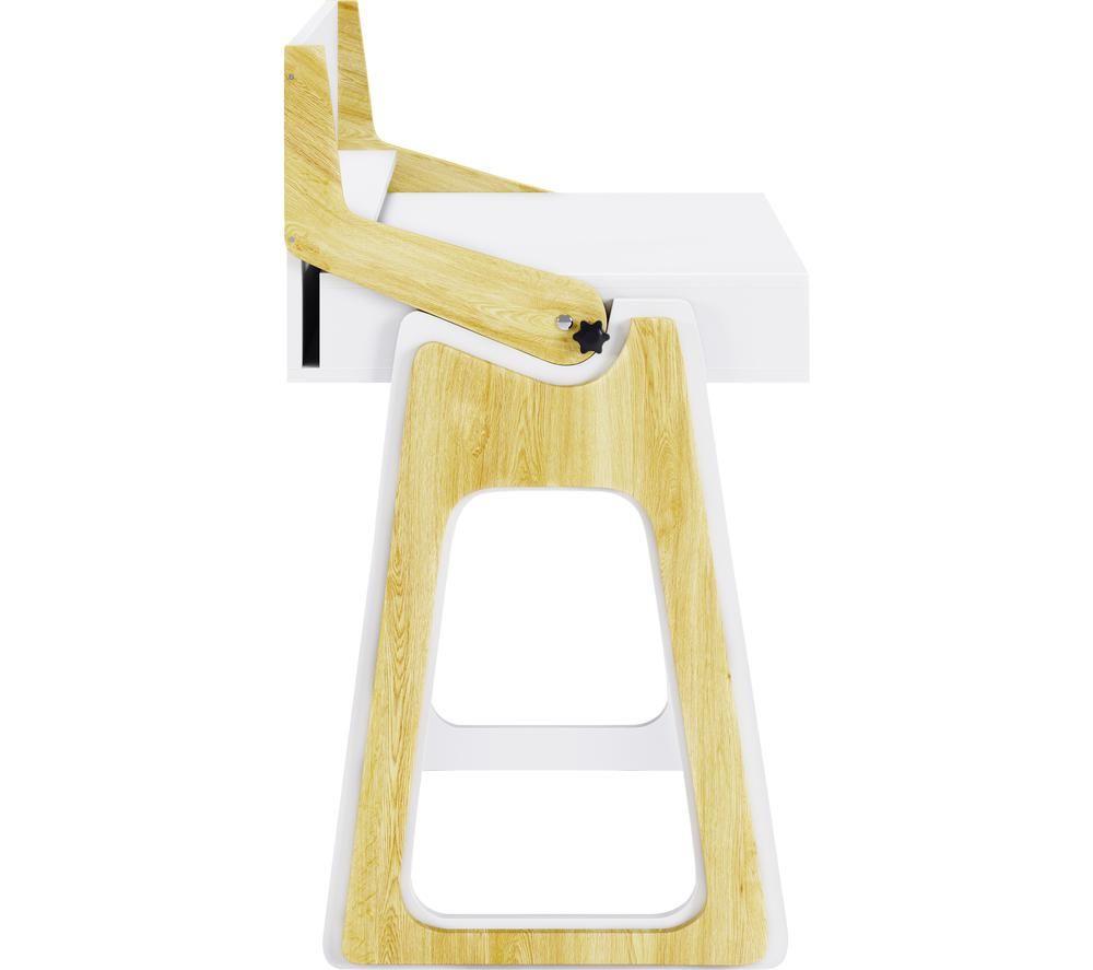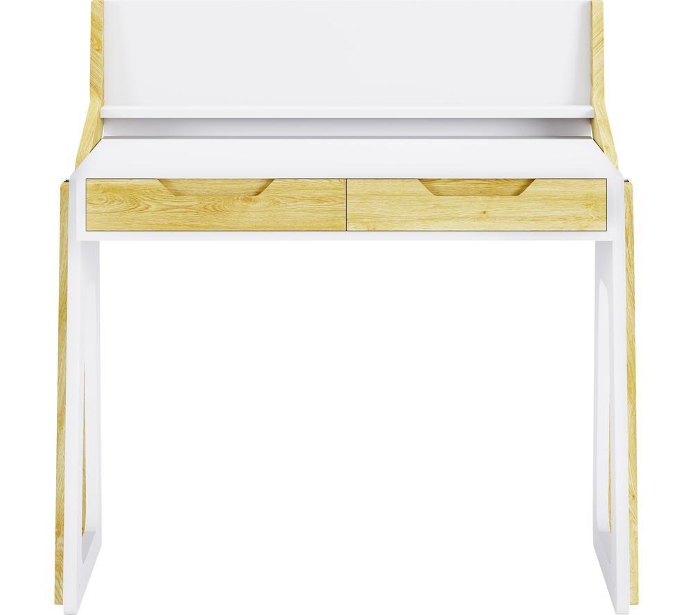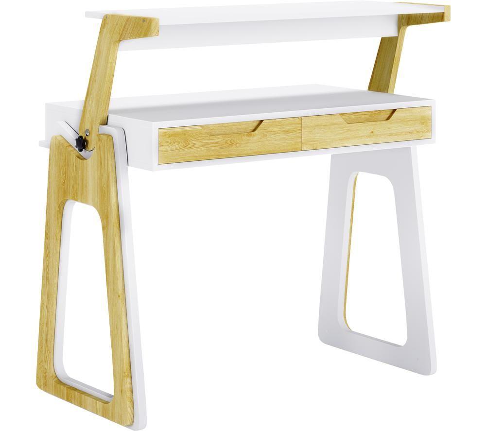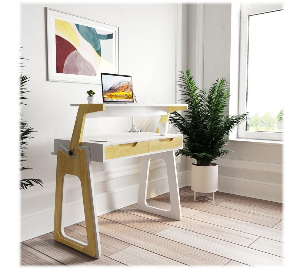 Good to know- Thanks to the convertible desktop riser you can choose to work sitting down or standing up- Featuring a gloss white finish with oak accents, it will nicely complement any home office or living room- With 2 drawers, you'll have plenty of storage for your office supplies and paperwork- It can support up to 40 kg, so you can use it even for heavier computers and monitors