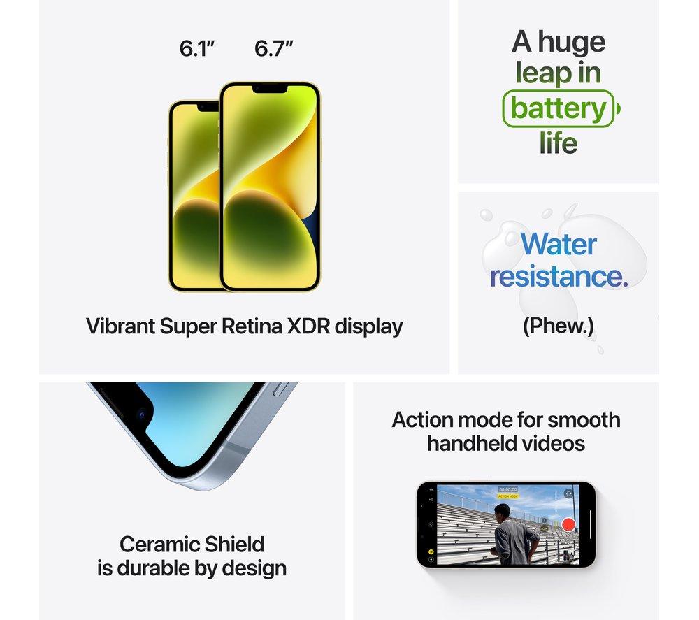 With Apple iPhone 14 in your pocket, anything the day throws at you is a little bit easier. The A15 Bionic chip beating in its chest can run any app or game without breaking a sweat. Everything's a treat to look at on the 6.1" Super Retina XDR display – from maps to Apple TV Shows. The 12 MP dual camera system will help you capture significant (and insignificant) moments in amazing detail and life-like colours. And with up to 20 hours of battery life you can just go on. And on. And on.Good to know- Action mode irons out bumps in your video for beautifully smooth action sequences- The Photonic Engine helps capture more light across all the cameras for better image quality in dark environments- With Night Mode, not even nightfall can stop you from taking beautiful photos- Unleash your inner filmmaker with 4K HDR video and Cinematic Mode- When you need a top-up, just pop on a wireless MagSafe charger- Face ID is convenient and secure, no hints needed- Dance in the rain or swim in the ocean – the IP68 water resistance will keep your iPhone safe- If you're in a car accident, Crash Detection can automatically notify emergency services- With 5G connection you'll be surfing faster than ever before
