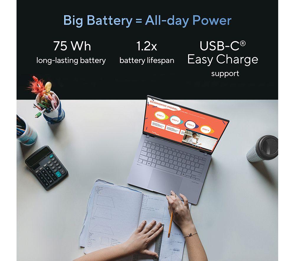 Work and play from home or on the go. The ASUS Vivobook S 14 is light and powerful, so you can tick off your to-do list from anywhere. It's powered by the Intel® Core™ Ultra 7 processor, which is built around AI. That makes it super-smart and efficient, so you can work, play and binge for up to 16 hours on a single charge. Whatever you do, it'll look amazing on the Full HD+ OLED screen. It's got stunning colours and contrast to make your favourite shows pop. Good to know - A Copilot+ PC brings the latest AI features so you can work and create faster than ever before- Intel® Arc™ Graphics give you an extra kick in games and creative apps - Harman Kardon speakers accompany the image with amazing sound - It weighs only 1.3 kg, so you'll barely notice it in your bag - Multitask away with 16 GB of RAM - you can switch between apps without lag - 1 TB of SSD storage gives you plenty of space for pretty much everything _______________________________________________________________ Intel, the Intel logo, Celeron, Intel Atom, Intel Core, Intel. Experience What's Inside, Intel Inside, the Intel Inside logo, Intel Unite, Iris, Pentium, Thunderbolt, the Thunderbolt logo, and Ultrabook are trademarks of Intel Corporation in the U.S. and/or other countries.