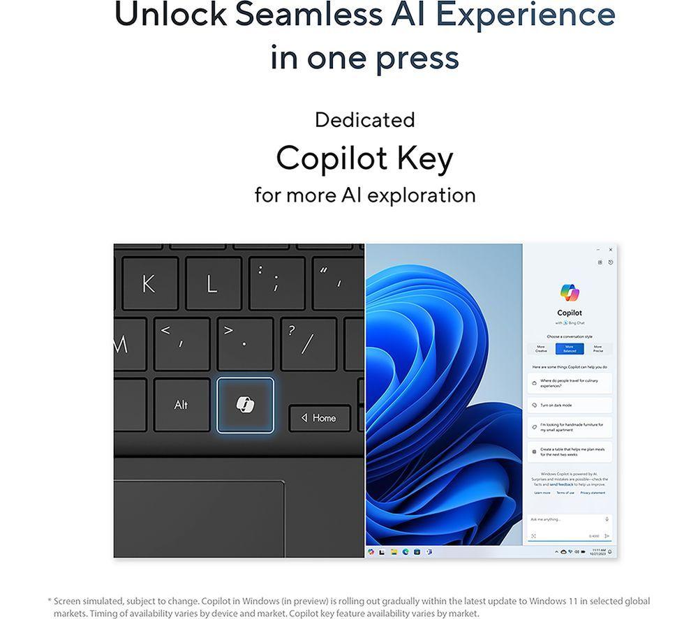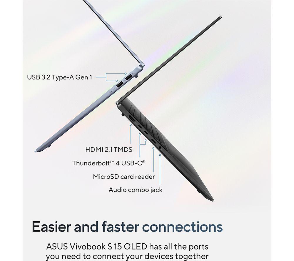 Product code: 661372 Work and play from home or on the go. The ASUS Vivobook S 15 is light and powerful, so you can tick off your to-do list from anywhere. It's powered by the Intel® Core™ Ultra 7 processor, which is built around AI. That makes it super-smart and efficient, so you can work, play and binge for up to 16 hours on a single charge. Whatever you do, it'll look amazing on the 3K OLED screen. It's got stunning colours and contrast to make your favourite shows pop. And it runs at a 120 Hz refresh rate, for perfectly smooth action. Good to know - Harman Kardon speakers accompany the image with amazing sound - It weighs only 1.7 kg, so you'll barely notice it in your bag  - Multitask away with 16 GB of RAM - you can switch between apps without lag - 1 TB of SSD storage gives you plenty of space for pretty much everything Why we love it " Dive into a world of immersive entertainment and sharp action with the 3K ASUS Lumina OLED screen. It's perfect for movies, games and... anything that's worth watching." - Suzy, Product Copywriter _______________________________________________________________Intel, the Intel logo, Celeron, Intel Atom, Intel Core, Intel. Experience What's Inside, Intel Inside, the Intel Inside logo, Intel Unite, Iris, Pentium, Thunderbolt, the Thunderbolt logo, and Ultrabook are trademarks of Intel Corporation in the U.S. and/or other countries.  View More View Less