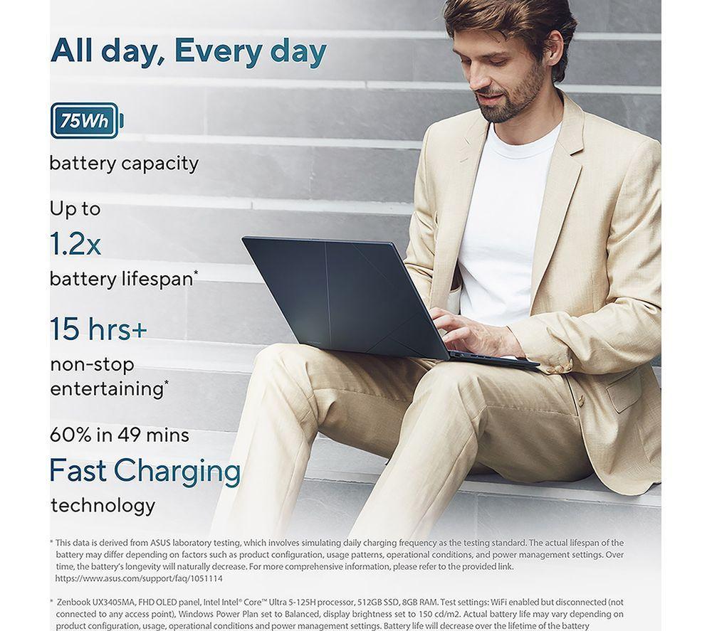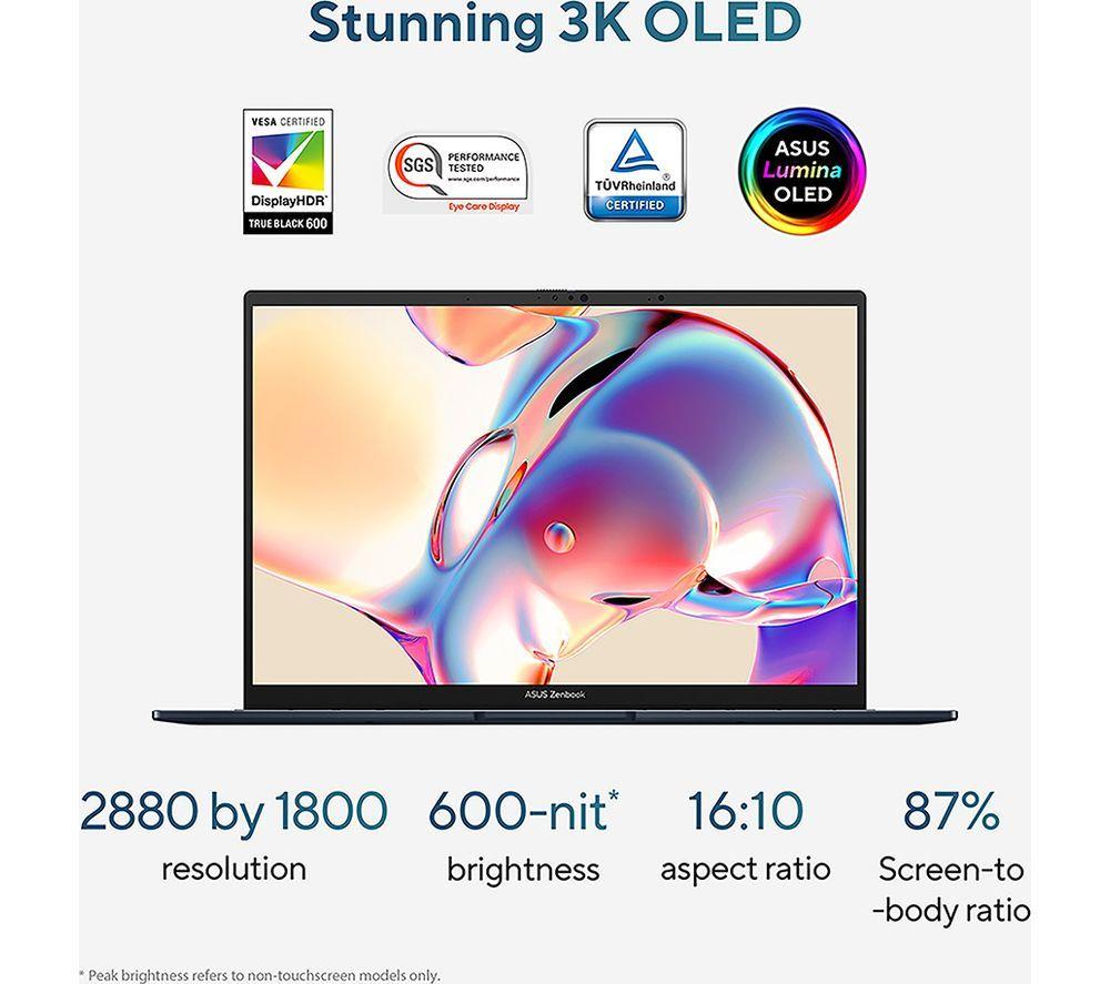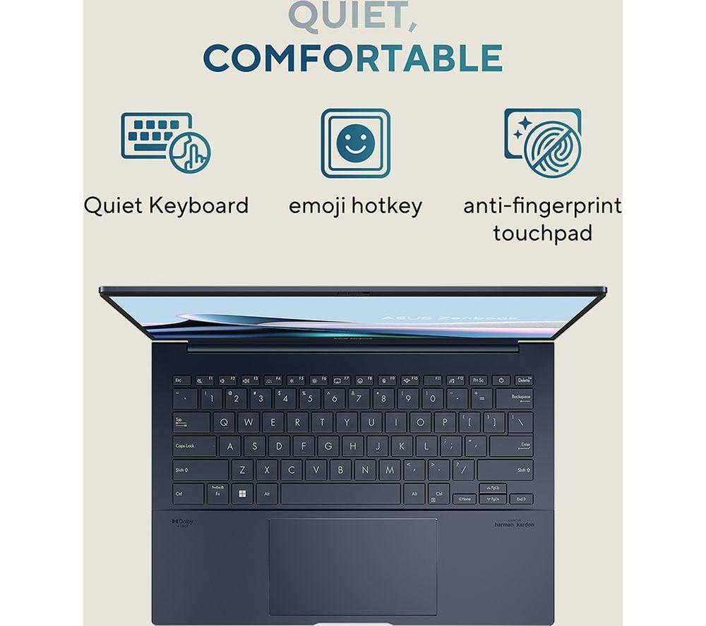 How much power can you squeeze into a thin and light laptop? Quite a lot, it turns out. The Zenbook 14 packs an Intel® Core™ Ultra 7 processor and with Intel® Arc™ Graphics into an amazingly thin body. Plus, the OLED touchscreen on this laptop is a jewel meant for professionals. With 3K resolution and PANTONE Validated, it is sharp, bright, and colour-accurate, so you can trust it with your creative projects. And the 120 Hz refresh rate makes all your games and movies buttery smooth. Oh, and it weighs just 1.25 kg, so you can really take it with you anywhere. Good to know - 16 GB of DDR5 RAM means you can multitask like you've never multitasked before - The 1 TB SSD gives you plenty of space for all your files – and it's darn fast, too - With the lightning fast WiFi 6E you can forget about the loading circle - HDMI 2.1 and Thunderbolt 4 let you connect high-res displays and other peripherals - Harman Kardon speakers accompany the image with amazing sound - With up to 8 hours of battery life, you won't be tied down to a charger ___________________________________________________________________________ Intel, the Intel logo, Celeron, Intel Atom, Intel Core, Intel. Experience What's Inside, Intel Inside, the Intel Inside logo, Intel Unite, Iris, Pentium, Thunderbolt, the Thunderbolt logo, and Ultrabook are trademarks of Intel Corporation in the U.S. and/or other countries.