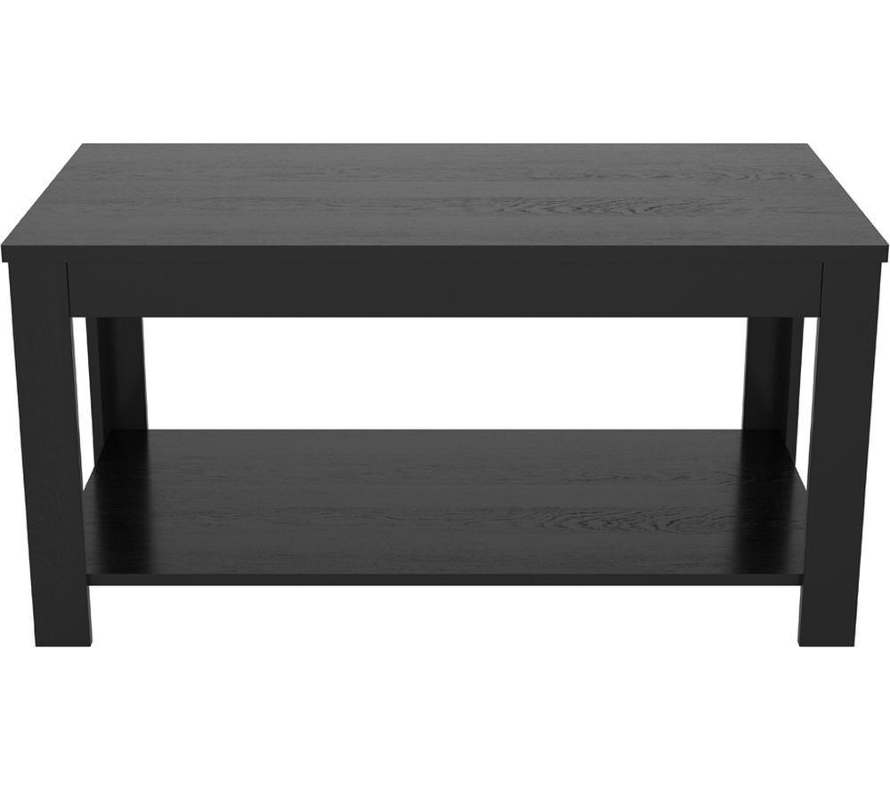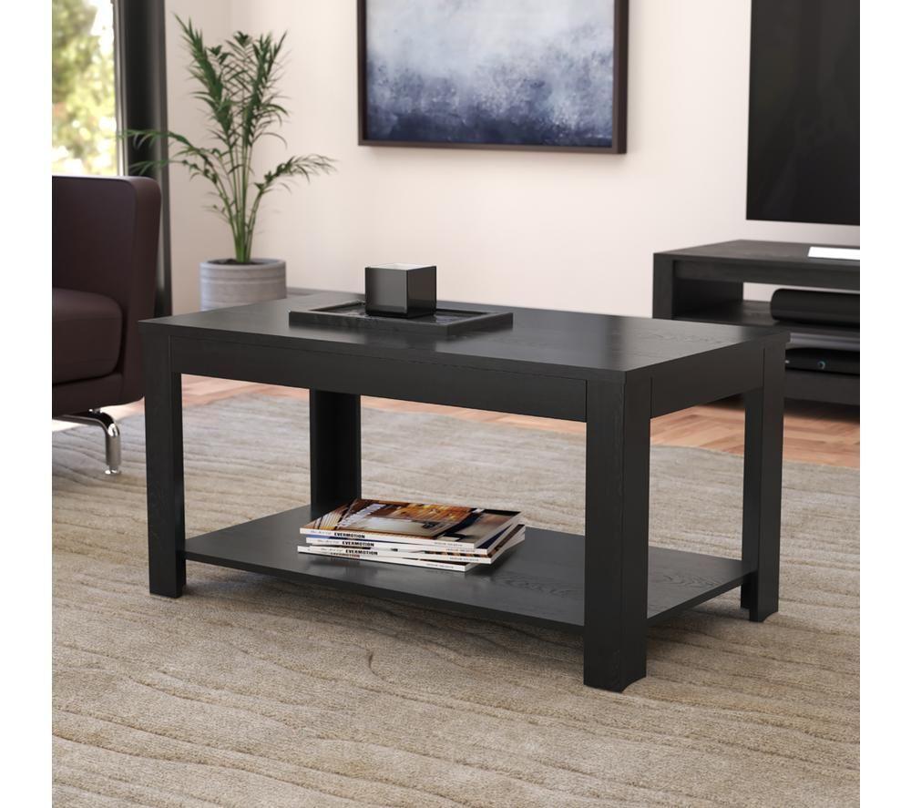 - This AFV Calibre 90 cm coffee table can hold up to 10 kg and has plenty of space to store your essentials - The minimalist design and black oak wood veneer effect helps it fit in with any style - Keep your books and magazines organised or display decorative pieces on the handy shelf - Everything you need is in the box, so it's easy to assemble