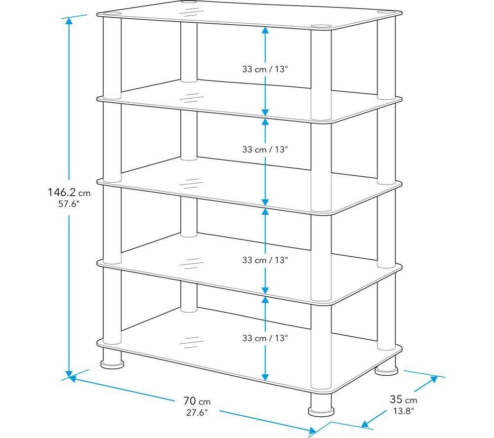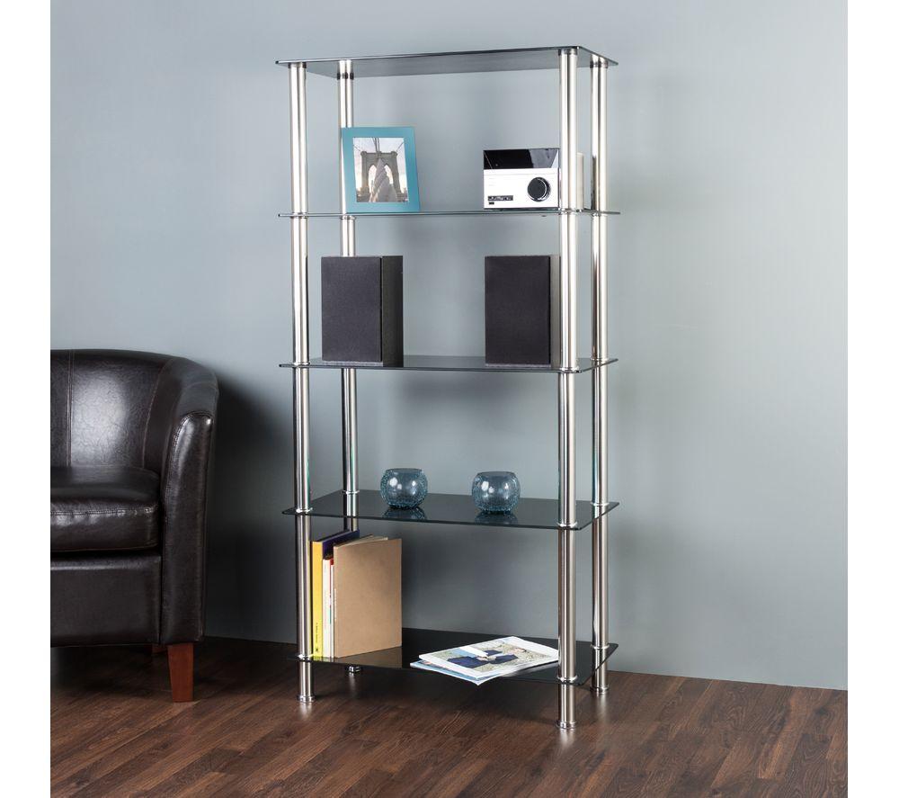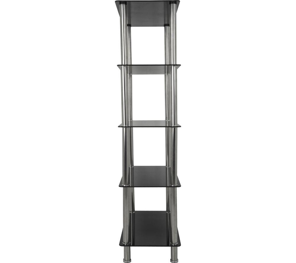 - This AVF 5-tier wide shelving unit can hold up to 25 kg and has plenty of space to store your essentials- Keep your books and magazines organised or show off your decorative pieces on the handy shelves- Everything you need is in the box, so it's easy to assemble- The sturdy black glass lasts long plus the chrome design helps it fit in with almost any style
