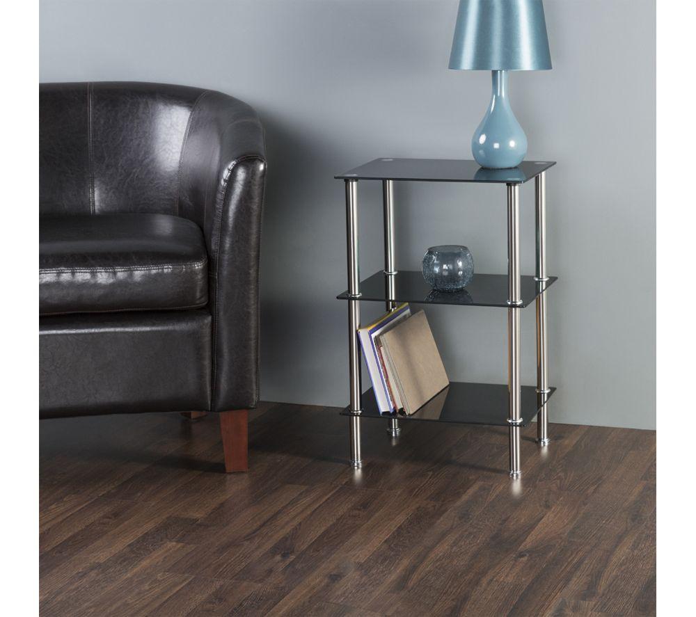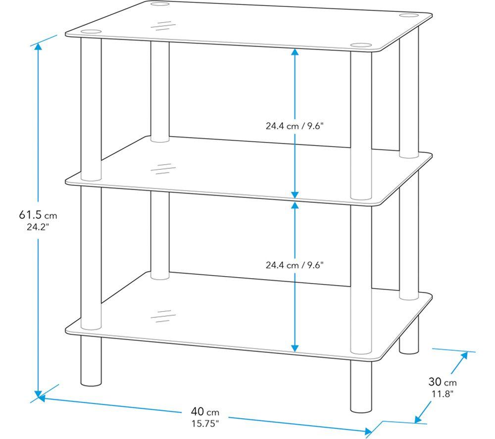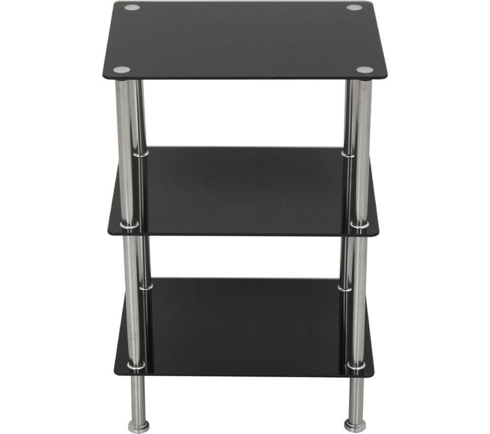 - This AVF 3-tier square shelving unit can hold up to 15 kg and has plenty of space to store your essentials - Keep your books and magazines organised or show off your decorative pieces on the handy shelves - Everything you need is in the box, so it's easy to assemble - The sturdy black glass lasts long plus the chrome design helps it fit in with almost any style