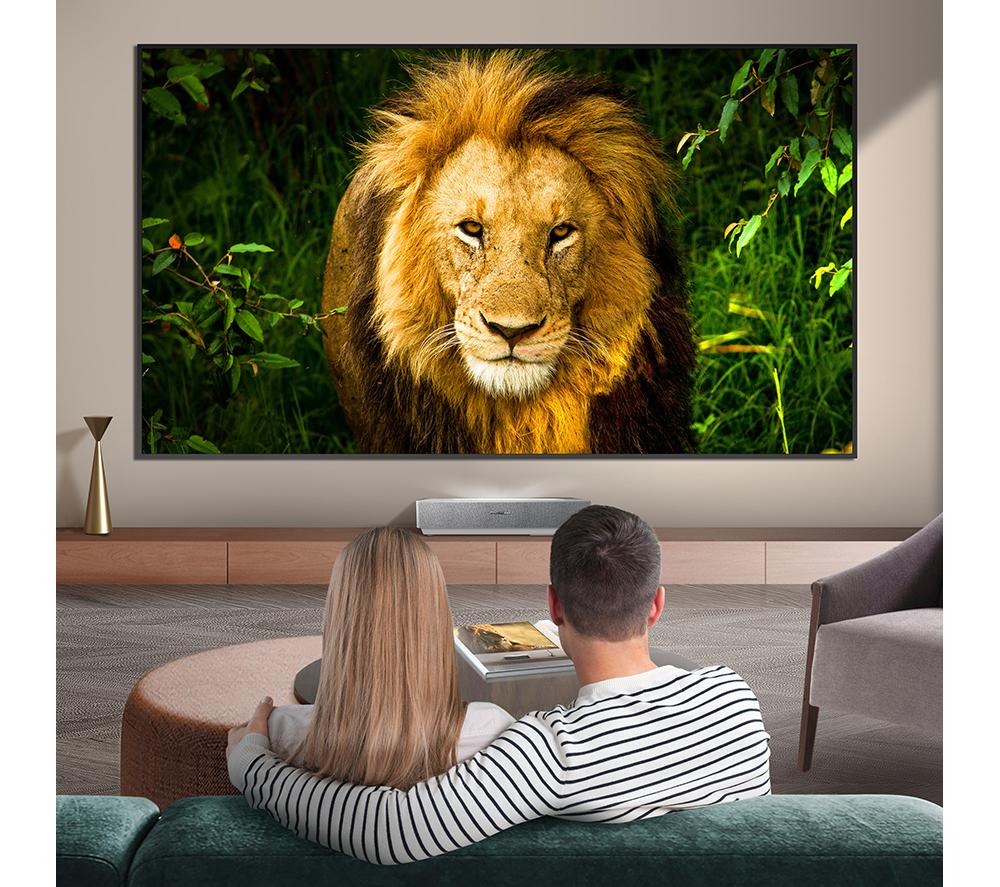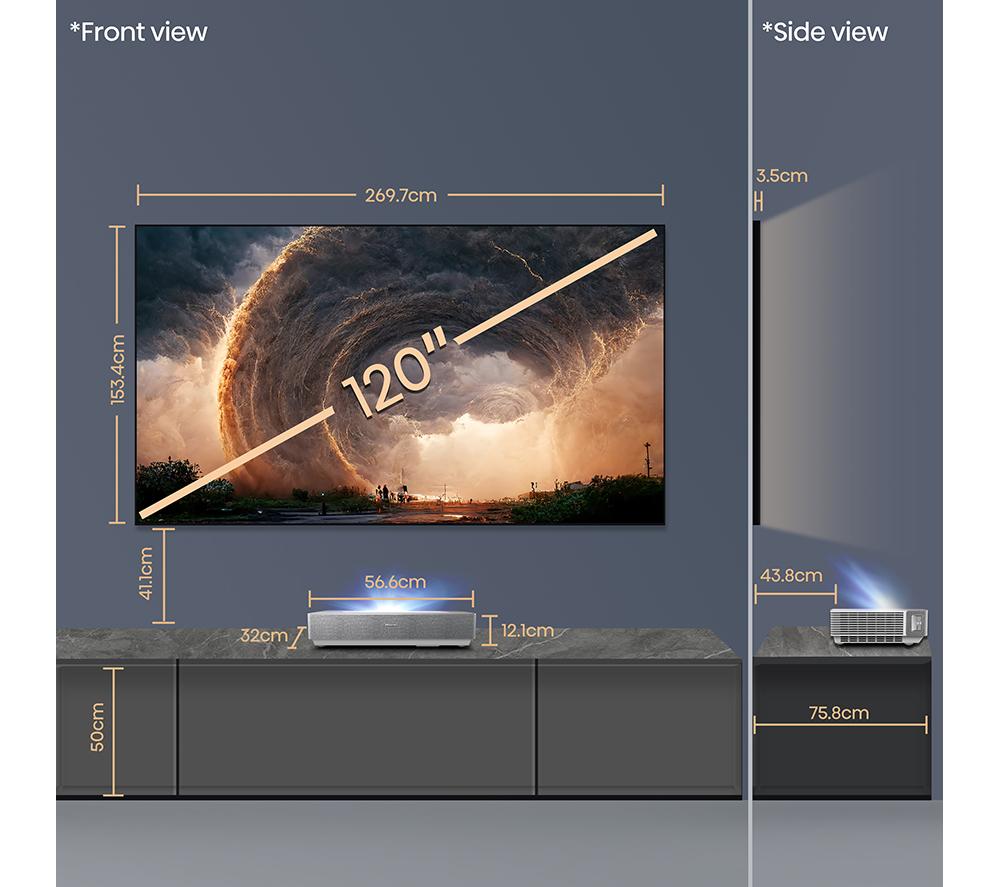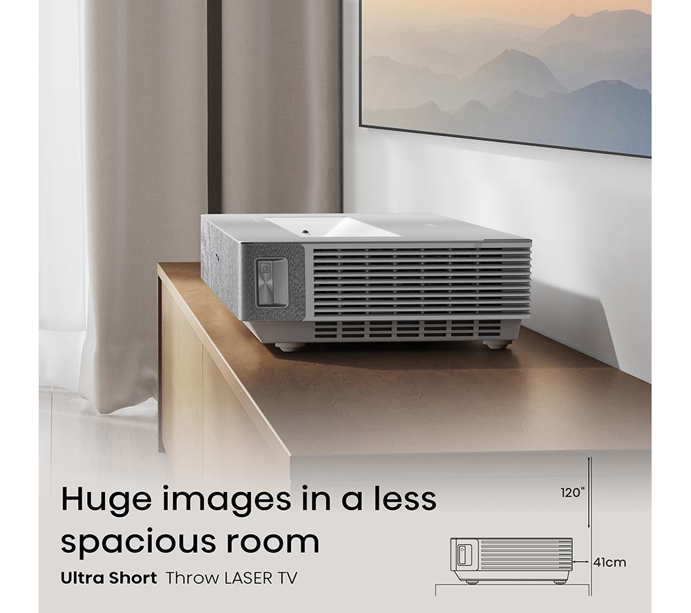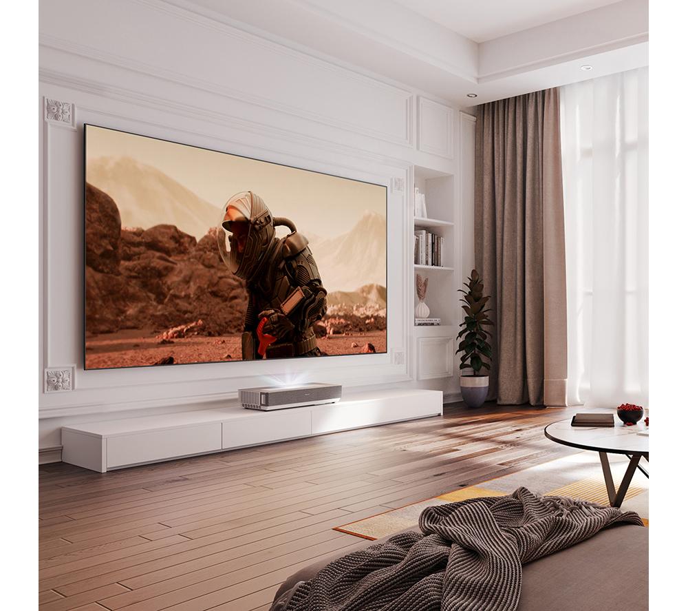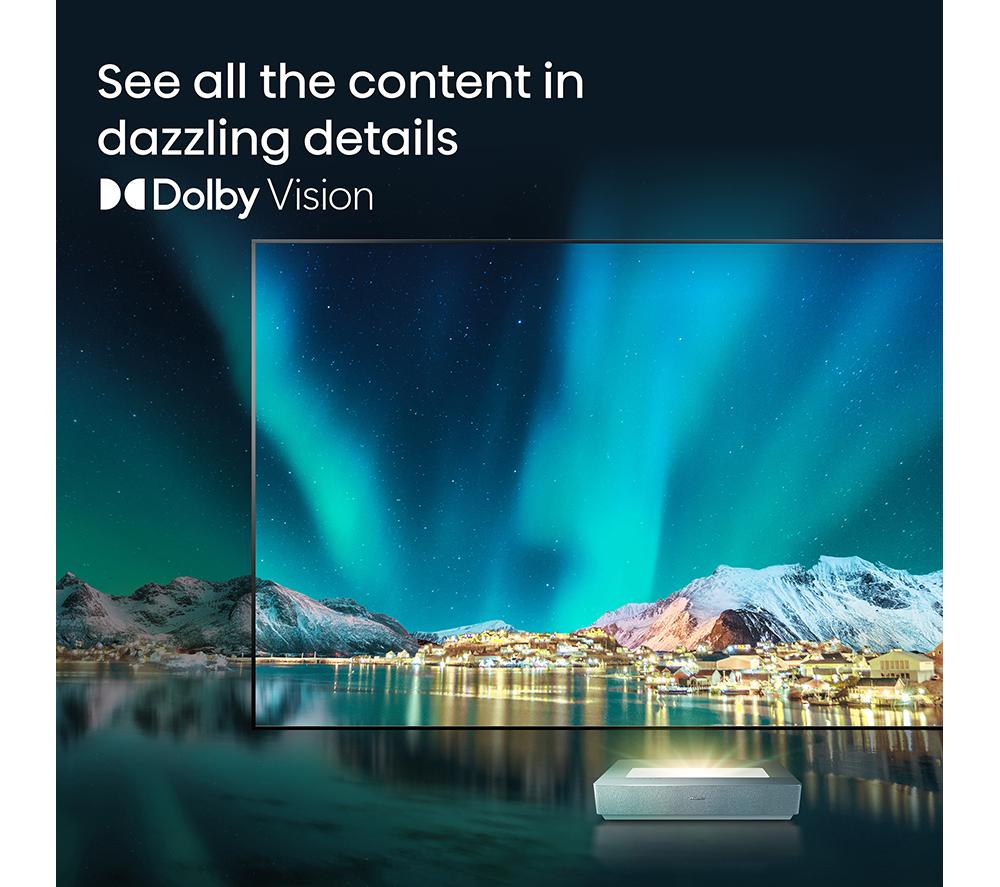 With a 120” 4K screen, this Hisense L5 Laser TV will make movie nights and cup finals feel epic. And don't worry if the match is at midday - the Ambient Light Rejecting screen means you'll still be able to see everything clearly, and the light source with 2,700 lumens of brightness makes colours pop. You can place the projector just below the screen thanks to Ultra-Short Throw technology – so your movie won't be ruined by someone coming and going. And there are two built-in speakers supporting Dolby Atmos, so you can enjoy roaring cinematic sound too.Good to know- Dolby Vision HDR and X-Fusion laser-light technology deliver the brightest whites and darkest blacks- The VIDAA smart platform has Netflix, Prime Video, Disney+ and other apps- Catch-up straight from the TV guide or watch live TV with Freeview Play- Control is easy - just use the included remote or built-in Alexa for hands-free voice commands- There's plenty of connections, including WiFi, Bluetooth and 3 HDMI ports________________________________Please note: Freeview and some apps & services are only available in the UK. Apps & services may be removed or no longer supported by third-party content providers at any time. Some apps & services may not be available at launch and may require a firmware update before becoming available.