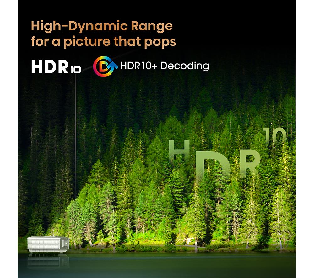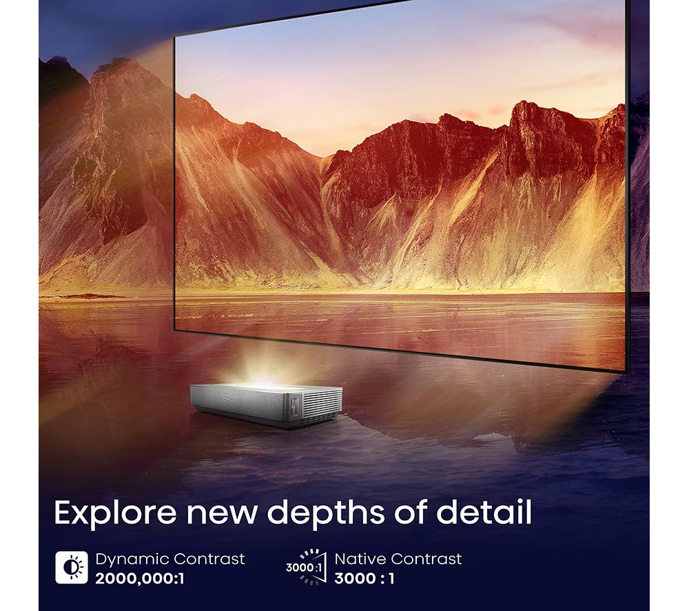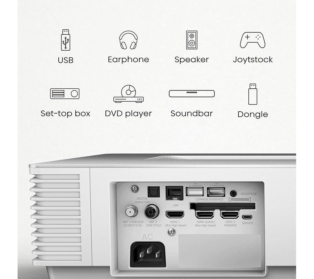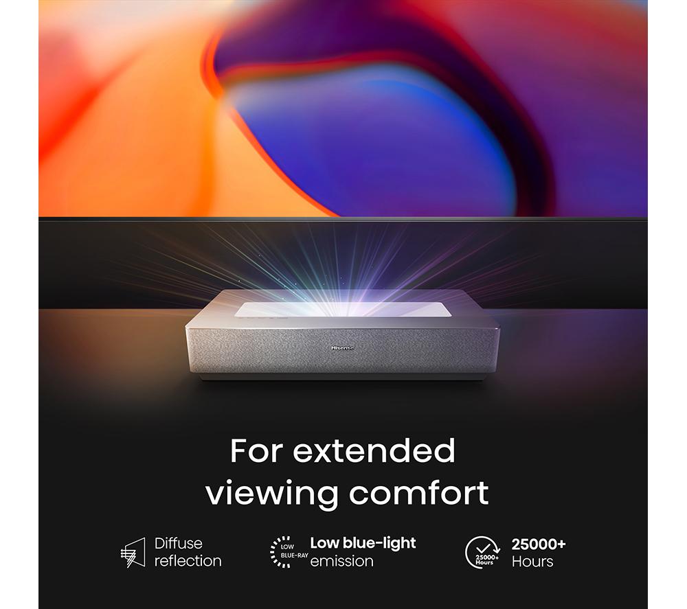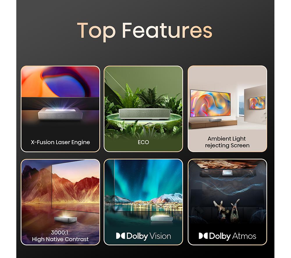 With a 120” 4K screen, this Hisense L5 Laser TV will make movie nights and cup finals feel epic. And don't worry if the match is at midday - the Ambient Light Rejecting screen means you'll still be able to see everything clearly, and the light source with 2,700 lumens of brightness makes colours pop. You can place the projector just below the screen thanks to Ultra-Short Throw technology – so your movie won't be ruined by someone coming and going. And there are two built-in speakers supporting Dolby Atmos, so you can enjoy roaring cinematic sound too.Good to know- Dolby Vision HDR and X-Fusion laser-light technology deliver the brightest whites and darkest blacks- The VIDAA smart platform has Netflix, Prime Video, Disney+ and other apps- Catch-up straight from the TV guide or watch live TV with Freeview Play- Control is easy - just use the included remote or built-in Alexa for hands-free voice commands- There's plenty of connections, including WiFi, Bluetooth and 3 HDMI ports________________________________Please note: Freeview and some apps & services are only available in the UK. Apps & services may be removed or no longer supported by third-party content providers at any time. Some apps & services may not be available at launch and may require a firmware update before becoming available.