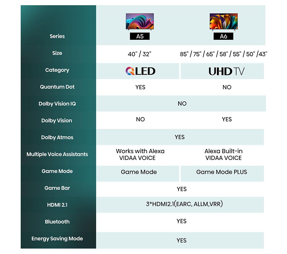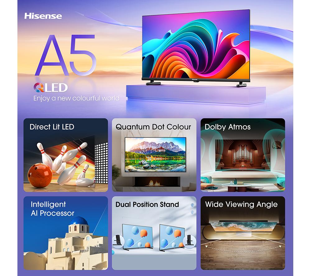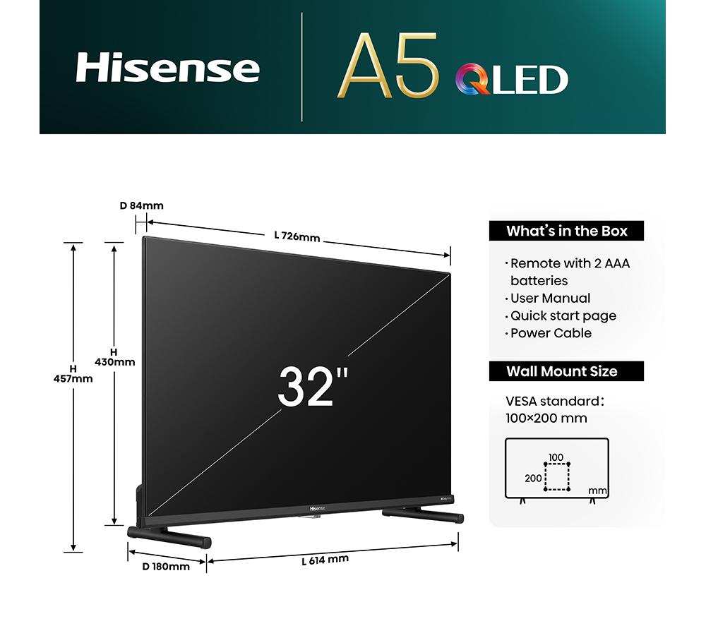 Over a billion shades are brought to life with Quantum Dot Colour on this Hisense A5N TV. It's not just vibrant, colours are served up in a true and natural way. The directlit display controls the contrast and brightness for deep blacks and bright highlights from edge to edge. Dolby Atmos has you covered for sound. It creates a virtual surround sound experience that makes you feel like you're right where the action is. Good to know - Connect your laptop and other gadgets using the USB-C port – handy for work or play - Stream content from the likes of Netflix, Disney+, and NOW on the VIDAA smart platform - Catch-up on your soaps and dramas straight from the TV guide with Freeview Play ________________________________ Please note: Some apps & services (including tuner) are only available in the UK. Apps & services may be removed or no longer supported by third party content providers at any time. Some apps & services may not be available at launch and may require a firmware update before becoming available. Some services require an account and/or subscription fee.