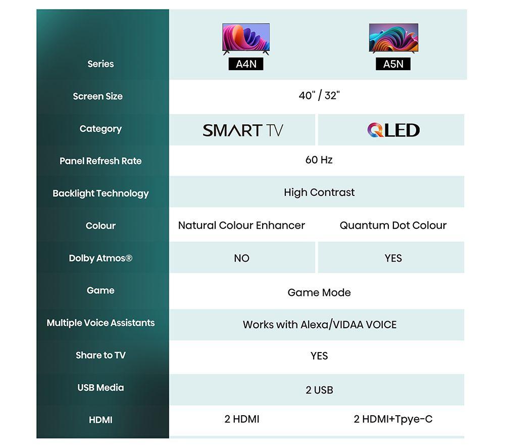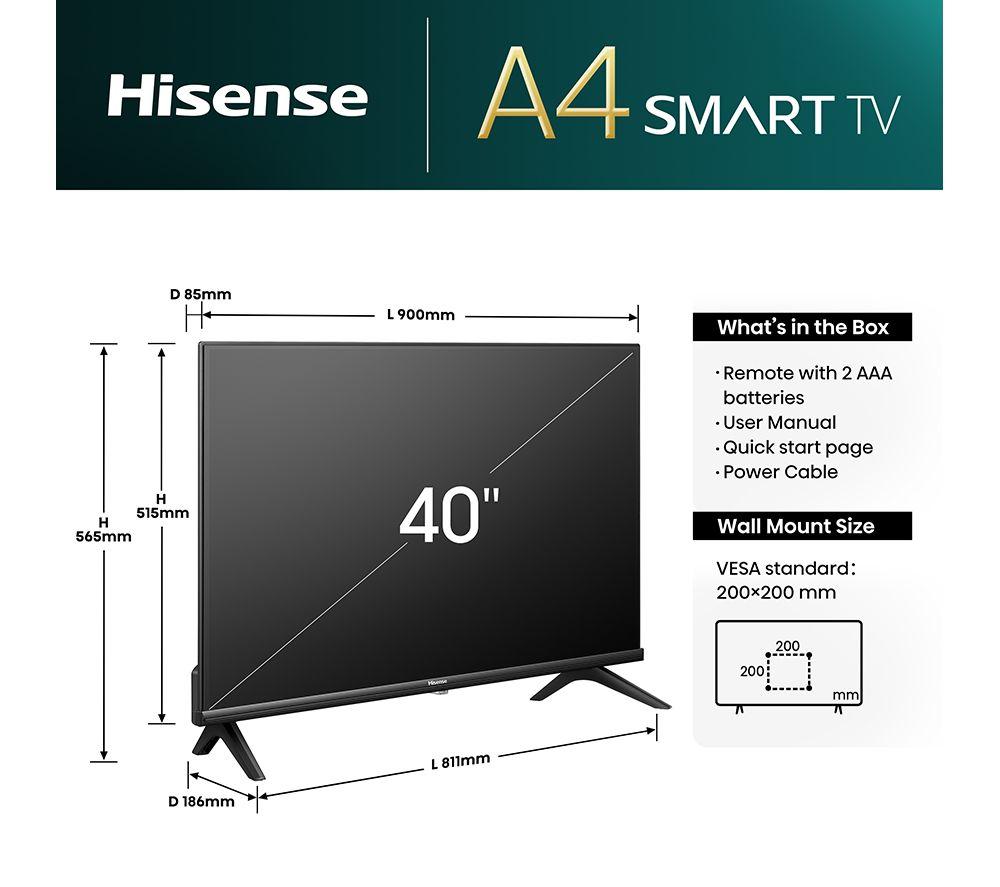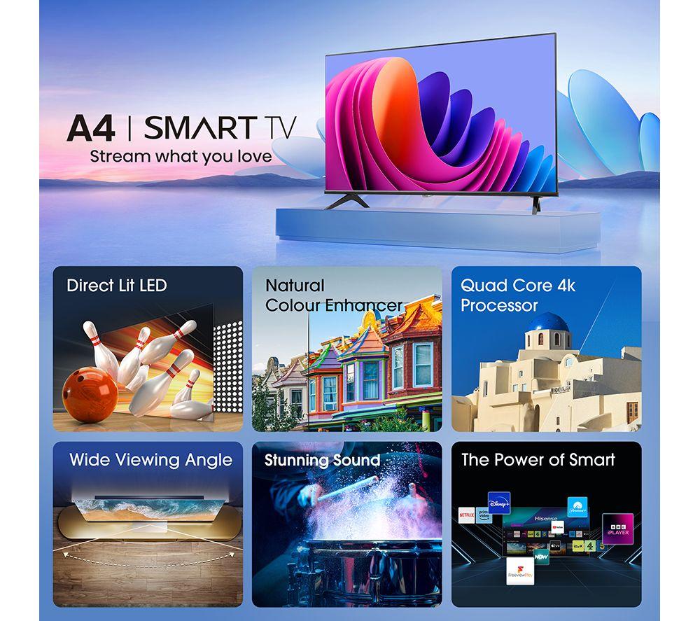 The world is colourful – see more of it on this Hisense A4N TV. Natural Colour Enhancer technology does what it says on the tin – whether you're watching sports or movies, you'll see colours the way they were meant to be seen. For greater realism, the direct lit full array display precisely controls the brightness and contrast. Highlights look brighter and blacks look deeper. The Intelligent AI processor is also hard at work in the background boosting the quality frame by frame, so you always get the best picture.Good to know- This TV supports both DTS Virtual:X and Dolby Atmos for a virtual surround sound experience- Everyone gets a great seat thanks to the wide viewing angle- AI Sports mode automatically boosts the audio and picture when watching sport- Stream movies and TV shows on the VIDAA U smart platform – there's Netflix, Prime and more- Catch-up on shows straight from the TV guide with Freeview Play____________________________________________Please note: Freeview and some apps & services are only available in the UK. Apps & services may be removed, or no longer supported by third party content providers at any time. Some apps & services may not be available at launch and may require a firmware update before becoming available.