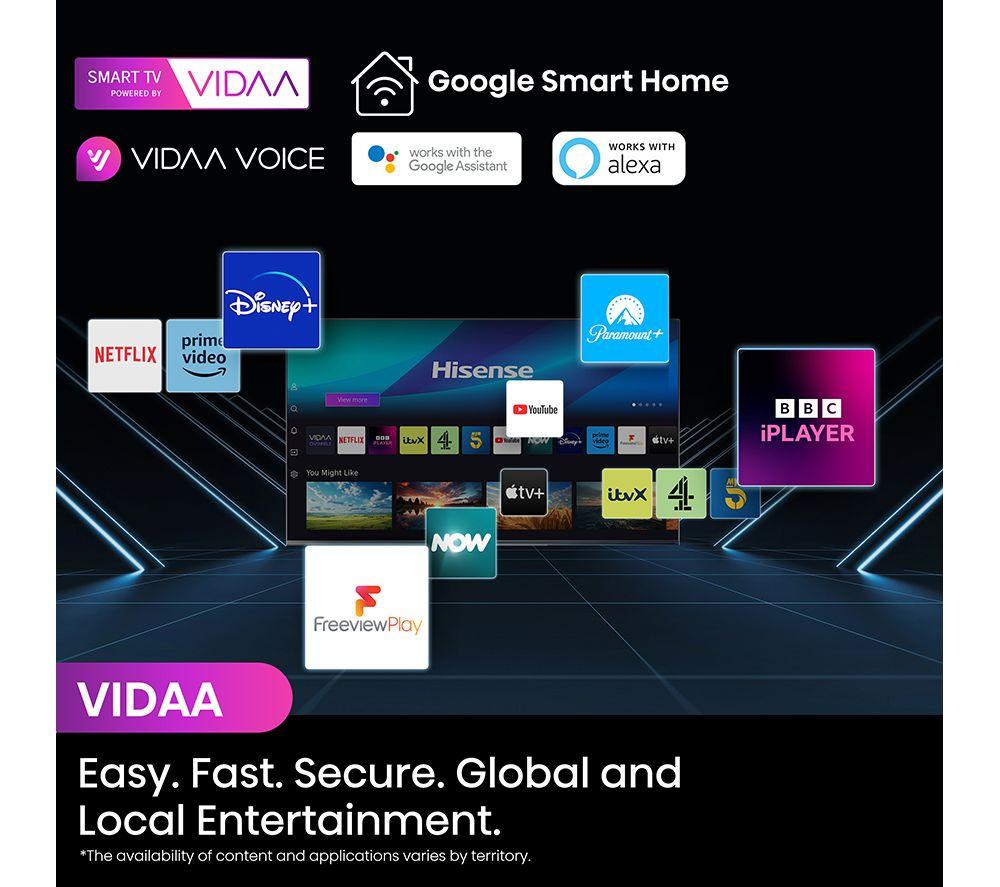 Over a billion shades are brought to life with Quantum Dot Colour on this Hisense A5N TV. It's not just vibrant, colours are served up in a true and natural way. The directlit display controls the contrast and brightness for deep blacks and bright highlights from edge to edge. Dolby Atmos has you covered for sound. It creates a virtual surround sound experience that makes you feel like you're right where the action is. Good to know - Connect your laptop and other gadgets using the USB-C port – handy for work or play - Stream content from the likes of Netflix, Disney+, and NOW on the VIDAA smart platform - Catch-up on your soaps and dramas straight from the TV guide with Freeview Play ________________________________ Please note: Some apps & services (including tuner) are only available in the UK. Apps & services may be removed or no longer supported by third party content providers at any time. Some apps & services may not be available at launch and may require a firmware update before becoming available. Some services require an account and/or subscription fee.