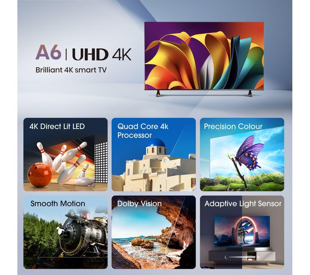 Hold onto your popcorn because dramas just got a whole lot juicier on the Hisense A6N TV. Tiny LEDs work together on the direct-lit full array display to give you perfect blacks and dazzling highlights from every angle. The Quad Core 4K processor uses AI to upgrade every frame, even making your old favourites look fresh. And with Precision Colour, everything pops with bold, vibrant hues.Good to know- Freely brings you live TV channels and on-demand content over WiFi – no aerial, no fees, no hassle- Dolby Vision HDR cranks up the contrast, so you won't miss any details, even in the shadows- Get that cinema sound at home with DTS Virtual:X and Dolby Audio support- The Adaptive Light Sensor smartly adjusts the screen brightness to match your room's lighting- Fast action, like football, looks as smooth as butter thanks to Smooth Motion- Stream content from the likes of Netflix, Disney+, and NOW on the VIDAA smart platform________________________________Please note: Some apps & services (including tuner) are only available in the UK. Apps & services may be removed or no longer supported by third party content providers at any time. Some apps & services may not be available at launch and may require a firmware update before becoming available. Some services require an account and/or subscription fee.