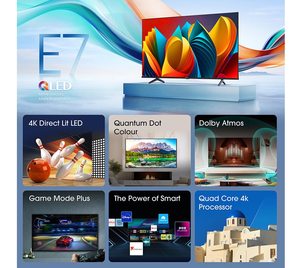 Over a billion shades are brought to life with Quantum Dot Colour on this Hisense E7N TV. It's not just vibrant, colours are served up in a true and natural way. The Directlit Full Array display precisely controls the contrast and brightness. That means deep blacks and bright highlights from edge to edge that are always on point. The Quad Core 4K processor uses AI to boost the picture frame by frame – even older content gets an upgrade. Dolby Atmos has you covered for sound. It creates a virtual surround sound experience that makes you feel like you're right where the action is.Good to know- Freely brings you live TV channels and on-demand content over WiFi – no aerial, no fees, no hassle- Dolby Vision HDR boosts the contrast, so you'll see more details – like enemies lurking in the shadows- Fast-paced action, like football, looks super fluid thanks to Smooth Motion- Stream content from the likes of Netflix, Disney+, and NOW on the VIDAA smart platform________________________________Please note: Some apps & services (including tuner) are only available in the UK. Apps & services may be removed or no longer supported by third party content providers at any time. Some apps & services may not be available at launch and may require a firmware update before becoming available. Some services require an account and/or subscription fee.