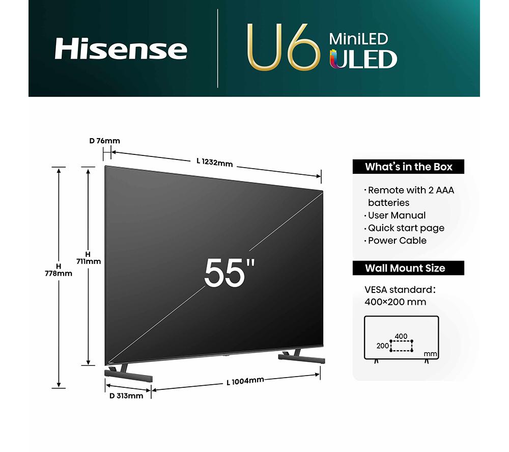 Mini LEDs deliver big drama on this Hisense U6N TV. Thousands of tiny LEDs work in harmony across miniature dimming zones for incredibly precise control. No more washed-out looking shows – it's bright and dark in all the right places. The Hi-View Engine is the brains of the operation, turning the mundane into the magnificent by boosting the colours and contrast. Even older films look like they were shot yesterday thanks to 4K AI upscaling. And with Quantum Dot tech, you'll be served up over a billion shades of vivid colours. It really makes documentaries and sport pop.Good to know- Freely brings you live TV channels and on-demand content over WiFi – no aerial, no fees, no hassle- With support for popular HDR formats like Dolby Vision and HDR10+, you're covered for most streaming services- Dolby Atmos serves up a virtual surround sound experience, so you'll feel like you're in the heat of the action- The Wide Viewing Angle means everyone has prime position, wherever they're sitting- Stream content from the likes of Netflix, Disney+, and NOW on the VIDAA smart platform________________________________Please note: Some apps & services (including tuner) are only available in the UK. Apps & services may be removed or no longer supported by third party content providers at any time. Some apps & services may not be available at launch and may require a firmware update before becoming available. Some services require an account and/or subscription fee.