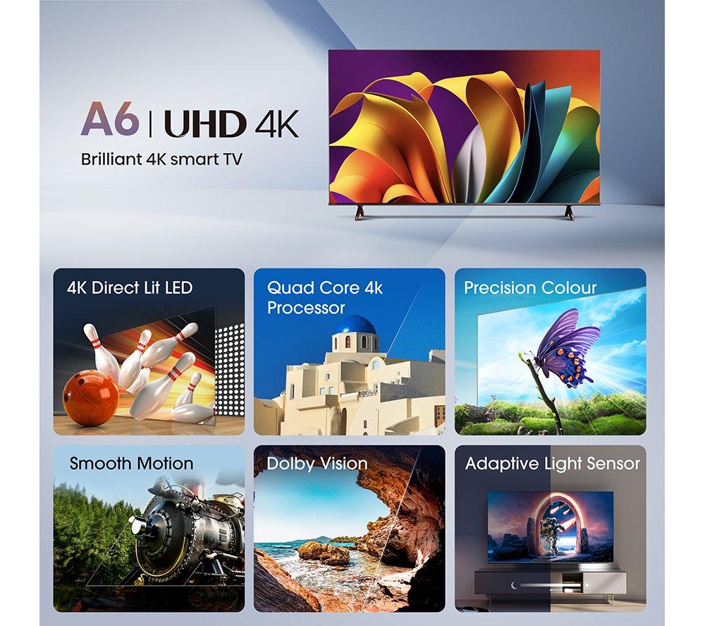 Dramas just got a lot more intense on the Hisense A6N TV. Individual LEDs are precisely controlled on the direct lit full array display. That means deep blacks and bright highlights from edge to edge that are always on point. The Quad Core 4K processor uses AI to boost the picture frame by frame – even older content gets an upgrade. And with Precision Colour, everything looks bolder and brighter with a wider range of hues. So, whatever you're watching, you can be sure it looks its best.Good to know- Freely brings you live TV channels and on-demand content over WiFi – no aerial, no fees, no hassle- Dolby Vision HDR boosts the contrast, so you'll see more details – like enemies lurking in the shadows- Make the most of your movie nights with support for DTS Virtual:X and Dolby Audio- The Adaptive Light Sensor adjusts the screen brightness to suit the light in your room- Fast-paced action, like football, looks super fluid thanks to Smooth Motion- Stream content from the likes of Netflix, Disney+, and NOW on the VIDAA smart platform________________________________Please note: Some apps & services (including tuner) are only available in the UK. Apps & services may be removed or no longer supported by third party content providers at any time. Some apps & services may not be available at launch and may require a firmware update before becoming available. Some services require an account and/or subscription fee.