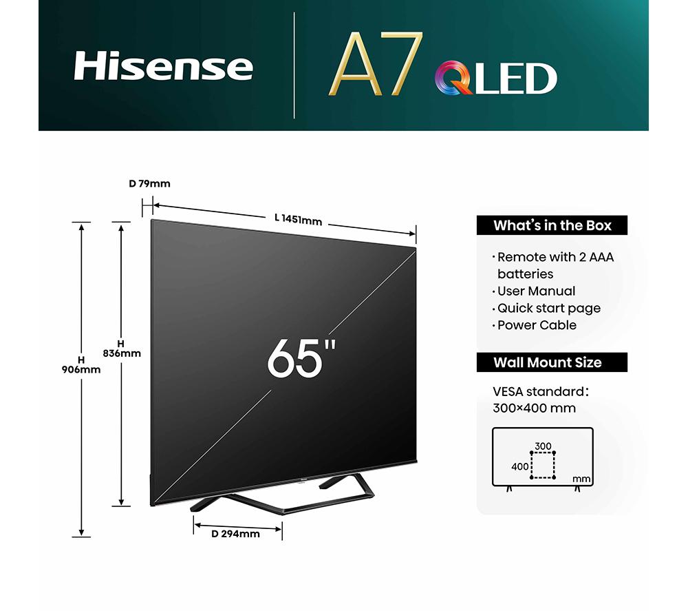 Over a billion shades are brought to life with Quantum Dot Colour on this Hisense A7N TV. It's not just vibrant, colours are served up in a true and natural way. The Directlit Full Array display precisely controls the contrast and brightness. That means deep blacks and bright highlights from edge to edge that are always on point. The Quad Core 4K processor uses AI to boost the picture frame by frame – even older content gets an upgrade. Dolby Atmos has you covered for sound. It creates a virtual surround sound experience that makes you feel like you're right where the action is.Good to know- Freely brings you live TV channels and on-demand content over WiFi – no aerial, no fees, no hassle- Dolby Vision HDR boosts the contrast, so you'll see more details – like enemies lurking in the shadows- Fast-paced action, like football, looks super fluid thanks to Smooth Motion- Stream content from the likes of Netflix, Disney+, and NOW on the VIDAA smart platform________________________________Please note: Some apps & services (including tuner) are only available in the UK. Apps & services may be removed or no longer supported by third party content providers at any time. Some apps & services may not be available at launch and may require a firmware update before becoming available. Some services require an account and/or subscription fee.