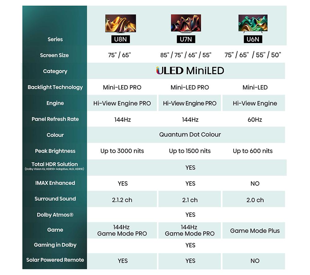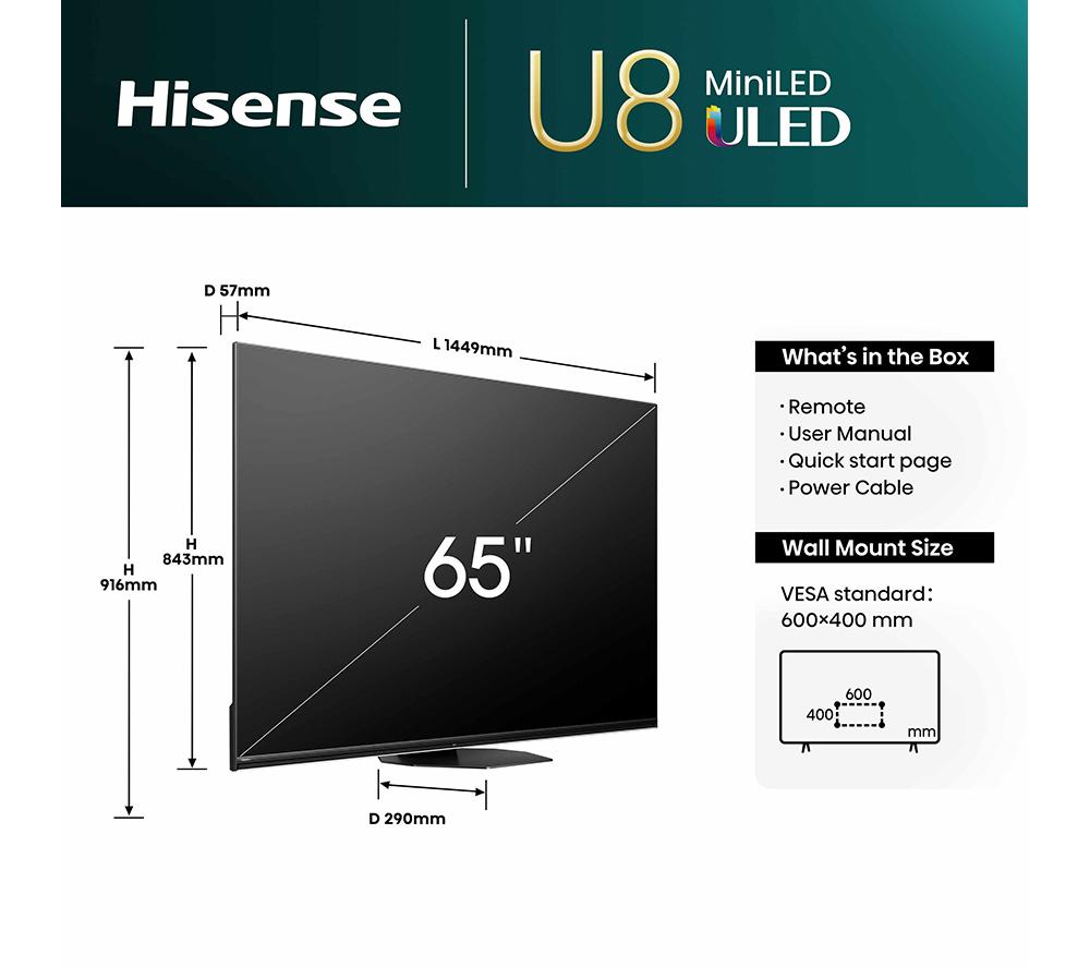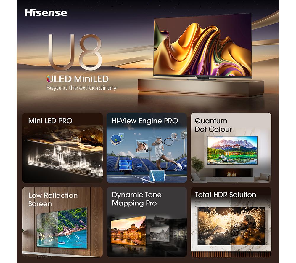 Mini LEDs deliver big drama on this Hisense U8N TV. Thousands of tiny LEDs work in harmony across hundreds of dimming zones for incredibly precise control. No more washed-out looking shows – it's bright and dark in all the right places. The Hi-View Engine Pro is the brains of the operation, turning the mundane into the magnificent by boosting the colours and contrast. Even older films look like they were shot yesterday thanks to 4K AI upscaling. And with Quantum Dot tech, you'll be served up over a billion shades of vivid colours. It really makes documentaries and sport pop.Good to know- Everyone gets a great view wherever they sit thanks to the wide viewing angle and Low Reflection screen- Freely brings you live TV channels and on-demand content over WiFi – no aerial, no fees, no hassle- With support for popular HDR formats like Dolby Vision and HDR10+, you're covered for most streaming services- Dolby Atmos serves up a virtual surround sound experience, so you'll feel like you're in the heat of the action- The 2.1.2 sound system with front firing speakers and twin subwoofers really packs a punch- Stay ahead in the game with the smooth, ultra-responsive 144 Hz Game Mode Pro- IMAX Enhanced brings home the thrill of the cinema with a brilliant picture and immersive audio________________________________Please note: Some apps & services (including tuner) are only available in the UK. Apps & services may be removed or no longer supported by third party content providers at any time. Some apps & services may not be available at launch and may require a firmware update before becoming available. Some services require an account and/or subscription fee.