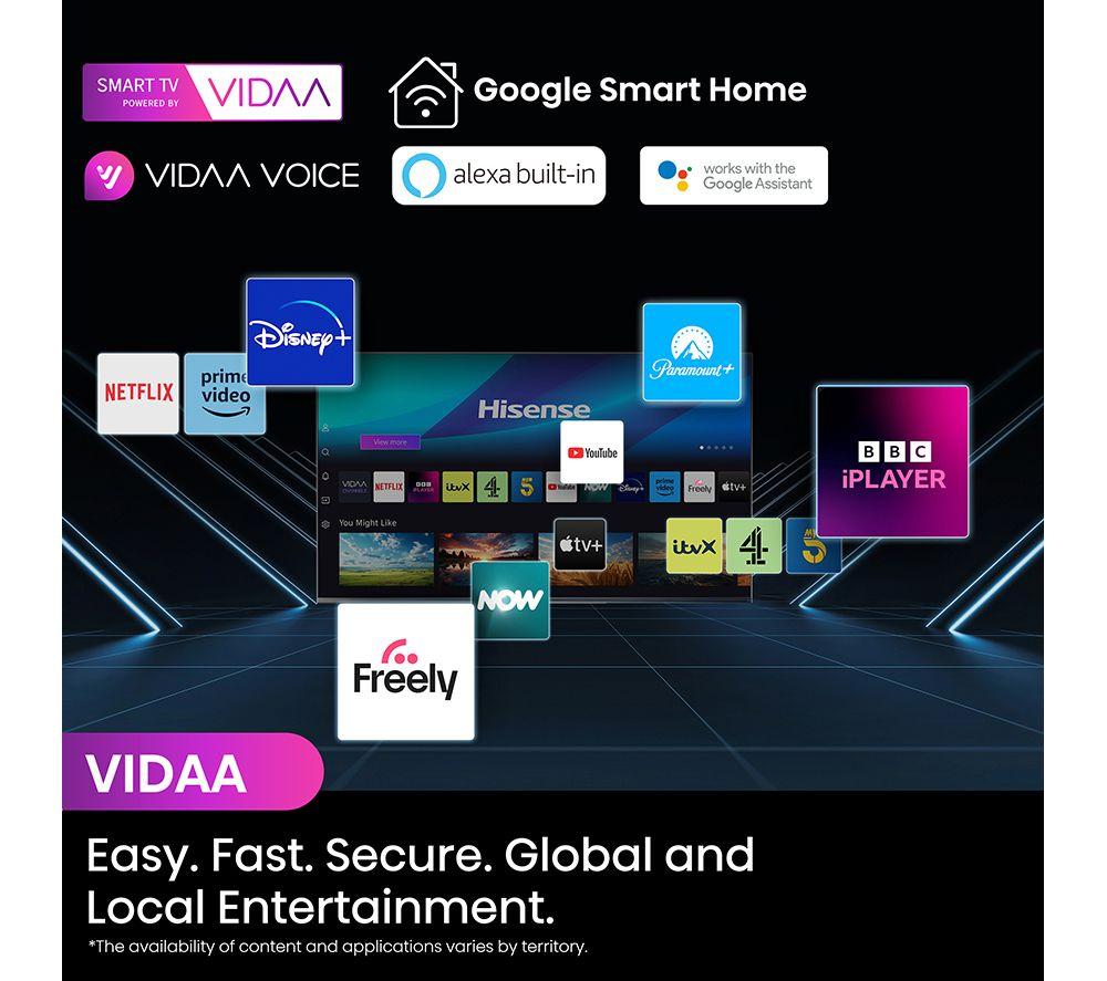 Mini LEDs deliver big drama on this Hisense U7N TV. Thousands of tiny LEDs work in harmony across hundreds of dimming zones for incredibly precise control. No more washed-out looking shows – it's bright and dark in all the right places. The Hi-View Engine is the brains of the operation, turning the mundane into the magnificent by boosting the colours and contrast. Even older films look like they were shot yesterday thanks to 4K AI upscaling. And with Quantum Dot tech, you'll be served up over a billion shades of vivid colours. It really makes documentaries and sport pop.Good to know- Freely brings you live TV channels and on-demand content over WiFi – no aerial, no fees, no hassle- With support for popular HDR formats like Dolby Vision and HDR10+, you're covered for most streaming services- Dolby Atmos serves up a virtual surround sound experience, so you'll feel like you're in the heat of the action- The 2.1 sound system with built-in sub helps you make the most of the Atmos and DTS Virtual:X tech- Stay ahead in the game with the smooth, ultra-responsive 144 Hz Game Mode Pro- IMAX Enhanced brings home the thrill of the cinema with a brilliant picture and immersive audioWhy we love it"The Mini-LED PRO tech with Quantum Dot Colour makes games, films, shows and sports even more lifelike. With over a billion shades of realistic colour, everything from Spiderman's suit to the shirts of your favourite team should really look the part." - Will, Product Copywriter