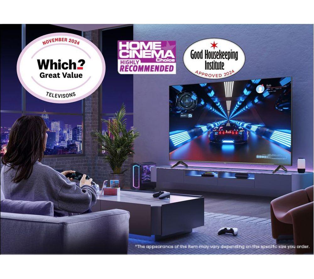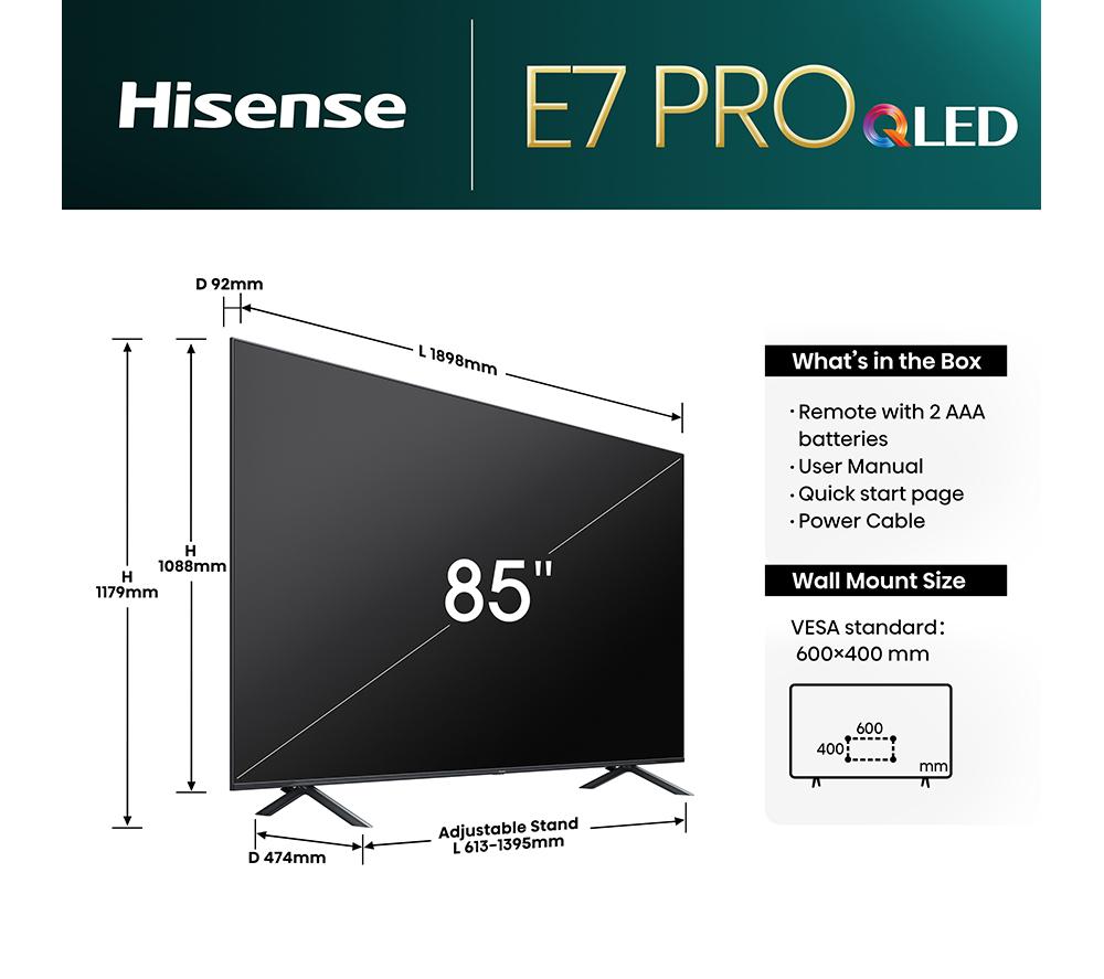 Over a billion shades are brought to life with Quantum Dot Colour on this Hisense E7N TV. It's not just vibrant, colours are served up in a true and natural way. For the perfect balance of light and dark, there's Full Array Local Dimming. Individual zones are tightly packed with LEDs for precise control over the brightness and contrast. The Quad Core 4K processor uses AI to boost the picture frame by frame – even older content gets an upgrade. Fire up your console with 144 Hz Game Mode Pro. With support for VRR and AMD FreeSync Premium Pro, games are super smooth with no screen tearing.Good to know- The Game Bar gives you quick access to settings without leaving your teammates stranded- Dolby Vision HDR boosts the contrast, so you'll see more details – like enemies lurking in the shadows- Dolby Atmos serves up a virtual surround sound experience, so you'll feel like you're in the heat of the action- Stream content from the likes of Netflix, Disney+, and NOW on the VIDAA smart platform- The Wide Viewing Angle means everyone has prime position, wherever they're sitting- Dolby Vision IQ adapts to the light in your room for the best picture any time of the day________________________________Please note: Some apps & services (including tuner) are only available in the UK. Apps & services may be removed or no longer supported by third party content providers at any time. Some apps & services may not be available at launch and may require a firmware update before becoming available. Some services require an account and/or subscription fee.