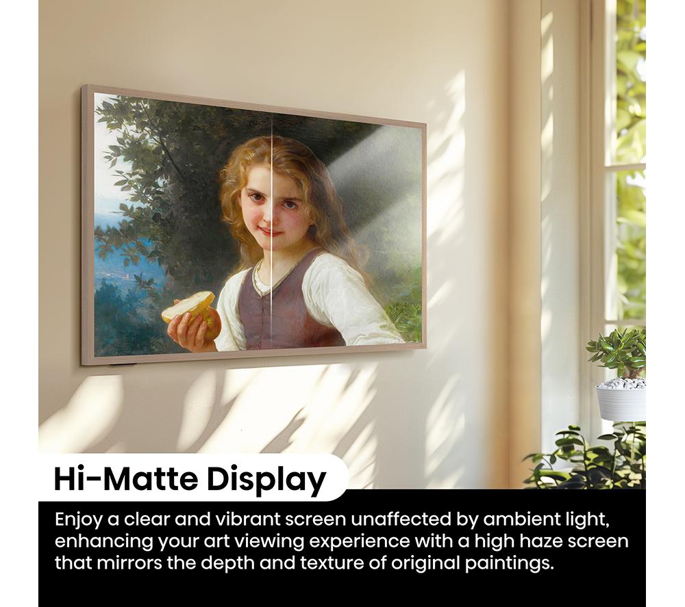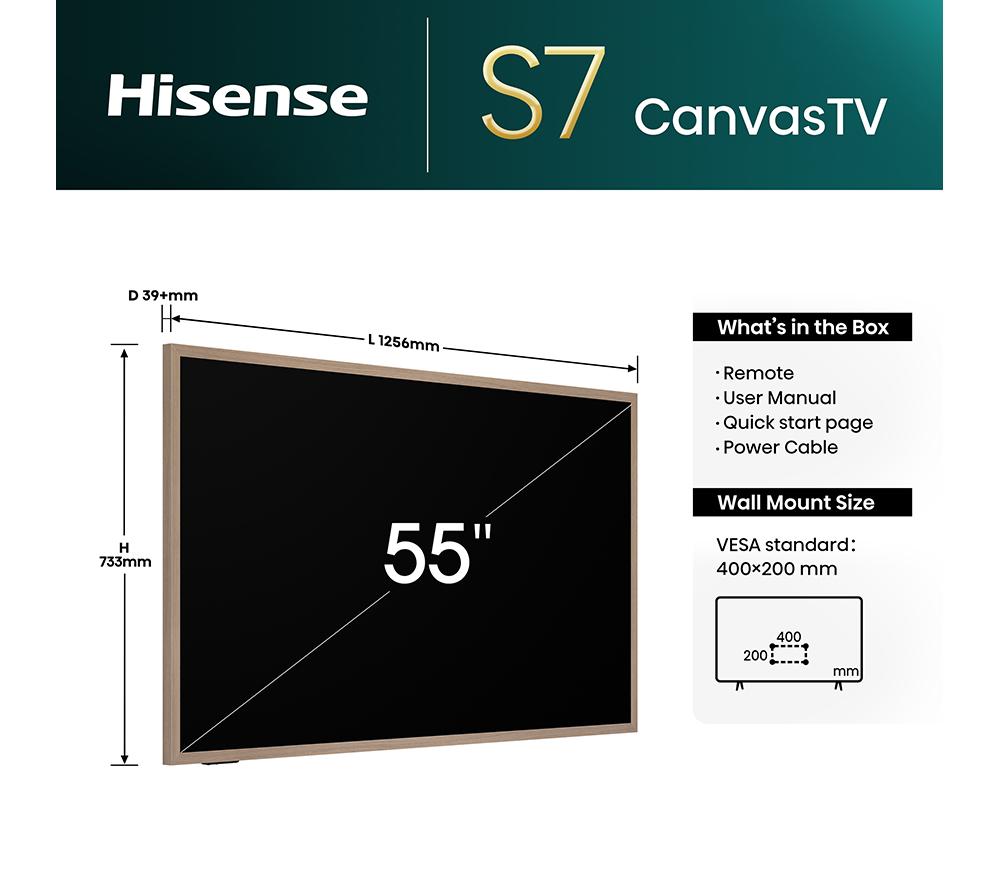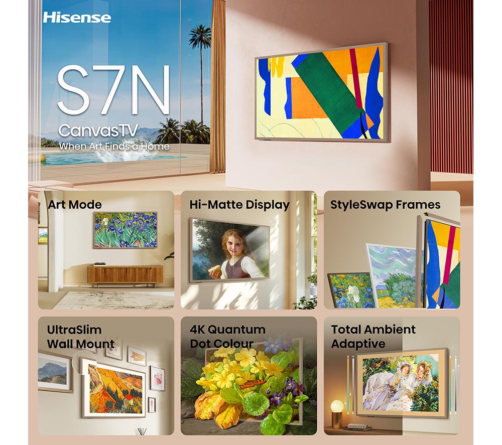 There's always something interesting on the Hisense Canvas TV. Even when you're not watching anything, Art Mode transforms your room into a gallery. Pick from a vast library of iconic pieces to refresh your space in an instant. It looks like the real deal too. The Hi-Matte display is clear and vibrant but keeps glare to a minimum. You can switch up the look to suit your décor with StyleSwap magnetic frames. And the finishing touch has to be the UltraSlim Wall Mount. It hugs your TV close to the wall for a seamless look.Good to know- Over a billion shades are brought to life in a true and natural way with Quantum Dot Colour - The RGB light sensor adapts the brightness and colour temperature for the best view day or night- Movies, games, and music sound super immersive with multi-dimensional 2.0.2 surround sound- Choppy visuals are a thing of the past thanks to Game Mode Pro with a silky smooth 144 Hz refresh rate- Freely brings you live TV channels and on-demand content over WiFi – no aerial, no fees, no hassle- Stream content from the likes of Netflix, Disney+, and NOW on the VIDAA smart platform________________________________Please note: Some apps & services (including tuner) are only available in the UK. Apps & services may be removed or no longer supported by third party content providers at any time. Some apps & services may not be available at launch and may require a firmware update before becoming available. Some services require an account and/or subscription fee.
