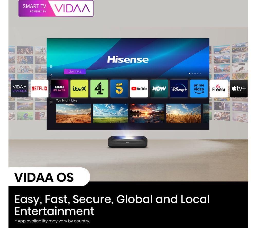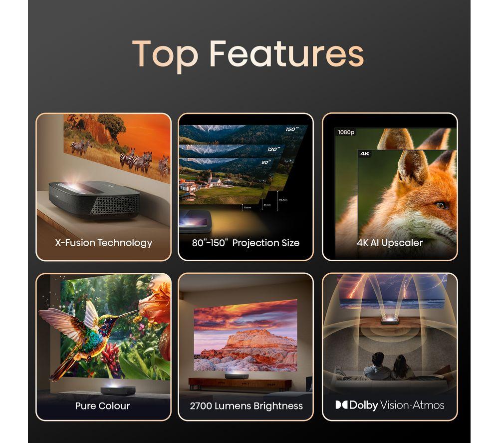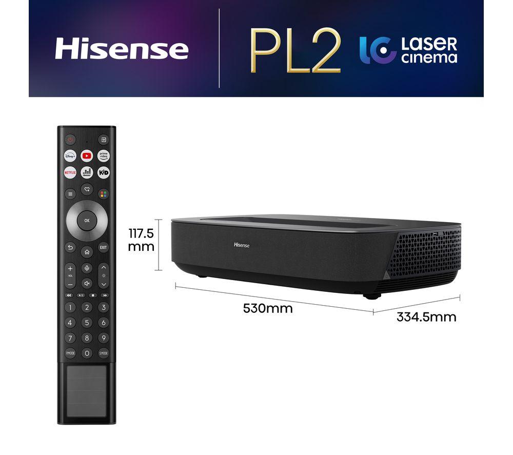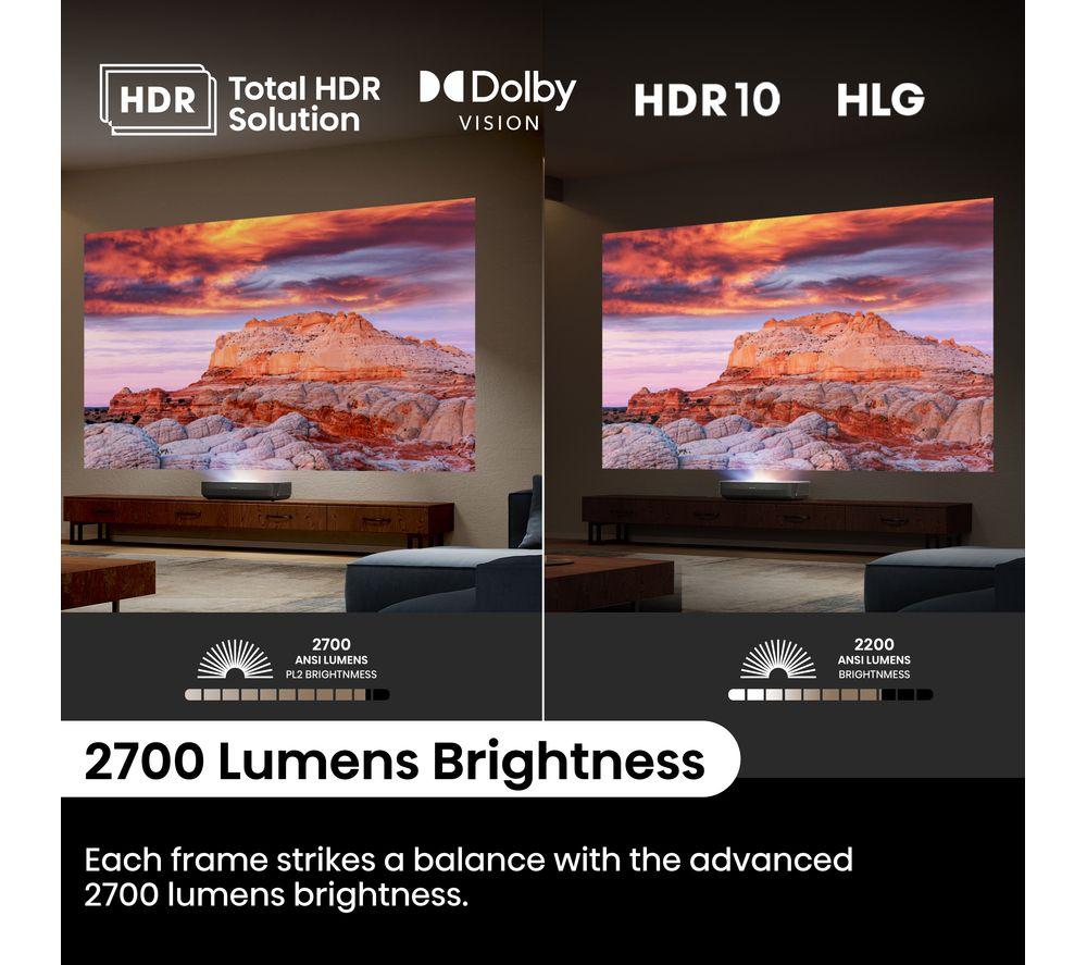 Enjoy epic cinema nights from your living room on this Hisense PL2TUK laser TV projector.No need for a massive space - you can stick this projector right below your screen or wall and still get an epic 150" picture. X-Fusion Laser Technology gives you clear pictures, more natural colours, and over 25,000 hours of entertainment. Enjoy the best of Dolby tech together. Dolby Vision makes the most of the Hisense Pro Laser Engine for deeper colours and sharper images. Dolby Atmos enhances your movies with its surround sound effect.Good to know- Because brightness is key, this offers 2700 lumens for brilliant highlights, colours and deeper blacks- The 4K AI Upscaler takes low-res stuff to a whole new level, making it look sharp and clear- Pure Colour delivers over 1.07 billion hues for realistic images that makes everything pop- Hook it up to your console and go wild with Game Mode and Auto Low Latency Mode- Filmmaker mode retains the original picture settings, so you can watch movies just like the director intended- You'll find your favourite apps like Netflix, Prime Video, and Disney+ on VIDAA smart TV