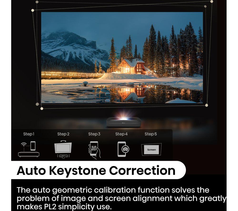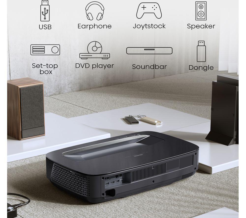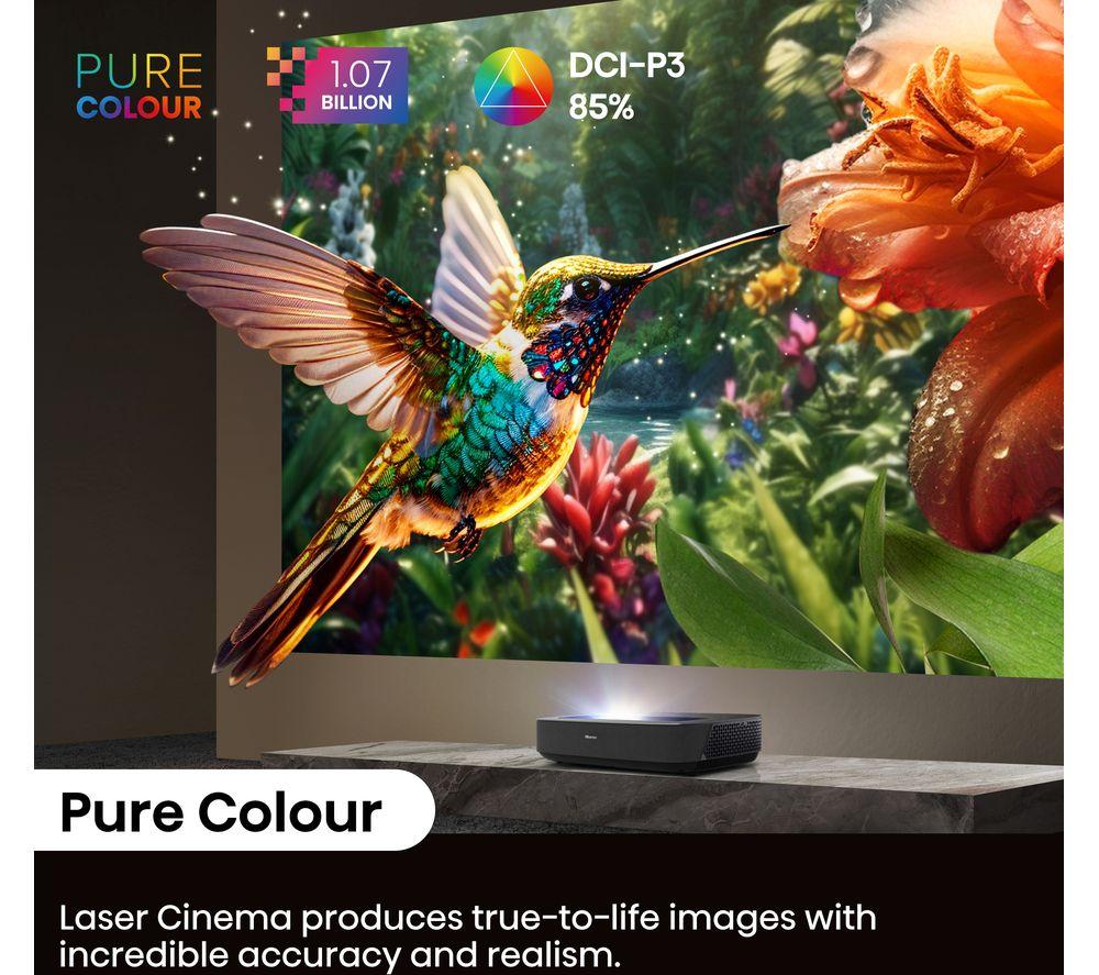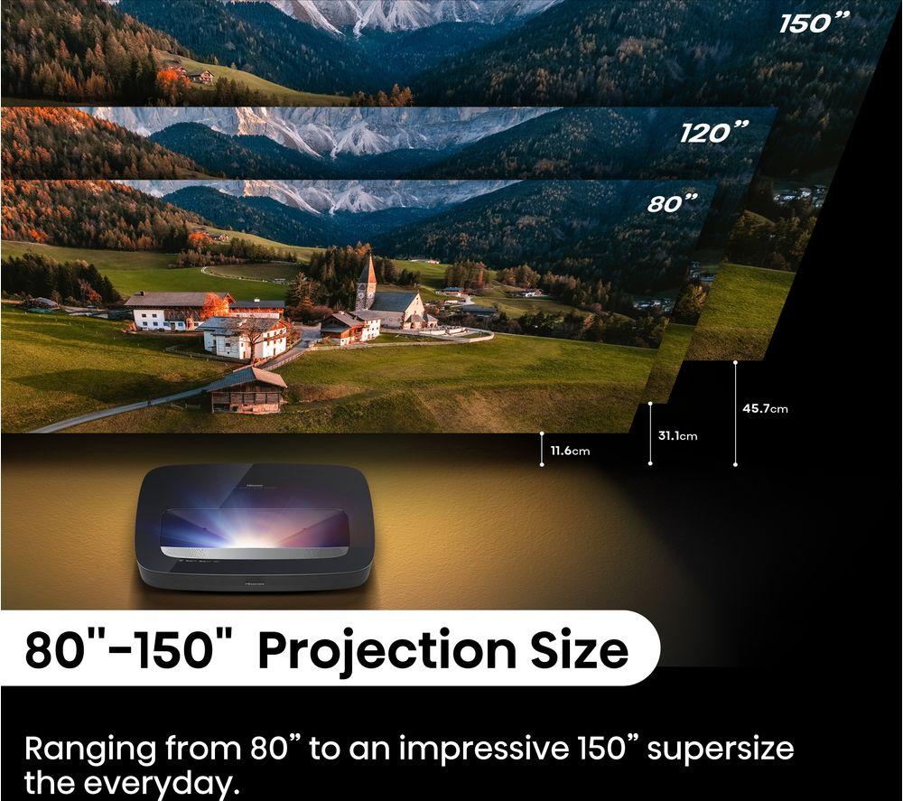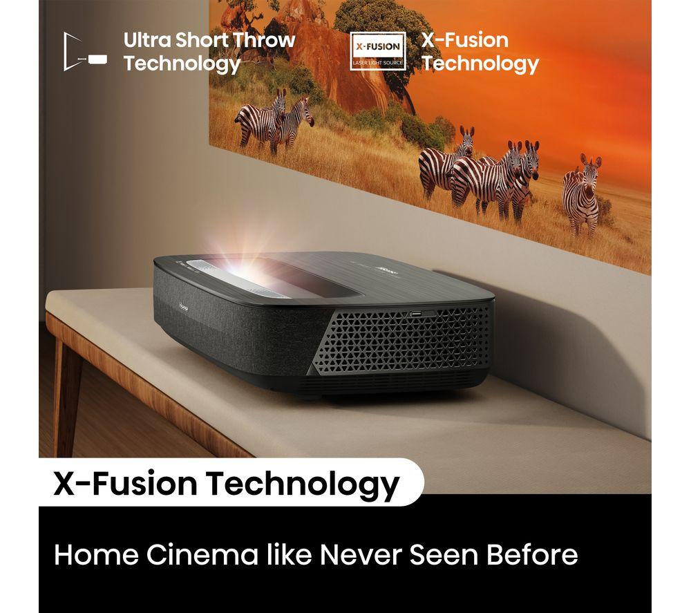 Enjoy epic cinema nights from your living room on this Hisense PL2TUK laser TV projector.No need for a massive space - you can stick this projector right below your screen or wall and still get an epic 150" picture. X-Fusion Laser Technology gives you clear pictures, more natural colours, and over 25,000 hours of entertainment. Enjoy the best of Dolby tech together. Dolby Vision makes the most of the Hisense Pro Laser Engine for deeper colours and sharper images. Dolby Atmos enhances your movies with its surround sound effect.Good to know- Because brightness is key, this offers 2700 lumens for brilliant highlights, colours and deeper blacks- The 4K AI Upscaler takes low-res stuff to a whole new level, making it look sharp and clear- Pure Colour delivers over 1.07 billion hues for realistic images that makes everything pop- Hook it up to your console and go wild with Game Mode and Auto Low Latency Mode- Filmmaker mode retains the original picture settings, so you can watch movies just like the director intended- You'll find your favourite apps like Netflix, Prime Video, and Disney+ on VIDAA smart TV