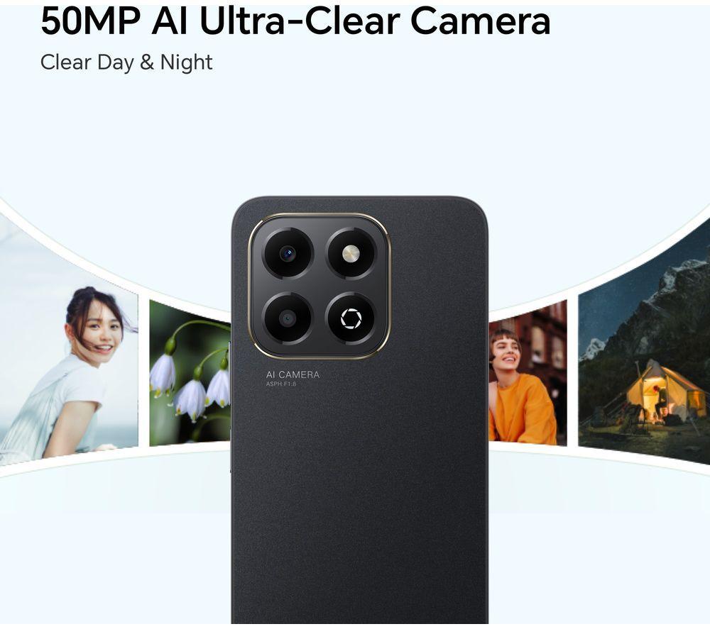 Stay entertained wherever you are. The Honor X6a packs a 6.56” HD+ screen which is just perfect for binging your favourite show and gaming. Its 50 MP camera system enhanced by AI lets you take beautiful landscape photos, clear portraits and cool macro shots. And the huge 5,200 mAh battery gives you up to 17.5 hours of online video streaming. Good to know - Whether you're scrolling, streaming or gaming, the 90 Hz refresh rate will make everything nice and smooth - With facial recognition, you don't even need to touch the phone to unlock it - just smile - There's also a fingerprint scanner in the power button on the side for some extra security - No need to delete apps and photos - you've got 128 GB of storage
