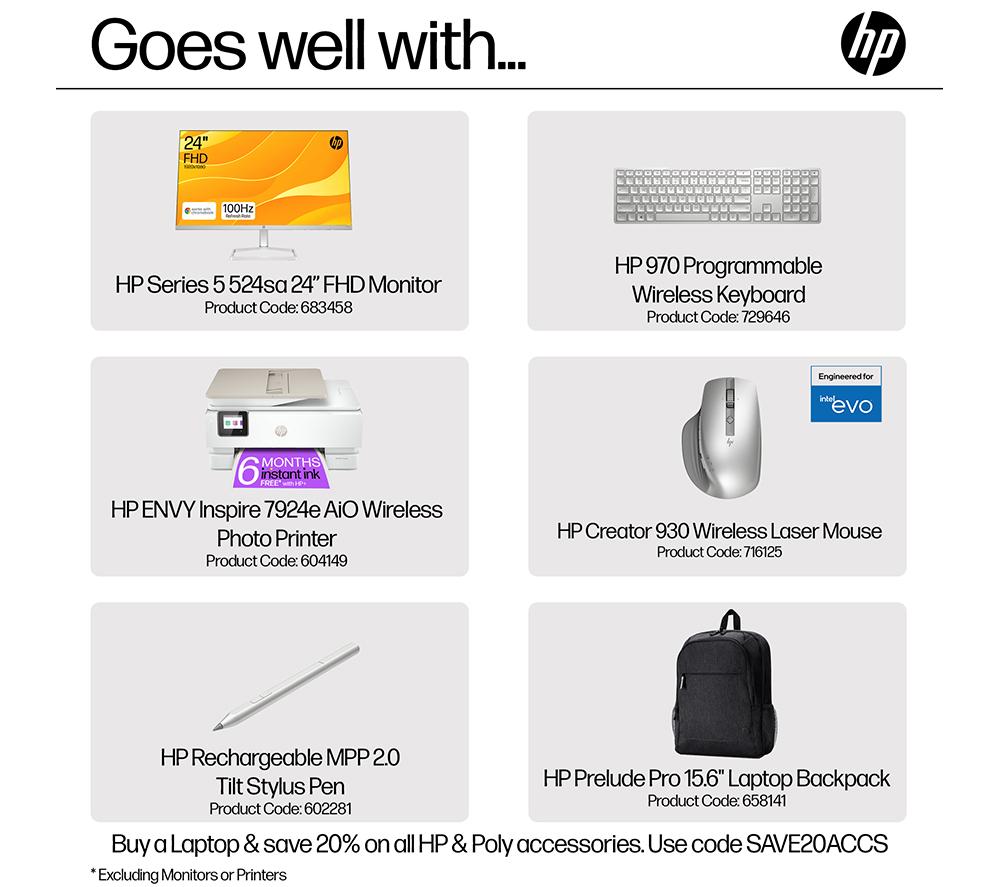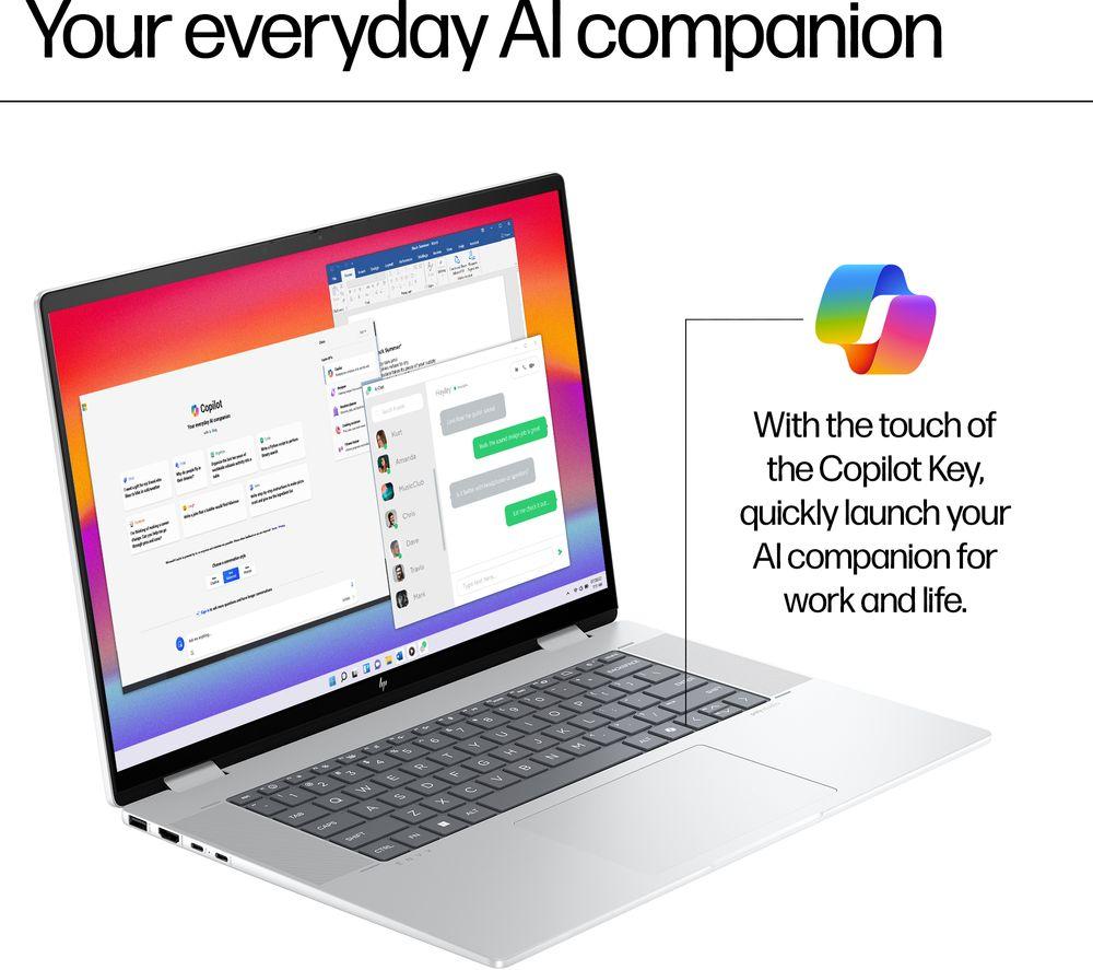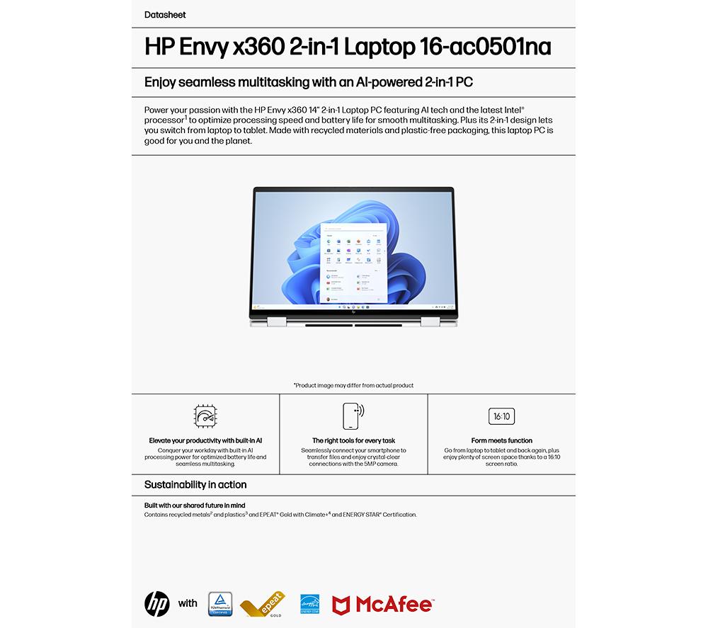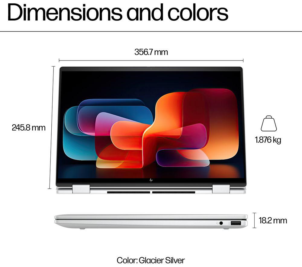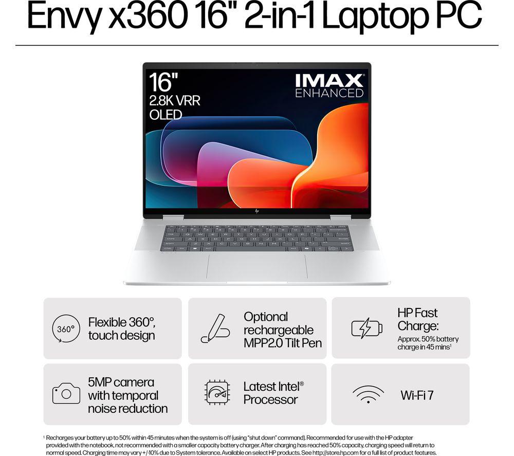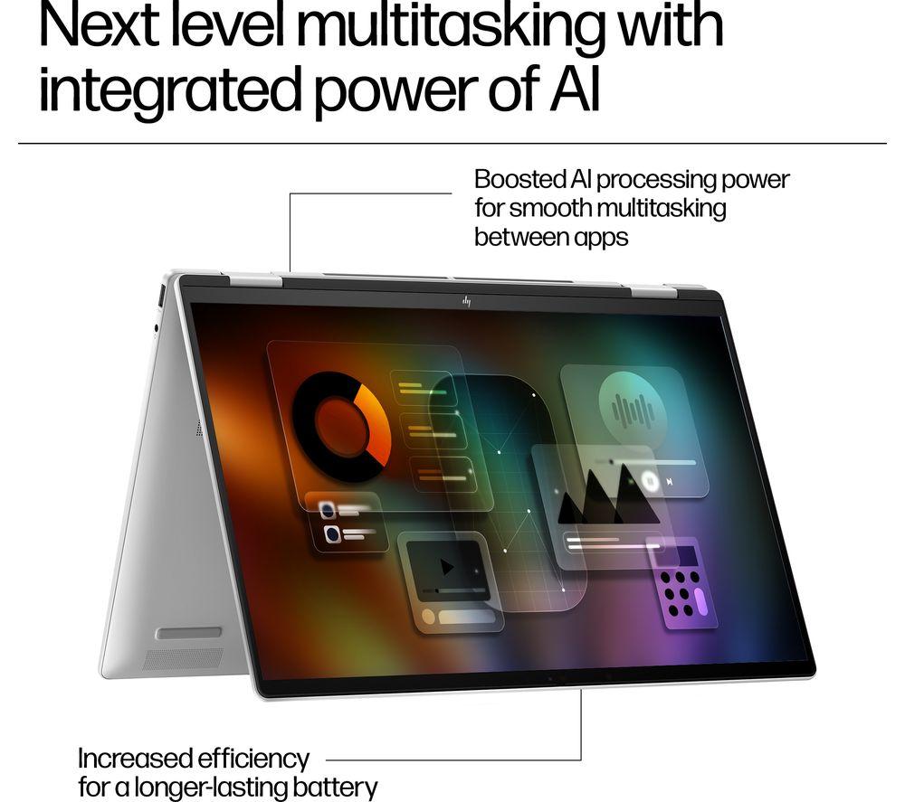 There's no need to choose between a laptop and tablet anymore. With its 360-degree hinge, the HP ENVY x360 offers the best of both worlds. Powered by the Intel® Core™ Ultra 7 processor, it's super-fast and accelerated by AI to be even smarter. Perfect for speeding though work or school assignments. And when you're done, there's a Full HD+ touchscreen. You can swipe through Netflix until you find the perfect show. It's got beautiful colours and high brightness, so you're in for a treat. Good to know - Look your best on work calls - the 5 MP webcam features AI Noise Reduction so you'll be seen clearly by your colleagues - Windows Hello facial recognition is faster and safer than typing in a password - Load up websites and videos in no time thanks to Intel® WiFi 7 - 16 GB of DDR RAM lets you run multiple apps at the same time, including loads of browser tabs - The 512 GB SSD lets you store everything you need and loads up files in an instant___________________________________________________________________________