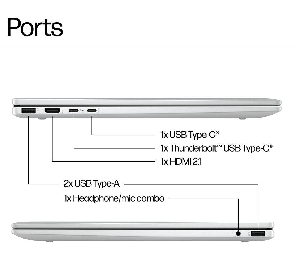 1 USB Type-C® 10Gbps signaling rate (USB Power Delivery, DisplayPort™ 1.4, HP Sleep and Charge) 1 USB Type-A 10Gbps signaling rate (HP Sleep and Charge) 1 USB Type-A 10Gbps signaling rate 1 HDMI-out 2.1 1 headphone/microphone combo 1 Thunderbolt™ 4 with USB Type-C® 40Gbps signaling rate (USB Power Delivery, DisplayPort™ 2.1, HP Sleep and Charge)17