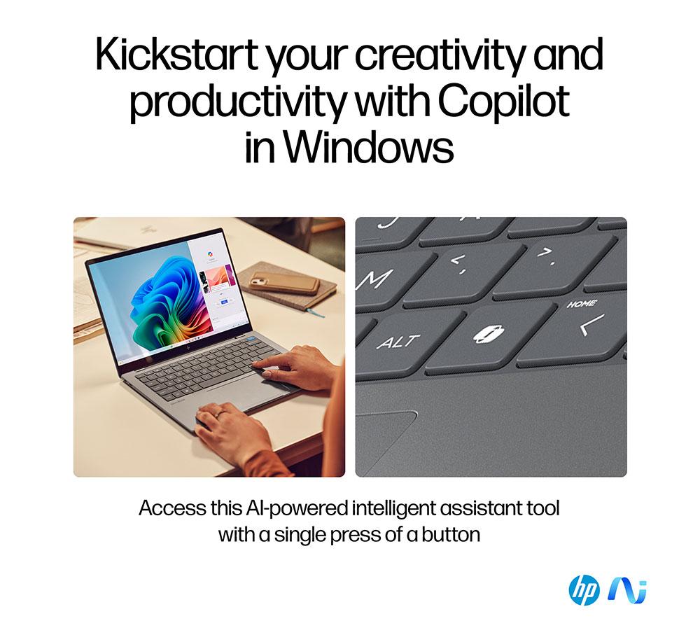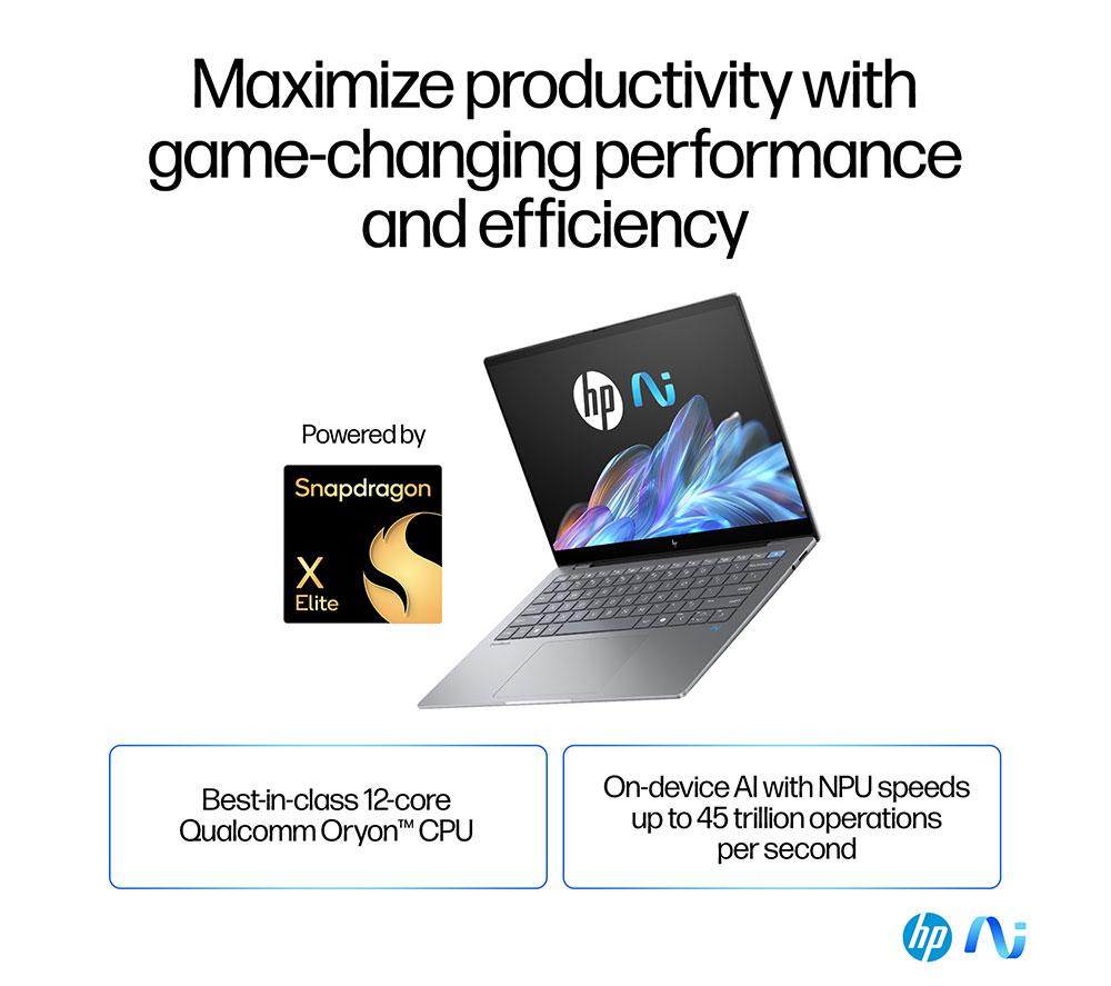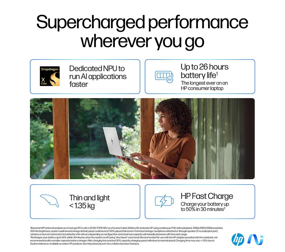 Get some serious work done with this HP OmniBook X. Running the show is the Snapdragon X Elite processor. It's fast, efficient and accelerated by AI to be even smarter. Perfect for speeding though work or school assignments. And it can do it all day long, with up to 26 hours of battery life. With the Adreno integrated GPU, you can even take on photo editing or light gaming. The 2.2K touchscreen is perfect for that. It's got beautiful colours and high brightness, so it's perfect for after-work binges. Good to know - A Copilot+ PC brings the latest AI features so you can work and create faster than ever before- Cocreator can generate amazing images based on your text prompts- With Recall, you can search for documents, emails or web pages by just describing how you remember them- Look your best on video calls with Windows Studio Effects – it can improve lighting and blur your background- With Live Captions you'll never miss a word in the video you're watching- The dedicated Copilot key is your shortcut to all Copilot AI features- Look your best on calls - the 5 MP webcam uses AI Noise Reduction for a clear picture - Windows Hello facial recognition is faster and safer than typing in a password - Load up websites and videos in no time thanks to WiFi 6E - With 512 GB of SSD storage, you have plenty of space for the important stuff - 16 GB of RAM lets you run multiple apps at the same time, including loads of browser tabs________________________________________________________________Snapdragon is a product of Qualcomm Technologies, Inc. and/or its subsidiaries.Please note:Cocreator is optimised for English text prompts. Recall is coming soon through a post-launch Windows Update. Live captions currently support translation for video and audio subtitles into English from 40+ languages. For more information please visit the Microsoft website at aka.ms/copilotpluspcs.