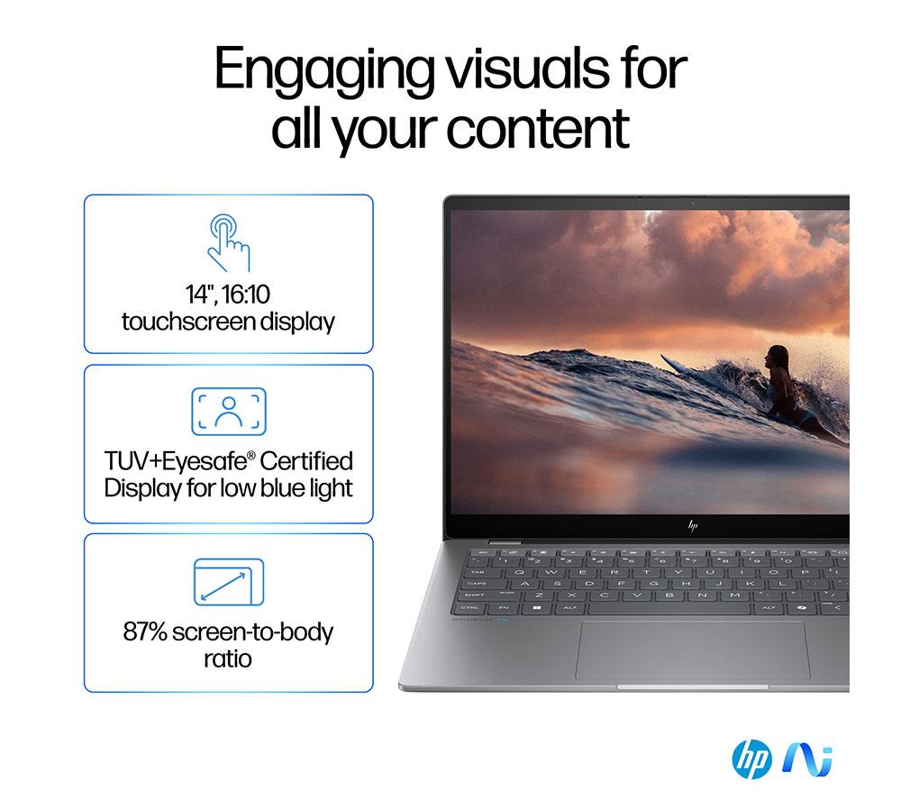 14 inch Eyesafe® Certified Display with a 16:10 aspect ratio14 inch Eyesafe® Certified Display with a 16:10 aspect ratio for creating and editing content, and intuitive touchscreen technology to control your PC directly.9Corning® Gorilla® Glass NBT™With strong, more durable protection, Corning® Gorilla® Glass NBT™ displays stand up to everyday bumps and scrapes.16:10 aspect ratioA 16:10 aspect ratio lets you see more of your content with less scrolling.