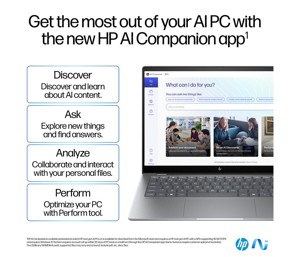HP AI Companion is available preloaded on select HP next gen AI PCs or is available for download from the Microsoft store and requires a HP next gen AI PC with a NPU supporting 40-60 TOPS and requires Windows 11. Perform requires account set up within 30 days of PC boot or enrollment through the HP AI Companion app. Some features require customer upload of local data. Five (5) library 100MB limit each, supported files may vary and at launch include pdf, .txt., .docx files.
