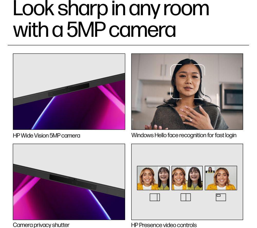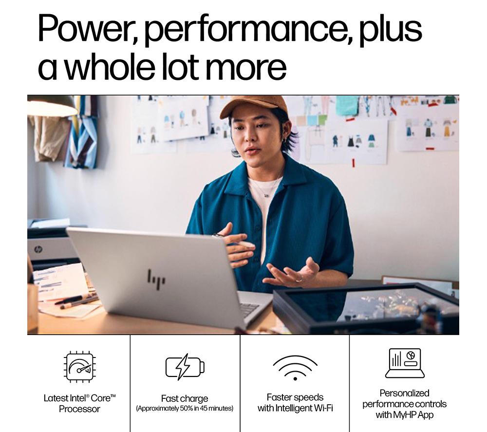 footnote1 Multi-core is designed to improve performance of certain software products. Not all customers or software applications will necessarily benefit from use of this technology. Performance and clock frequency will vary depending on application workload and your hardware and software configurations. Intel’s numbering is not a measurement of higher performance. footnote2 Eyesafe® Display for Low Blue Light is the Display Compliance Test Specification quality. See https://eyesafe.com for more details. footnote3 Based on U.S. EPEAT® registration according to IEEE 1680.1-2018 EPEAT®. EPEAT® status varies by country. Visit www.epeat.net for more information. footnote4 Laptops manufactured with recycled ocean-bound plastic material in product bezel and speaker enclosures, post-consumer recycled plastic in keycaps and scissors and recycled metals in A cover, C cover, D cover, sideband, hinge caps and keyboard supporting plate. Percentage of ocean-bound, post-consumer recycled plastic and recycled metals contained in each component varies by product. footnote5 The flicker-free capability eliminates screen flickering through integrating DC-dimming LED backlights. footnote6 Percentage of post-consumer recycled plastic contained in keycap varies by product. footnote7 Includes recycled metal. footnote8 Internet access required and not included. McAfee is pre-installed on your PC and an account is required for activation. Subscription renewal required after trial period. VPN feature is not available in India, China, Syria or North Korea. McAfee is not compatible with Windows 11 in S mode. You'll need to permanently switch out of S mode. There's no charge to switch out of S mode, but you won't be able to turn it back on. footnote9 Wi-Fi 6E requires a Wi-Fi 6E router, sold separately, to function in the 6GHz band. Availability of public wireless access points limited. Wi-Fi 6E is backwards compatible with prior 802.11 specs. And available in countries where 6GHz is supported. footnote10 Bluetooth® 5.3 operation requires Microsoft OS/Chrome OS support. Until Microsoft OS/Chrome OS support is available, Bluetooth® 5.3 will function as Bluetooth® 5.2 or lower. footnote11 MobileMark 25 Battery life will vary depending on various factors including product model, configuration, loaded applications, features, use, wireless functionality, and power management settings. The maximum capacity of the battery will naturally decrease with time and usage. See https://bapco.com/products/mobilemark-25/ for additional details. footnote12 25 GB of free Dropbox storage for 12 months from date of registration. For complete details and terms of use, including cancellation policies, visit the Dropbox website at https://www.dropbox.com/help/space/hp-promotion. Internet service required and not included. footnote13 Multi-core is designed to improve performance of certain software products. Not all customers or software applications will necessarily benefit from use of this technology. Performance and clock frequency will vary depending on application workload and your hardware and software configurations. Intel’s numbering, branding and/or naming is not a measurement of higher performance. footnote14 Intel® Turbo Boost performance varies depending on hardware, software and overall system configuration. See http://www.intel.com/technology/turboboost/ for more information. footnote15 Percent of active plus nonactive viewing area to active viewing area plus border. Measure with lid vertical to the desk. footnote17 Recharges your battery up to 50% within 30 minutes when the system is off (using “shut down” command). Recommended for use with the HP adapter provided with the notebook, not recommended with a smaller capacity battery charger. After charging has reached 50% capacity, charging speed will return to normal speed. Charging time may vary +/-10% due to System tolerance. Available on select HP products. See http://store.hp.com for a full list of product features. footnote18 For best results with HP Sleep and Charge, use a USB charging protocol standard cable or cable adapter with an external device. footnote19 Based on U.S. EPEAT® registration according to IEEE 1680.1-2018 EPEAT®. EPEAT® status varies by country. Visit www.epeat.net for more information. footnote20 Percentage of ocean-bound plastic contained in each component varies by product. footnote21 Laptops manufactured with recycled metal material in product cover. Percentage of recycled metal varies by product. footnote22 Keyboard components contain post-consumer recycled plastic. Percentage of post consumer recycled contained in each component varies by product. footnote23 Internet access required and not included. McAfee is pre-installed on your PC and an account is required for activation. Subscription renewal required after trial period. VPN feature is not available in India, China, Syria or North Korea. McAfee is not compatible with Windows 11 in S mode. You'll need to permanently switch out of S mode. There's no charge to switch out of S mode, but you won't be able to turn it back on. footnote24 Offer available worldwide (excluding China and embargoed countries or other countries identified as restricted by applicable law or regulation) to new and existing subscribers who are 18+. Click on the Adobe icon in the start menu to redeem a 1-month free trial membership for select Adobe software. The software is tied to the device and is not transferrable. If you would like to sign up for an auto-renewing subscription, you can provide your payment method at sign-up. By adding a payment method, your subscription will automatically renew at the then current rate on your renewal date until you cancel. If you cancel before the end of the one-month free trial, you won’t be charged. You can cancel your subscription anytime via your Adobe Account page or by contacting Customer Support. Please see current prices for Adobe products available in this of