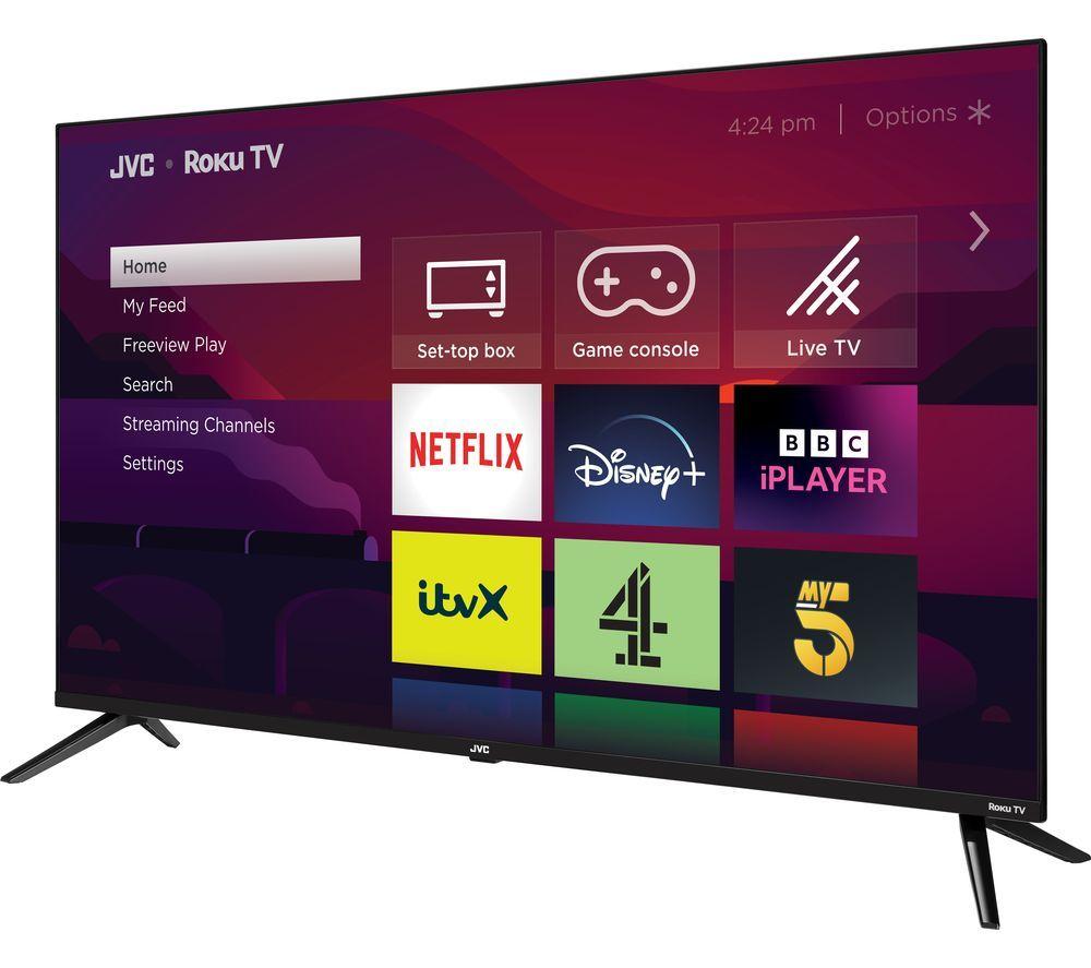You'll never be stuck for entertainment on this JVC 4K Roku TV. Browse over 500,000 movies and shows from streaming services like Netflix, Prime Video, and Disney+. Pick up where you left off – or discover something new – on the customisable home screen. Plus, it all looks great on the 4K Ultra HD display. The light and dark parts of every scene are on point when you're watching Dolby Vision and HDR10 content.Good to know- Catch up on shows straight from the TV guide with Freeview Play- Share your phone screen and stream videos or show photos using Miracast or AirPlay- There are 3 HDMI ports for connecting set top boxes, consoles, and other devices____________________________________________Please note: Some apps & services (including tuner) are only available in the UK. Apps & services may be removed or no longer supported by third party content providers at any time. Some apps & services may not be available at launch and may require a firmware update before becoming available.