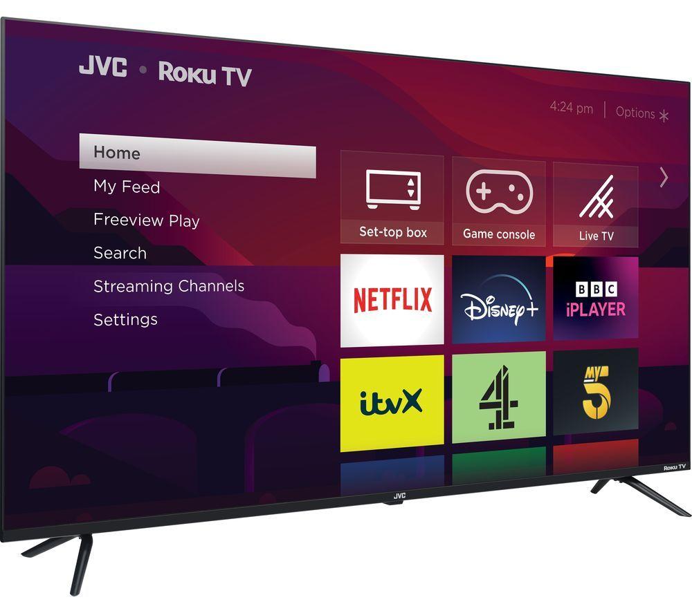 You'll never be stuck for entertainment on this JVC 4K Roku TV. Browse over 500,000 movies and shows from streaming services like Netflix, Prime Video, and Disney+. Pick up where you left off – or discover something new – on the customisable home screen. Plus, it all looks great on the 4K Ultra HD display. The light and dark parts of every scene are on point when you're watching Dolby Vision and HDR10 content.Good to know- Catch up on shows straight from the TV guide with Freeview Play- Share your phone screen and stream videos or show photos using Miracast or AirPlay- There are 3 HDMI ports for connecting set top boxes, consoles, and other devices____________________________________________Please note: Some apps & services (including tuner) are only available in the UK. Apps & services may be removed or no longer supported by third party content providers at any time. Some apps & services may not be available at launch and may require a firmware update before becoming available.