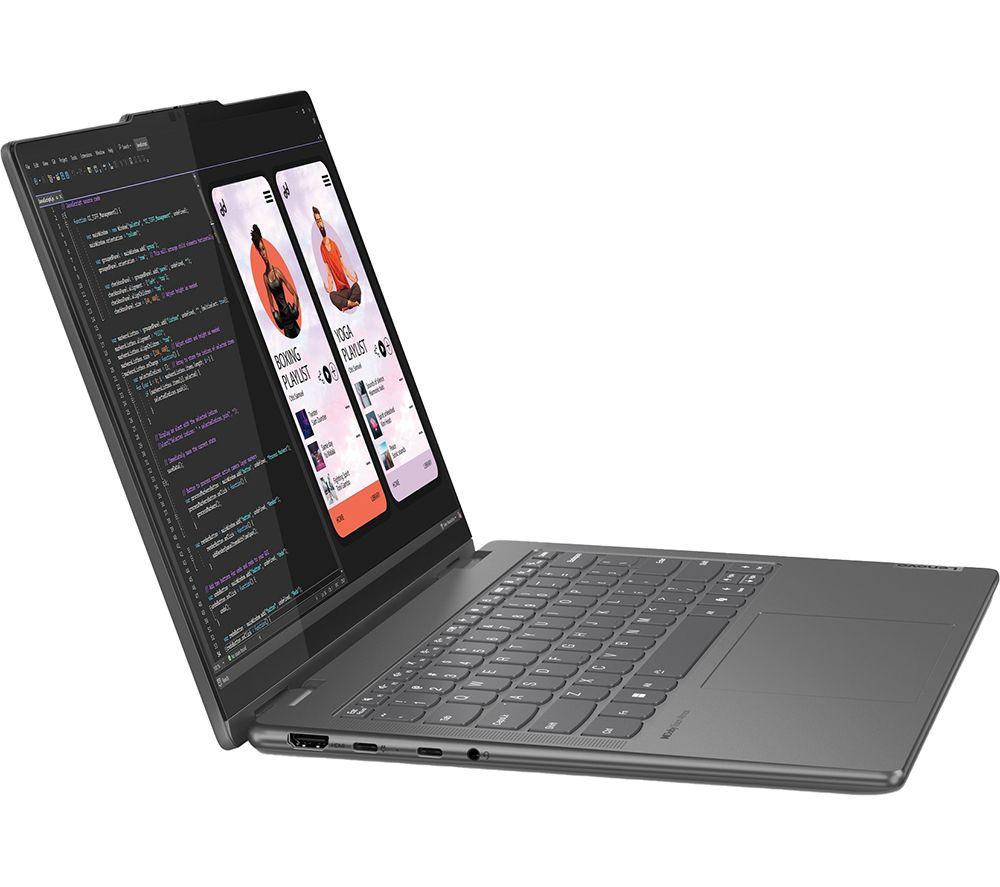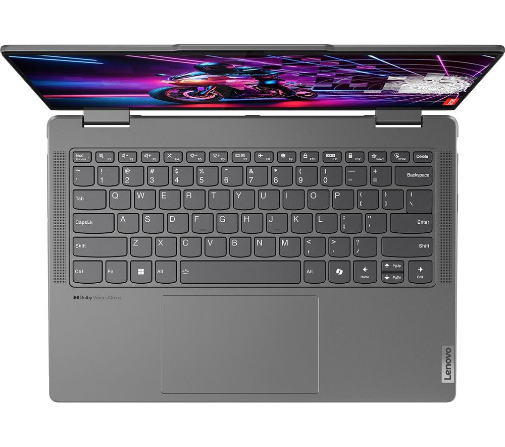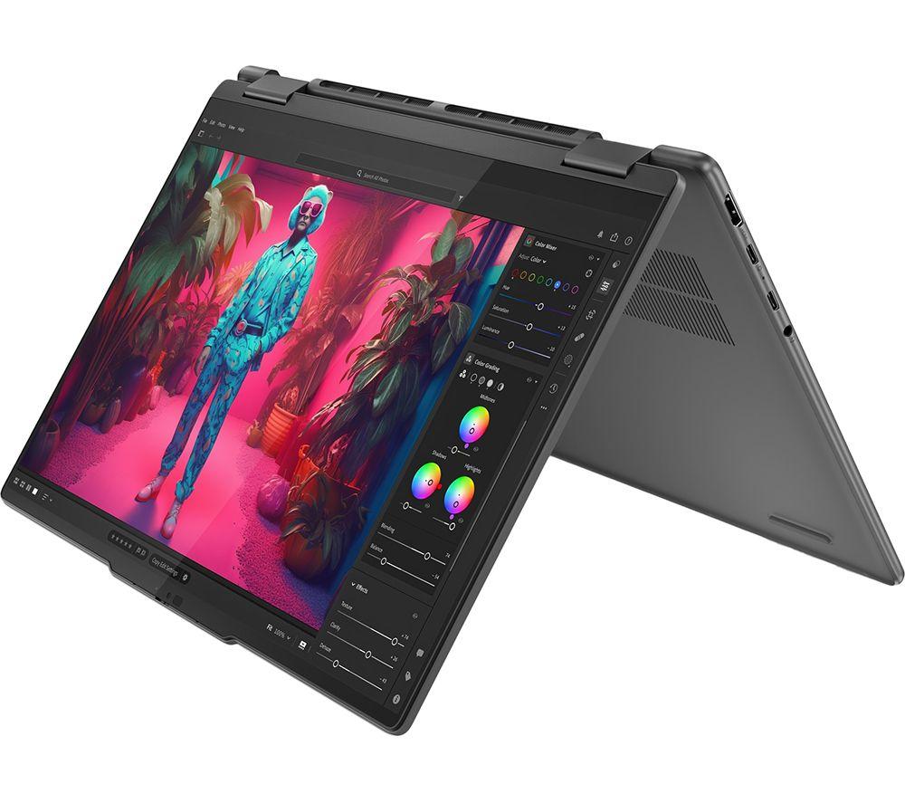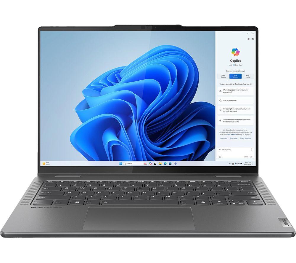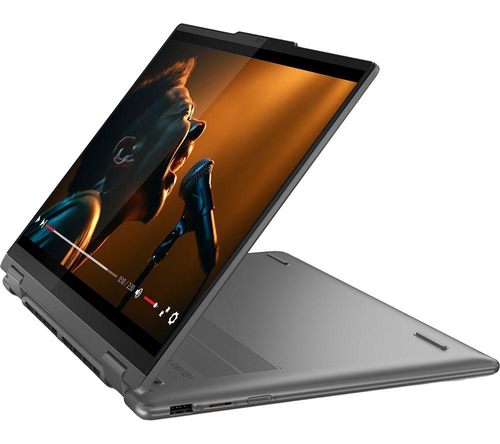 The Lenovo Yoga 7's 2 in 1 design lets you flip from work to play in a blink of an eye. For getting stuff done, the Ryzen 7 processor is a real powerhouse – filled with 16 cores and supercharged by AI. And because it's supported by the integrated Radeon Graphics, there's nothing stopping you from creative work or even gaming. The Full HD+ OLED screen is super crisp and detailed with extra-punchy colours. Pair that with Dolby Vision and Dolby Atmos and all your shows will look and sound properly cinematic. A well-earned treat after a productive day. Good to know - It comes with the Lenovo Digital Pen, so you can sketch, sign and scribble with precision - With 100% DCI-P3 and DisplayHDR 500 you get a wide and accurate colour gamut - perfect for creative work - For secure and speedy sign-ins, you've got Windows Hello facial recognition - You'll look sharp when chatting to friends and colleagues on the Full HD webcam - The webcam privacy shutter lets you decide when you want to be seen on camera - 16 GB of DDR5 RAM can make light work of heavy multi-tasking - You've got loads of room for important files and projects 512 GB of SSD storage - There's a USB 4 port and HDMI 2.1 to handle displays and accessories - Even with all that power, the Yoga 7 still weighs under 1.5 kg __________________________________________________________________________ Intel, the Intel logo, Celeron, Intel Atom, Intel Core, Intel. Experience What's Inside, Intel Inside, the Intel Inside logo, Intel Unite, Iris, Pentium, Thunderbolt, the Thunderbolt logo, and Ultrabook are trademarks of Intel Corporation in the U.S. and/or other countries.