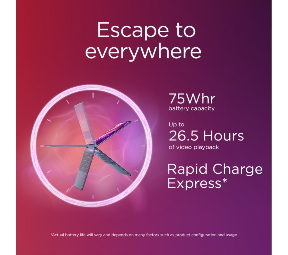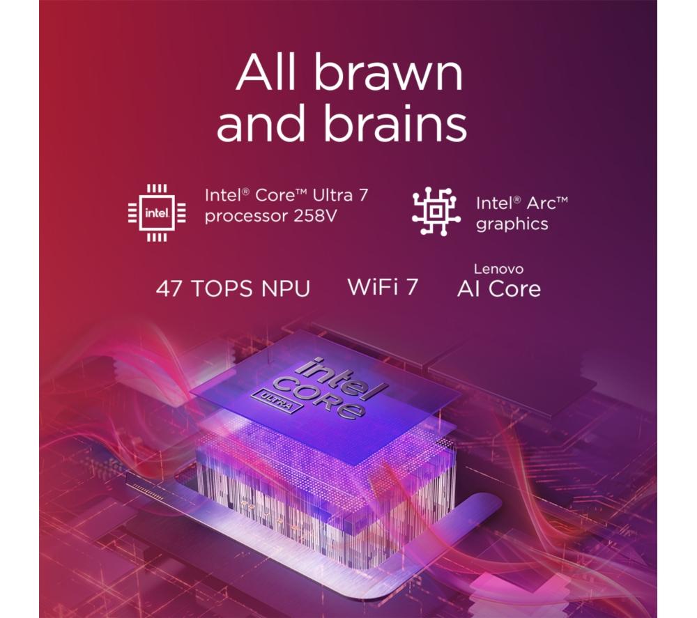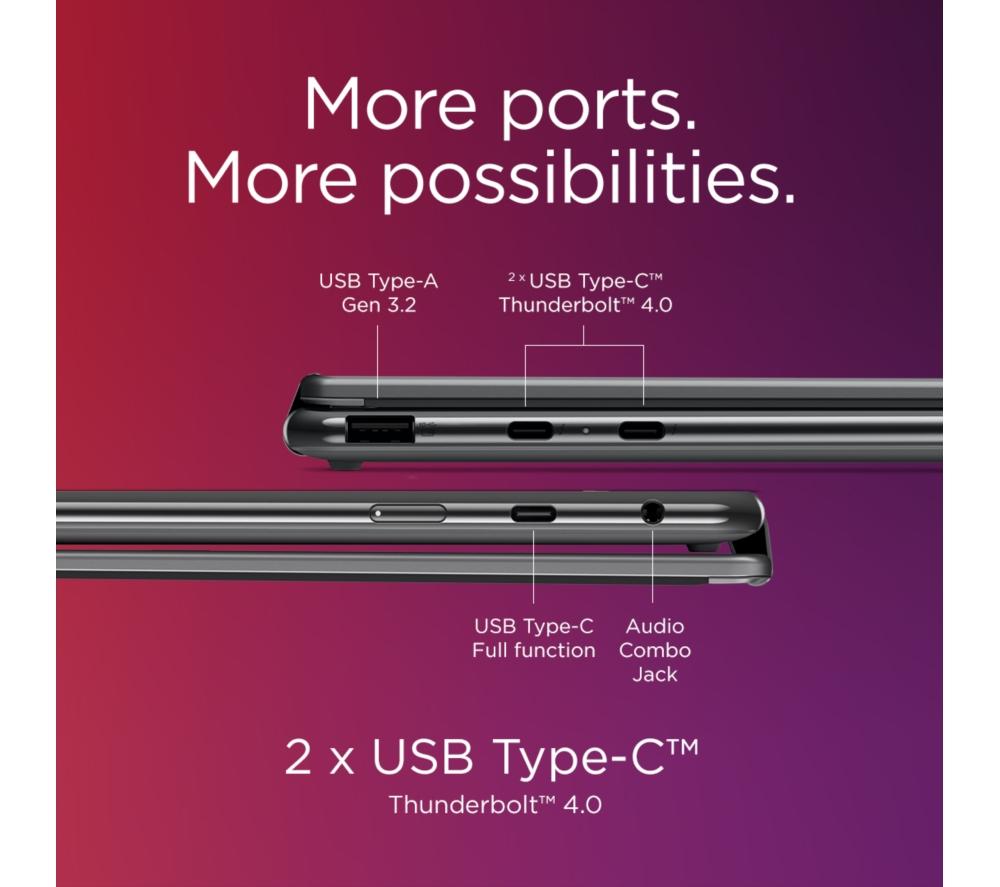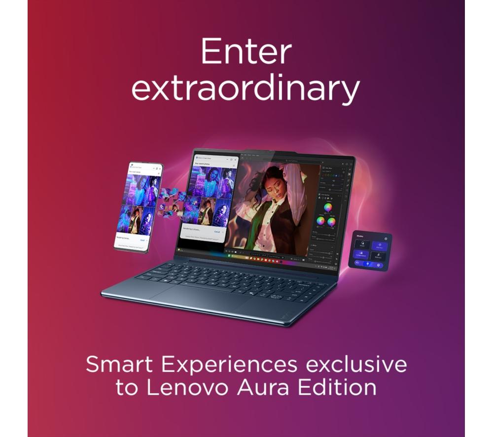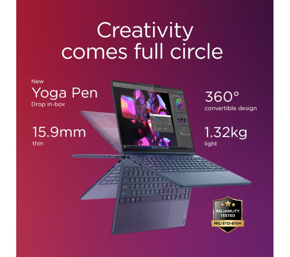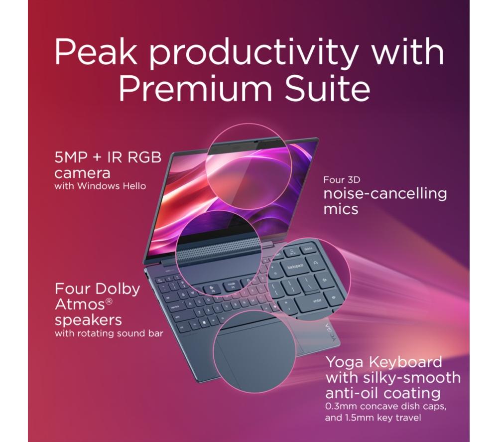 The Lenovo Yoga 9's 2 in 1 design lets you flip from work to play in a blink of an eye. For getting stuff done, the new Intel® Core™ Ultra 7 processor is a real powerhouse – filled with 8 cores and supercharged by AI. And because it's supported by the integrated Intel® Arc™ Graphics, there's nothing stopping you from creative work or even gaming. The 4K OLED touchscreen is super crisp and detailed with extra-punchy colours. Pair that with Dolby Vision and all your shows will look cinematic. A well-earned treat after a productive day. Good to know - A Copilot+ PC brings the latest AI features so you can work and create faster than ever before - It comes with the Lenovo Digital Pen, so you can sketch, sign and scribble with precision - With 100% DCI-P3 and DisplayHDR 500 you get a wide and accurate colour gamut - perfect for creative work - For secure and speedy sign-ins, you've got Windows Hello facial recognition - The webcam privacy shutter lets you decide when you want to be seen on camera - 32 GB of DDR5 RAM can make light work of heavy multi-tasking - You've got loads of room for important files and projects 1 TB of SSD storage - There's two Thunderbolt 4 ports to handle displays, charging and accessories - Even with all that power, the Yoga 9 still weighs under 1.4 kg __________________________________________________________________________ Intel, the Intel logo, Celeron, Intel Atom, Intel Core, Intel. Experience What's Inside, Intel Inside, the Intel Inside logo, Intel Unite, Iris, Pentium, Thunderbolt, the Thunderbolt logo, and Ultrabook are trademarks of Intel Corporation in the U.S. and/or other countries.