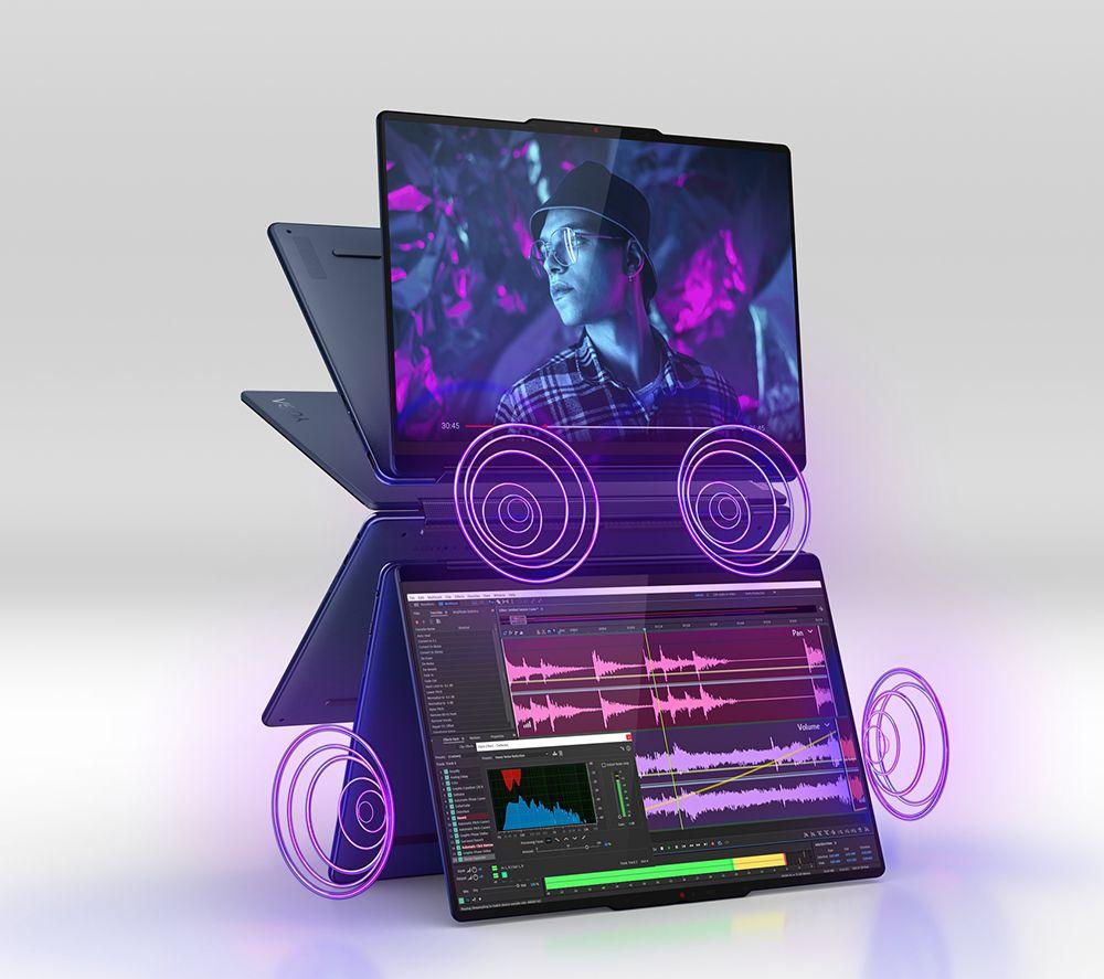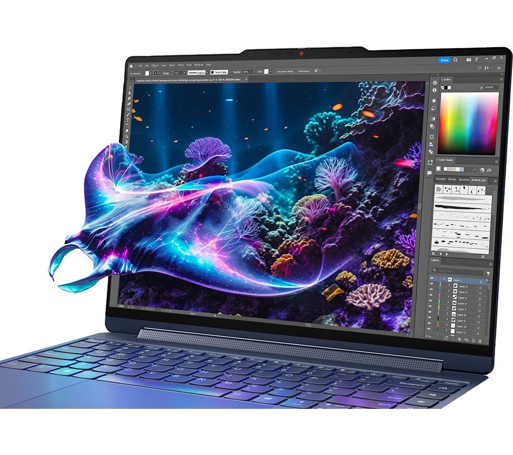 The Lenovo Yoga 9's 2 in 1 design lets you flip from work to play in a blink of an eye. For getting stuff done, the new Intel® Core™ Ultra 7 processor is a real powerhouse – filled with 16 cores and supercharged by AI. And because it's supported by the integrated Intel® Arc™ Graphics, there's nothing stopping you from creative work or even gaming. The 2.8K OLED touchscreen is super crisp and detailed with extra-punchy colours. Pair that with Dolby Vision and all your shows will look cinematic. A well-earned treat after a productive day. Good to know - Everything will feel extra smooth thanks to the display's 120 Hz refresh rate - It comes with the Lenovo Digital Pen, so you can sketch, sign and scribble with precision - With 100% DCI-P3 and DisplayHDR 500 you get a wide and accurate colour gamut - perfect for creative work - For secure and speedy sign-ins, you've got Windows Hello facial recognition - The webcam privacy shutter lets you decide when you want to be seen on camera - 16 GB of DDR5 RAM can make light work of heavy multi-tasking - You've got loads of room for important files and projects 1 TB of SSD storage - There's two Thunderbolt 4 ports to handle displays, charging and accessories - Even with all that power, the Yoga 9 still weighs under 1.4 kg __________________________________________________________________________ Intel, the Intel logo, Celeron, Intel Atom, Intel Core, Intel. Experience What's Inside, Intel Inside, the Intel Inside logo, Intel Unite, Iris, Pentium, Thunderbolt, the Thunderbolt logo, and Ultrabook are trademarks of Intel Corporation in the U.S. and/or other countries.