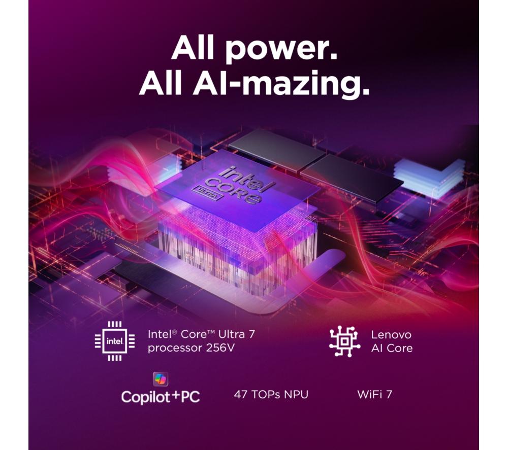 From editing videos to digital art, the Yoga Slim 7 lets you get creative. Running the show is the Intel® Core™ Ultra 7 processor. It's packed full of power and supercharged by AI. And because it's supported by the integrated Intel® Arc™ Graphics, there's nothing stopping you from creative work or even gaming. The Full HD+ OLED screen is super crisp and detailed with extra-punchy colours. Pair that with Dolby Vision and Dolby Atmos and all your shows will look and sound properly cinematic. A well-earned treat after a productive day.Good to know- A Copilot+ PC brings the latest AI features so you can work and create faster than ever before- With 100% DCI-P3 and DisplayHDR 500 you get a wide and accurate colour gamut - perfect for creative work- For secure and speedy sign-ins, you've got Windows Hello facial recognition- You'll look sharp when chatting to friends and colleagues on the Full HD webcam- The webcam privacy shutter lets you decide when you want to be seen on camera- 16 GB of DDR5 RAM can make light work of heavy multi-tasking- There's two Thunderbolt 4 ports and HDMI 2.1 to handle displays and accessories- Even with all that power, the Yoga 7 still weighs under 1.2 kg__________________________________________________________________________Intel, the Intel logo, Celeron, Intel Atom, Intel Core, Intel. Experience What's Inside, Intel Inside, the Intel Inside logo, Intel Unite, Iris, Pentium, Thunderbolt, the Thunderbolt logo, and Ultrabook are trademarks of Intel Corporation in the U.S. and/or other countries.