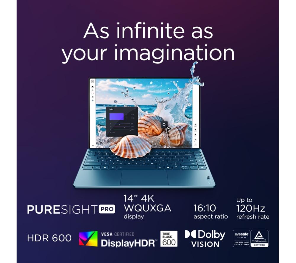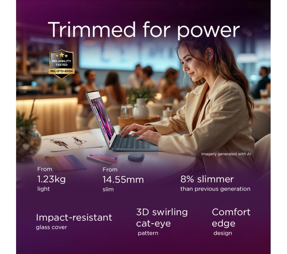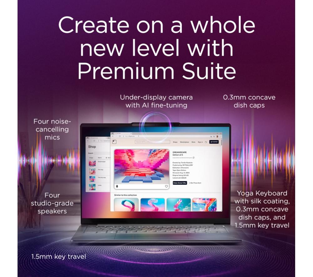 The Yoga Slim 9 is light, compact and packed with power. Running the show is the Intel® Core™ Ultra 7 processor. A real powerhouse filled with 8 cores and supercharged by AI. It's supported by the integrated Intel® Arc™ Graphics, so there's nothing stopping you from creative work or even gaming. Whatever you get into, it'll look amazing on the 4K OLED touchscreen – it's not just rich and vibrant, but also colour-accurate. Perfect for bringing your creative visions to life. And because it runs at a 120 Hz refresh rate, it makes everything looks super-smooth and snappy. Good to know - A Copilot+ PC brings the latest AI features so you can work and create faster than ever before - The Full HD camera is hidden behind the screen, so it doesn't take up any space - With DisplayHDR True Black 600 you'll get incredible contrast and life-like colours - 32 GB of DDR5 RAM can make light work of heavy multi-tasking - You've got loads of room for important files and projects 1TB of SSD storage - There's two Thunderbolt 4 ports to hook up displays and accessories - It's got a fingerprint reader for quick and easy log ins – no password necessary - Even with all that power, the Yoga 9 still weighs just 1.2 kg __________________________________________________________________________ Intel, the Intel logo, Celeron, Intel Atom, Intel Core, Intel. Experience What's Inside, Intel Inside, the Intel Inside logo, Intel Unite, Iris, Pentium, Thunderbolt, the Thunderbolt logo, and Ultrabook are trademarks of Intel Corporation in the U.S. and/or other countries.