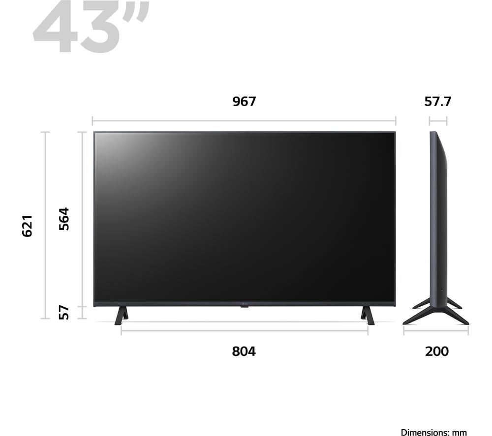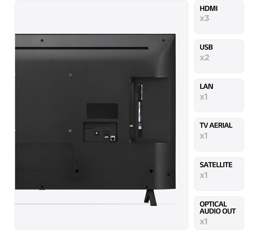 This LG UR78's 4K Ultra HD resolution means your favourite blockbusters look sharp and vibrant with incredible detail. Its High Dynamic Range (HDR) means more accurate colours, improved brightness levels and a deeper contrast. Those movie monsters just got a lot more menacing. With AI Sound, you'll feel the action all around you. It transforms 2-channel audio into virtual 5.1 surround sound for that movie theatre experience, only without the never-ending trailers. And Filmmaker Mode turns off any picture processing that can make movies look unnatural, so you can enjoy them the way the director intended.Good to know- Game Optimiser fine tunes your settings, so your games look and sound their best and run smoothly – your enemies don't stand a chance- Its modern, slim design will instantly become the focal point of your room and looks great on the wall or a TV cabinet- AI Acoustic Tuning uses the mic on your remote to tweak the TV's audio settings based on the size and shape of your room- Access all your favourite apps like Netflix, Prime Video, Disney+ and loads more via LG's webOS smart platform________________________________Please note: Some apps & services (including tuner) are only available in the UK. Apps & services may be removed or no longer supported by third party content providers at any time. Some apps & services may not be available at launch and may require a firmware update before becoming available. Some services require an account and/or subscription fee.