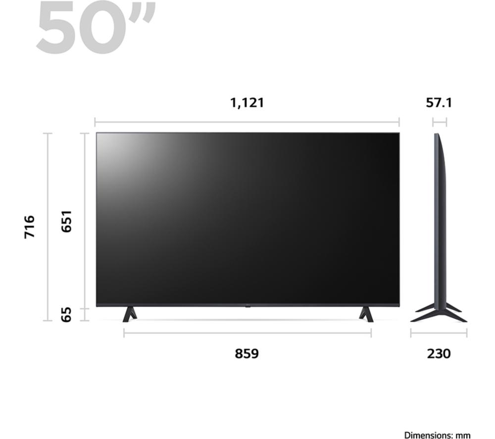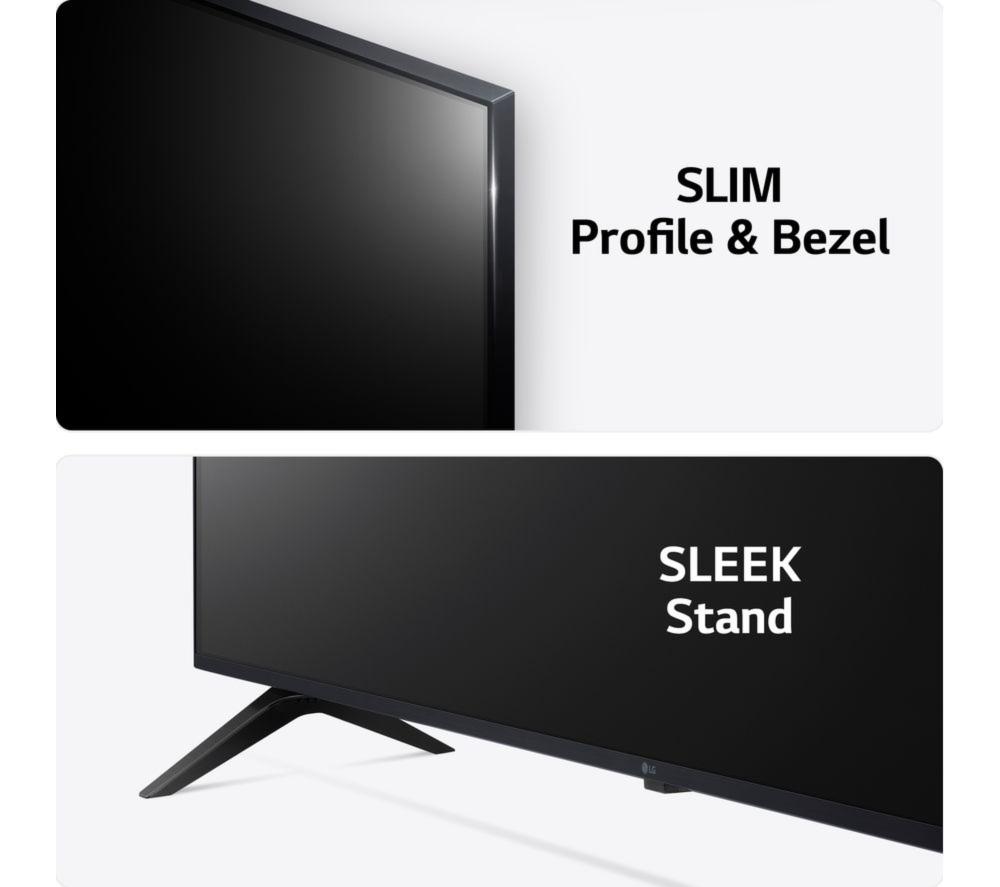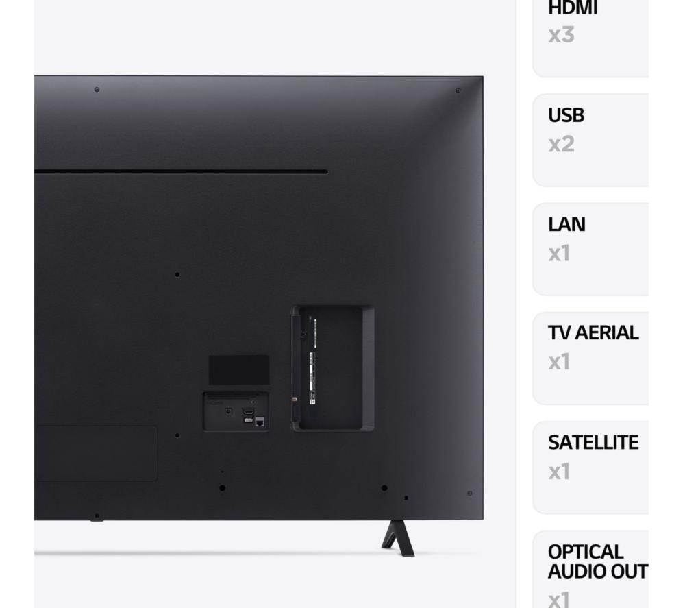 This LG UR78's 4K Ultra HD resolution means your favourite blockbusters look sharp and vibrant with incredible detail. Its High Dynamic Range (HDR) means more accurate colours, improved brightness levels and a deeper contrast. Those movie monsters just got a lot more menacing. With AI Sound, you'll feel the action all around you. It transforms 2-channel audio into virtual 5.1 surround sound for that movie theatre experience, only without the never-ending trailers. And Filmmaker Mode turns off any picture processing that can make movies look unnatural, so you can enjoy them the way the director intended.Good to know- Game Optimiser fine tunes your settings, so your games look and sound their best and run smoothly – your enemies don't stand a chance- Its modern, slim design will instantly become the focal point of your room and looks great on the wall or a TV cabinet- AI Acoustic Tuning uses the mic on your remote to tweak the TV's audio settings based on the size and shape of your room- Access all your favourite apps like Netflix, Prime Video, Disney+ and loads more via LG's webOS smart platform________________________________Please note: Some apps & services (including tuner) are only available in the UK. Apps & services may be removed or no longer supported by third party content providers at any time. Some apps & services may not be available at launch and may require a firmware update before becoming available. Some services require an account and/or subscription fee.