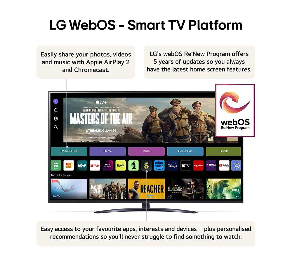 Settle down for movie night with the LG UT81. Every scene pops on the sharp and vibrant 4K Ultra HD display – even lower resolution content gets an upgrade with 4K upscaling. The a5 AI processor is the brain of the TV. It's hard at work in the background, intelligently boosting the picture and sound of everything you watch. Plus, you'll always get just the right picture with AI Brightness Control – it uses the TV's ambient sensor to adapt to the light in the room. Discover the show's everyone's talking about on webOS, LG's smart platform. You'll find all your favourite apps, including Netflix, Disney+, and Prime Video.Good to know- Filmmaker Mode turns off any picture processing that can make movies look unnatural, so it's closer to cinema-quality- When you watch HDR content, you'll see the difference with improved brightness and contrast- Game Optimiser fine tunes your settings, so your games look and sound their best and run smoothly- AI Sound Pro transforms 2-channel audio into virtual 9.1.2 surround sound for that movie theatre experience- The modern design looks great in any space – and the unique crescent-shaped stand is a real eye-catcherWhy we love it'This TV is packed with handy AI, just like your favourite sci-fi flick. Its AI Brightness Control sensors adapt to the level of light in the room, making sure whatever you're watching looks picture perfect at all times.' - Will, Product Copywriter________________________________Please note: Some apps & services (including tuner) are only available in the UK. Apps & services may be removed or no longer supported by third party content providers at any time. Some apps & services may not be available at launch and may require a firmware update before becoming available. Some services require an account and/or subscription fee.