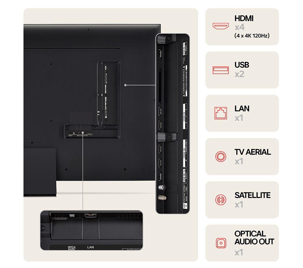 The grass really is greener with the LG QNED86 TV. Quantum Dot Nanocell technology makes your entertainment pop with 100% colour volume. It's not just vibrant, it's true-to-life with a full spectrum of tones that LCD TVs didn't quite nail before. The a8 AI Processor is the brains behind the operation. It's borrowed some tricks from the big-league OLED TVs to bring you super sharp images and sound that feels like it's all around you. Older entertainment is given a new lease of life with AI Super Upscaling while AI Sound Pro transforms 2-channel audio into virtual 9.1.2 surround sound for that cinema experience. Speaking of entertainment, you'll be spoilt for choice. There's something for the whole family on webOS, LG's smart platform which includes Netflix, Disney+ and a whole lot more.Good to know- Filmmaker Mode turns off any picture processing that can make movies look unnatural, so it's closer to cinema-quality- When you watch HDR content, you'll see the difference with improved brightness and contrast- Prefer warmer over cooler shades? You can pick your picture preferences with the AI Picture Wizard- The super-slim design looks good in any space whether you're using the stand or wall mounting (mount sold separately)- Get the most out of your console with support for 4K@120 Hz and more gaming tech than you can shake a controller at- Motion Pro makes fast paced sports and movies look smooth, so it's easy to keep up with the action________________________________Please note: Some apps & services (including tuner) are only available in the UK. Apps & services may be removed or no longer supported by third party content providers at any time. Some apps & services may not be available at launch and may require a firmware update before becoming available. Some services require an account and/or subscription fee.
