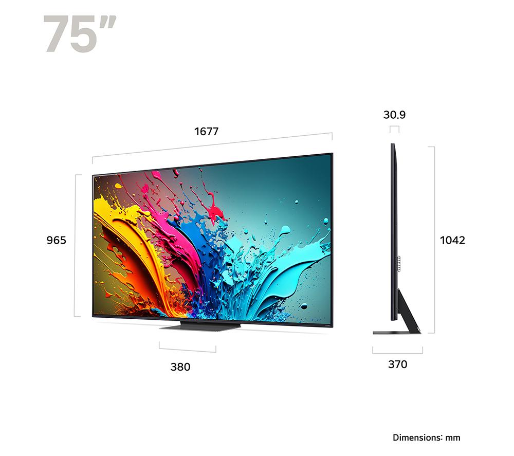 The grass really is greener with the LG QNED86 TV. Quantum Dot Nanocell technology makes your entertainment pop with 100% colour volume. It's not just vibrant, it's true-to-life with a full spectrum of tones that LCD TVs didn't quite nail before. The a8 AI Processor is the brains behind the operation. It's borrowed some tricks from the big-league OLED TVs to bring you super sharp images and sound that feels like it's all around you. Older entertainment is given a new lease of life with AI Super Upscaling while AI Sound Pro transforms 2-channel audio into virtual 9.1.2 surround sound for that cinema experience. Speaking of entertainment, you'll be spoilt for choice. There's something for the whole family on webOS, LG's smart platform which includes Netflix, Disney+ and a whole lot more.Good to know- Filmmaker Mode turns off any picture processing that can make movies look unnatural, so it's closer to cinema-quality- When you watch HDR content, you'll see the difference with improved brightness and contrast- Prefer warmer over cooler shades? You can pick your picture preferences with the AI Picture Wizard- The super-slim design looks good in any space whether you're using the stand or wall mounting (mount sold separately)- Get the most out of your console with support for 4K@120 Hz and more gaming tech than you can shake a controller at- Motion Pro makes fast paced sports and movies look smooth, so it's easy to keep up with the action________________________________Please note: Some apps & services (including tuner) are only available in the UK. Apps & services may be removed or no longer supported by third party content providers at any time. Some apps & services may not be available at launch and may require a firmware update before becoming available. Some services require an account and/or subscription fee.