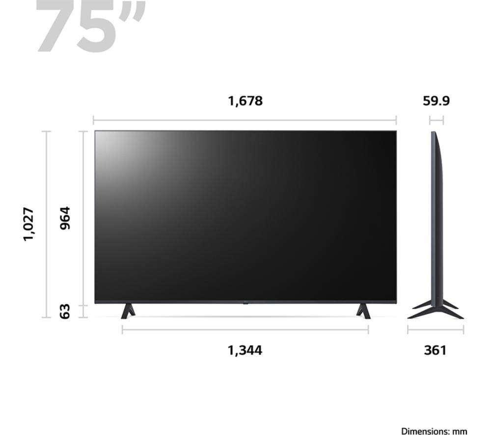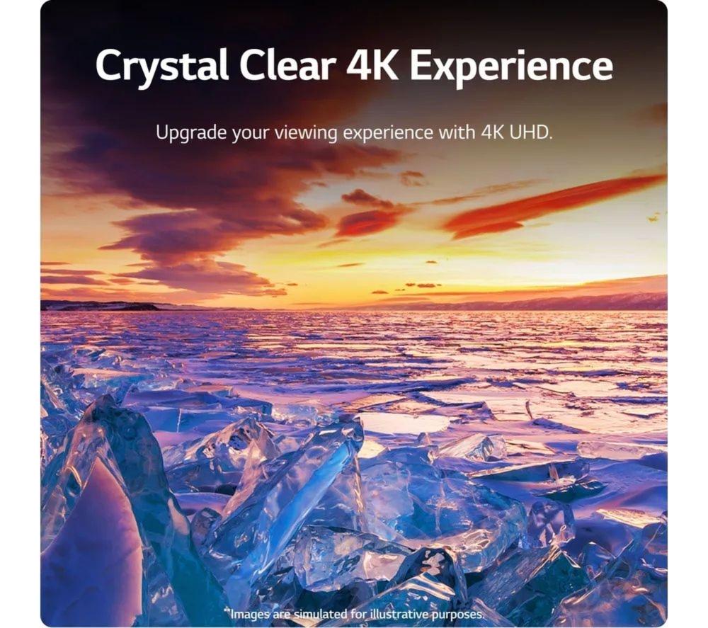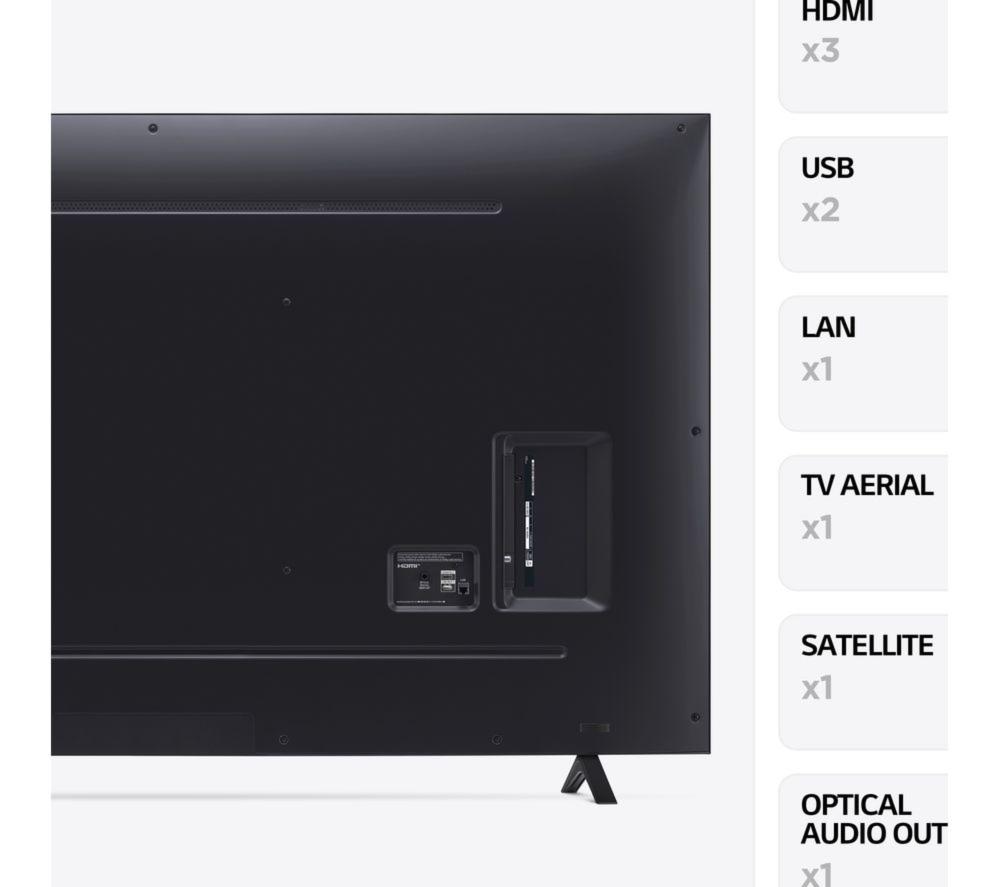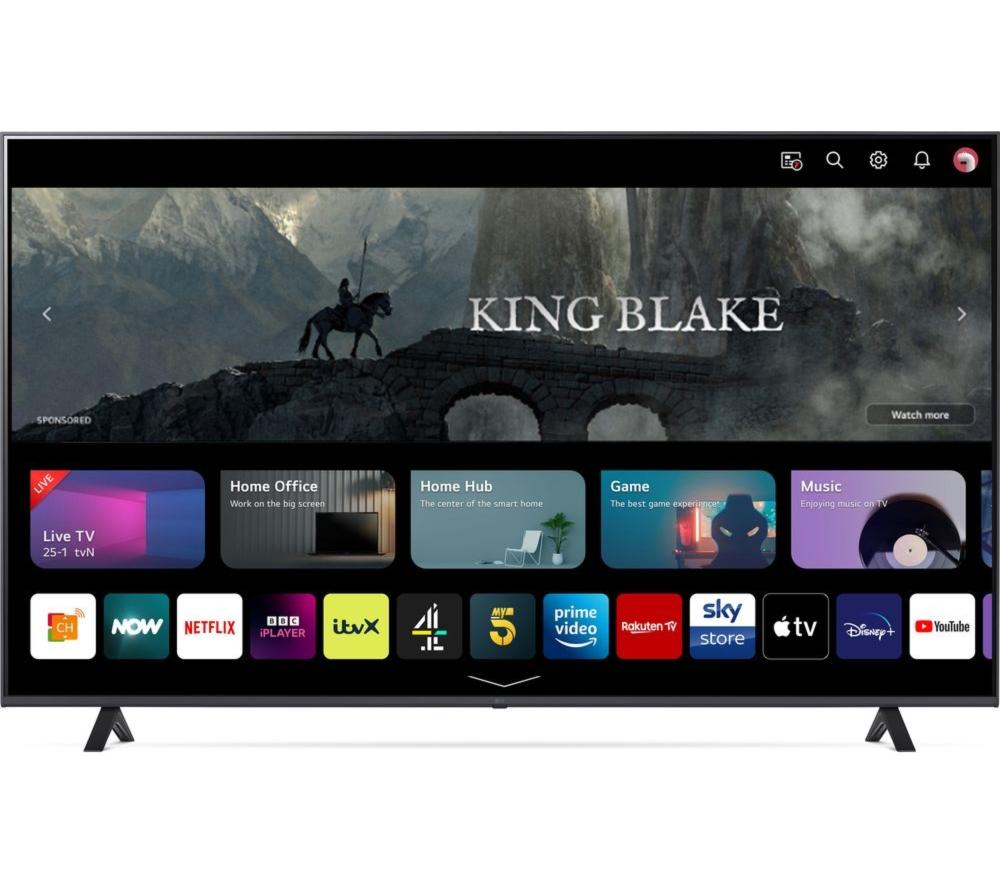 This LG UR78's 4K Ultra HD resolution means your favourite blockbusters look sharp and vibrant with incredible detail. Its High Dynamic Range (HDR) means more accurate colours, improved brightness levels and a deeper contrast. Those movie monsters just got a lot more menacing. With AI Sound, you'll feel the action all around you. It transforms 2-channel audio into virtual 5.1 surround sound for that movie theatre experience, only without the never-ending trailers. And Filmmaker Mode turns off any picture processing that can make movies look unnatural, so you can enjoy them the way the director intended.Good to know- Game Optimiser fine tunes your settings, so your games look and sound their best and run smoothly – your enemies don't stand a chance- Its modern, slim design will instantly become the focal point of your room and looks great on the wall or a TV cabinet- AI Acoustic Tuning uses the mic on your remote to tweak the TV's audio settings based on the size and shape of your room- Access all your favourite apps like Netflix, Prime Video, Disney+ and loads more via LG's webOS smart platform________________________________Please note: Some apps & services (including tuner) are only available in the UK. Apps & services may be removed or no longer supported by third party content providers at any time. Some apps & services may not be available at launch and may require a firmware update before becoming available. Some services require an account and/or subscription fee.