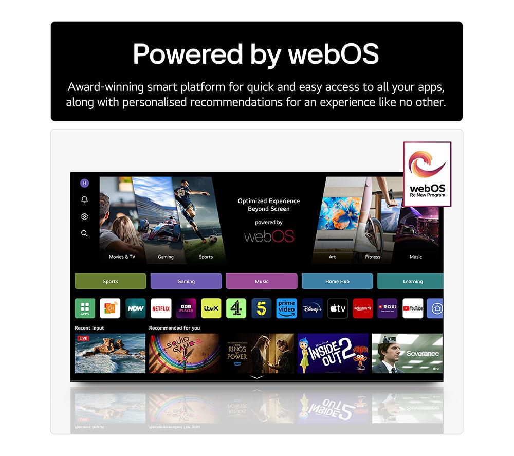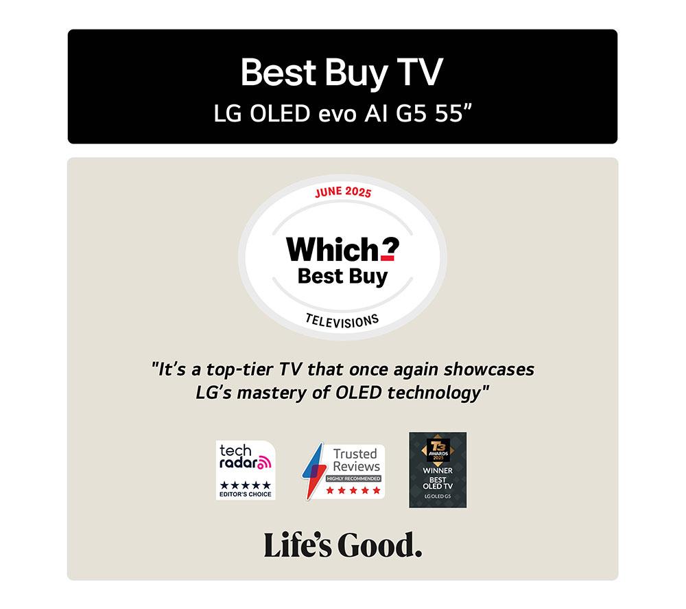 The LG G5 55" TV is designed to look good from every angle. It has an ultra-slim profile so there's nothing to distract you from the self-lit OLED evo display. Because each pixel is individually lit, the contrast is perfectly balanced with 100% colour accuracy and sharp 4K detail. More brightness means a clearer picture. The Brightness Booster Ultimate makes this TV up to 3 x brighter than your average OLED, so you'll see more detail whether it's night or day. The a11 AI processor is the brains behind the beauty. It's LG's most advanced processor yet, with AI Director Processing bringing colours closer to what the filmmaker intended. Good to know - LG's webOS smart platform is packed with apps like Netflix, Disney+, NOW and Apple TV+ - Easily navigate using the AI Magic Remote and change settings with help from the AI Chatbot - Older entertainment is given a new lease of life with AI Super Upscaling - You won't miss a whisper thanks to AI Voice Remastering for clearer dialogue - Filmmaker Mode turns off any picture processing that can make movies look unnatural - Sound flows all around you with Dolby Atmos, making you feel like you're at the heart of the action - Dolby Vision HDR brings more depth to every scene with incredible contrast and vivid colours - Get the most out of your console with support for 4K@165 Hz and gaming tech like FreeSync and G-Sync - AI Sound Pro transforms 2-channel audio into virtual 11.1.2 surround sound for that movie theatre experience ________________________________ Please note: - Some apps & services (including tuner) are only available in the UK. Apps & services may be removed or no longer supported by third party content providers at any time. Some apps & services may not be available at launch and may require a firmware update before becoming available. Some services require an account and/or subscription fee.