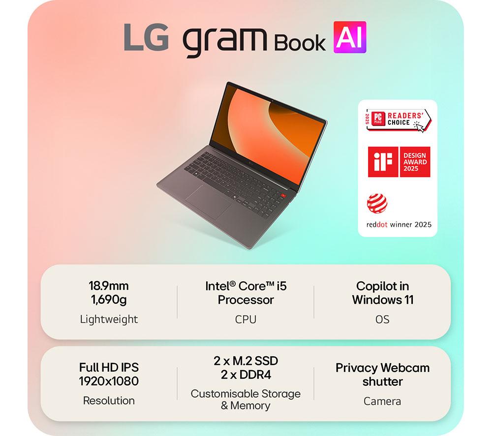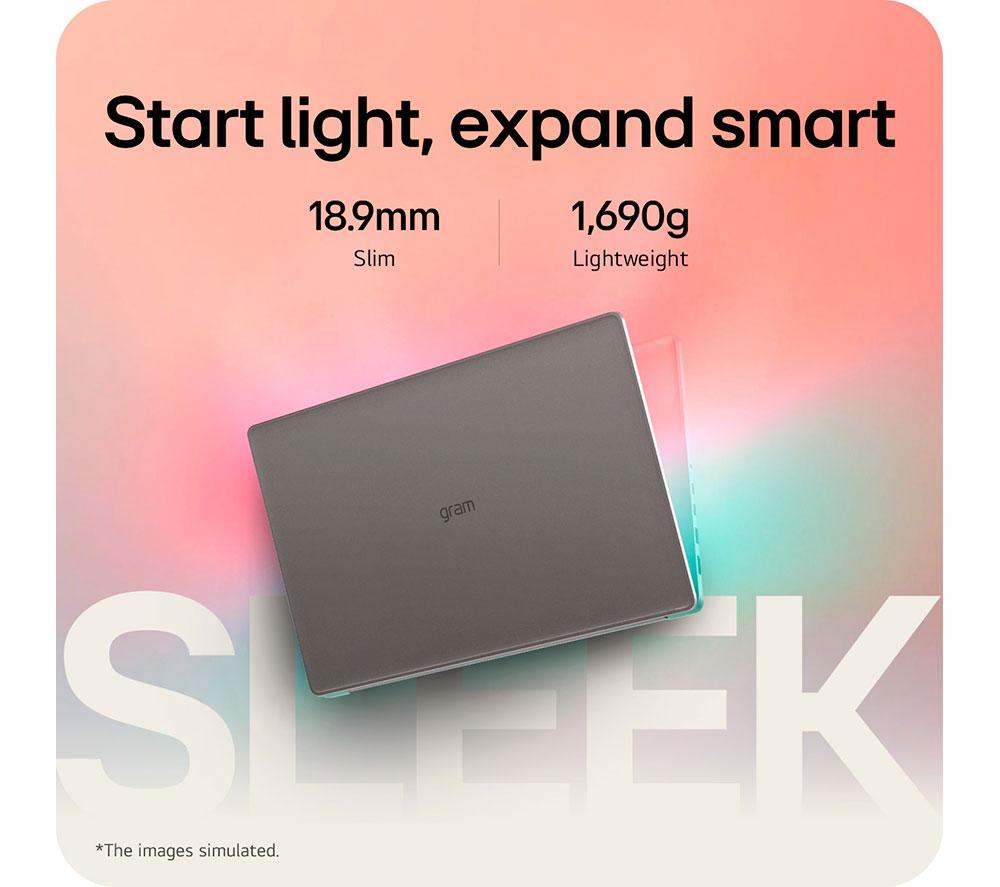 This LG gram is a lightweight heavy hitter that can give any workflow a knockout blow. It's packing an Intel® Core™ i5 processor that won't flinch at everyday tasks. And the integrated Intel® Xe™ graphics gives it an extra kick in creative apps and even games. You'll have all the screen space and resolution you need on the 15.6" Full HD screen. Even with that much power, it only weighs 1.65 kg - perfect for digital nomads. Good to know - Get faster, smarter features with Copilot that works both on device and in the cloud - Fan cooling will keep your gram running smooth under heavy workloads - It comes with Dolby Atmos support, so you can get that 3D surround sound for total movie immersion - 16 GB of DDR4 RAM is ready to take on serious multi-tasking - The 512 GB SSD drive is great if you want to store high-res pics and videos offline - You can upgrade the SSD and RAM down the line for more storage or faster multi-tasking - LG gram Link can easily link up to 10 devices, even iPhones and Androids - The IPS display provides amazing colours and wide viewing angles - WiFi 6 means super-fast internet connection __________________________________________________________________________ Intel, the Intel logo, Celeron, Intel Atom, Intel Core, Intel. Experience What's Inside, Intel Inside, the Intel Inside logo, Intel Unite, Iris, Pentium, Thunderbolt, the Thunderbolt logo, and Ultrabook are trademarks of Intel Corporation in the U.S. and/or other countries.