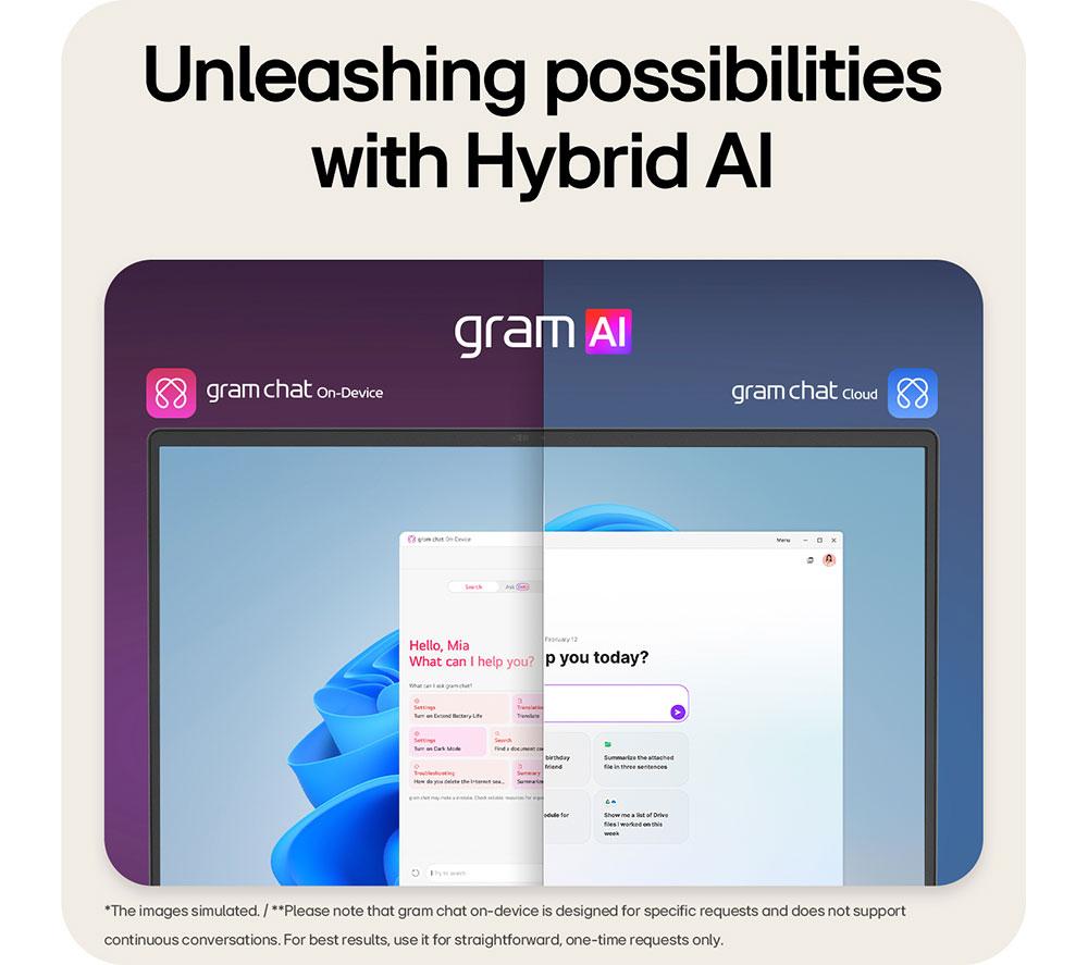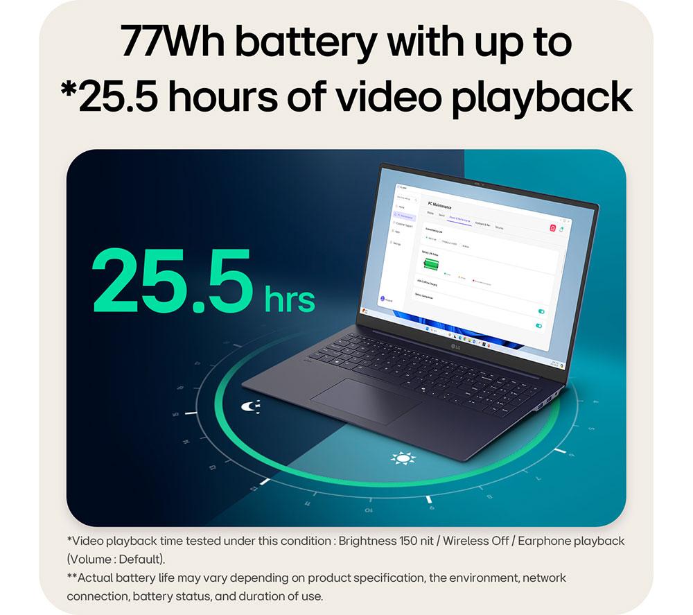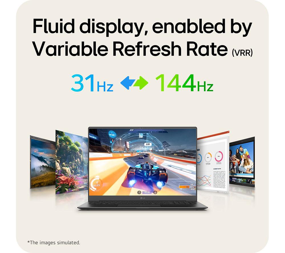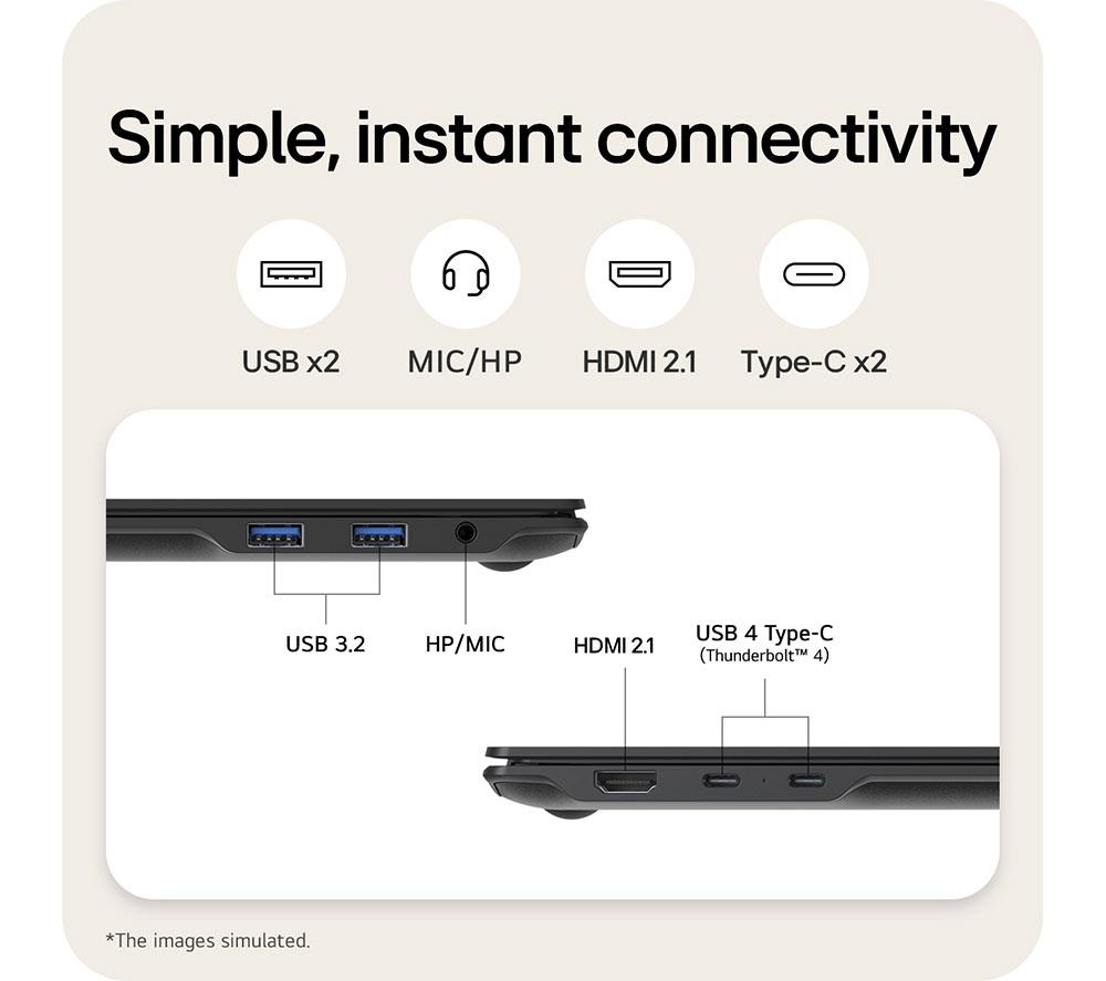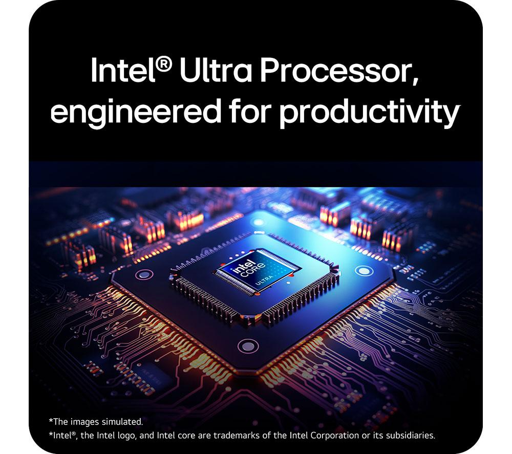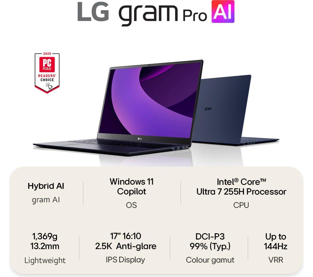 The LG gram Pro is a lightweight heavy hitter that can give any workflow a knockout blow. It's got an Intel® Core™ Ultra 7 processor that won't flinch at heavy-duty tasks. Supercharged by AI, this one gives you some impressive speed and high performance. While the integrated Intel® Arc™ graphics adds extra boost for creative apps and gaming. You'll have all the screen space and resolution you need on the 17" 2.5K screen. Even with that much power, it only weighs 1.3 kg – perfect for digital nomads. And it can take a punch, too. The gram went through military-grade durability testing and passed with flying colours. So you can be sure it can handle living in your backpack. Good to know - The variable refresh rate adjusts to your content between 31 and 144 Hz - The Intel® Evo™ platform brings together premium technologies for an exceptional performance - It has a 22 hour battery life, so you won't need be needing a socket anytime soon - With 32 GB of DDR5 RAM, this one is ready to take on some serious multi-tasking - The magnesium body makes the gram Pro lightweight and it gives it a premium feel - Save all your high-res pics and videos offline – it has 1 TB of storage - It comes with Dolby Atmos support, so you can get that 3D surround sound for total movie immersion - There's a dedicated Copilot key that brings up the latest and greatest AI tools - The Full HD webcam supports Windows Hello, so you can log in with just a smile - Use the Thunderbolt 4 ports to hook your gram up to high-res monitors or super-fast SSDs __________________________________________________________________________ Intel, the Intel logo, Celeron, Intel Atom, Intel Core, Intel. Experience What's Inside, Intel Inside, the Intel Inside logo, Intel Unite, Iris, Pentium, Thunderbolt, the Thunderbolt logo, and Ultrabook are trademarks of Intel Corporation in the U.S. and/or other countries.