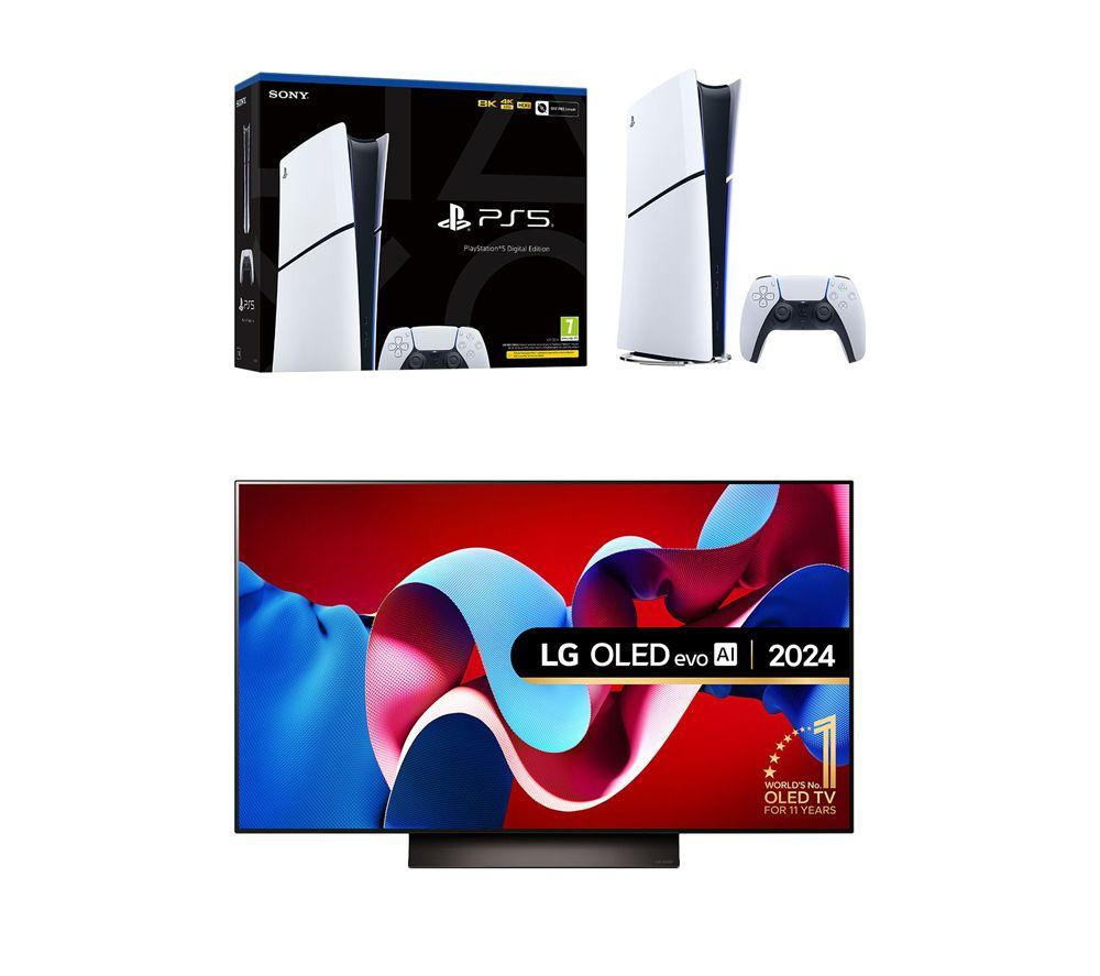 Kick back and dive into epic virtual adventures with this OLED42C44LA 48" Smart 4K Ultra HD HDR OLED TV & PlayStation 5 (Model Group - Slim) Bundle. ________________________________________________________________________________________ LG OLED42C44LA 48" Smart 4K Ultra HD HDR OLED TV When was the last time your TV made you go ‘wow'? This LG C4 OLED TV uses self-lit pixels for perfect blacks and brilliant highlights – it's pretty magical. You'll be able to pick out every star in a night sky – and because there's no backlight, there's no annoying halos either. The a9 AI processor is the brain of the TV. It's hard at work in the background, upscaling the picture and audio of everything you watch. Even older entertainment is given a new lease of life with AI Super Upscaling. Speaking of entertainment, you'll be spoilt for choice. There's something for the whole family on webOS, LG's smart platform which includes Netflix, Disney+ and a whole lot more. Good to know - Filmmaker Mode turns off any picture processing that can make movies look unnatural, so it's closer to cinema-quality - Sound flows all around you with Dolby Atmos, making you feel like you're at the heart of the action - Dolby Vision HDR brings more depth to every scene with incredible contrast and vivid colours - Get the most out of your next-gen console with support for 4K@144 Hz and more gaming tech than you can shake a controller at - It looks great in any room thanks to its stunningly thin and light design - OLED Motion makes fast paced sports and movies look smooth, so it's easy to keep up with the action - AI Sound Pro transforms 2-channel audio into virtual 9.1.2 surround sound for that movie theatre experience ________________________________________________________________________________________ Sony PlayStation 5 Digital Edition (Model Group - Slim) The new PS5 is slimmed down, but it's still just as fast. It's 24% lighter and 30% smaller than the original – so now it actually might fit in that tight spot under the telly. And even though it's little, it still packs a punch. Jump in with shiny 4K Ultra HD graphics at up to 120 fps for silky-smooth life-like action. There's a chunkier 1 TB SSD too, which gives you loads of space for your favourite titles. An extra USB-C port lets you charge a couple of controllers at once, so you're ready for some couch co-op. Good to know - If you want to start playing physical games down the line, you can just add the Ultra HD Blu-ray Disc Drive (sold separately) - The DualSense controller uses haptic feedback and adaptive triggers that make you feel part of the game - Ray tracing and HDR support bring every scene to life with hyper-realistic lighting and vivid colours - 3D audio puts you in the thick of the action whether you've got a headset or use your TV speakers - PlayStation Plus subscription lets you team up with friends and battle millions of players worldwide ___________________________________________________________________________ Please note: Some apps & services (including tuner) are only available in the UK. Apps & services may be removed or no longer supported by third party content providers at any time. Some apps & services may not be available at launch and may require a firmware update before becoming available. Some services require an account and/or subscription fee.